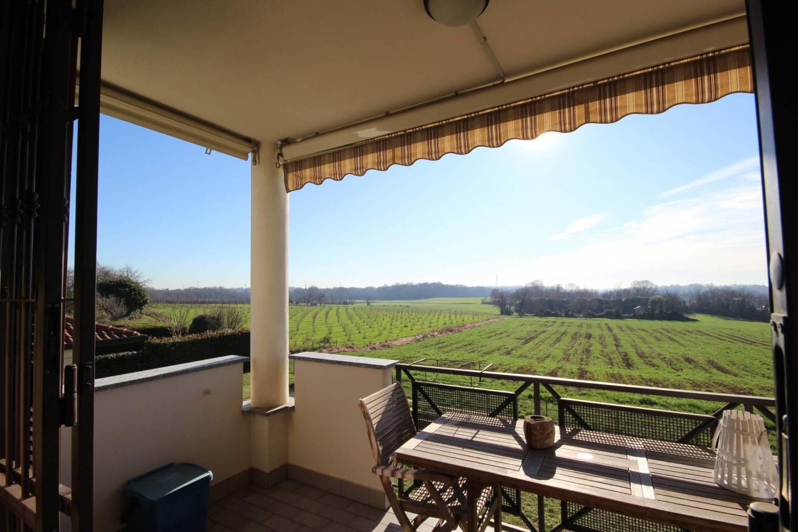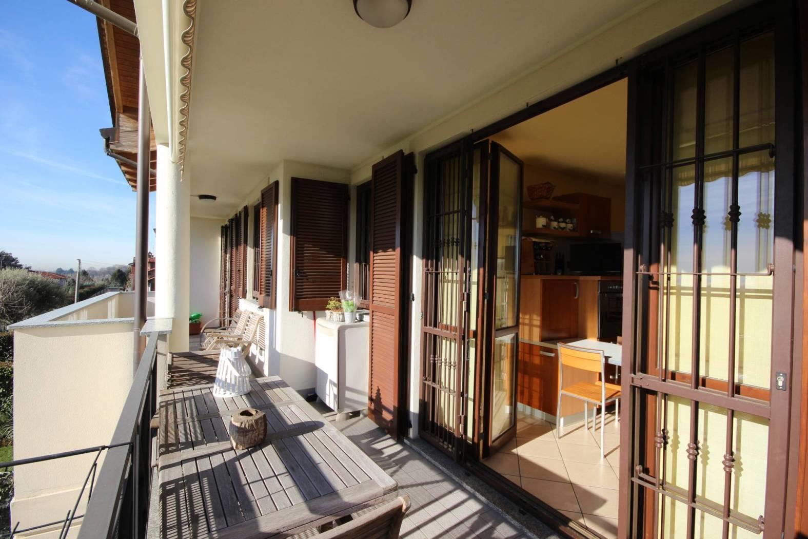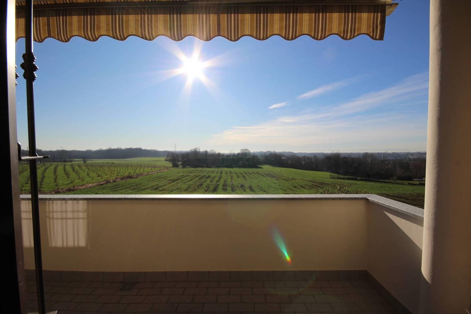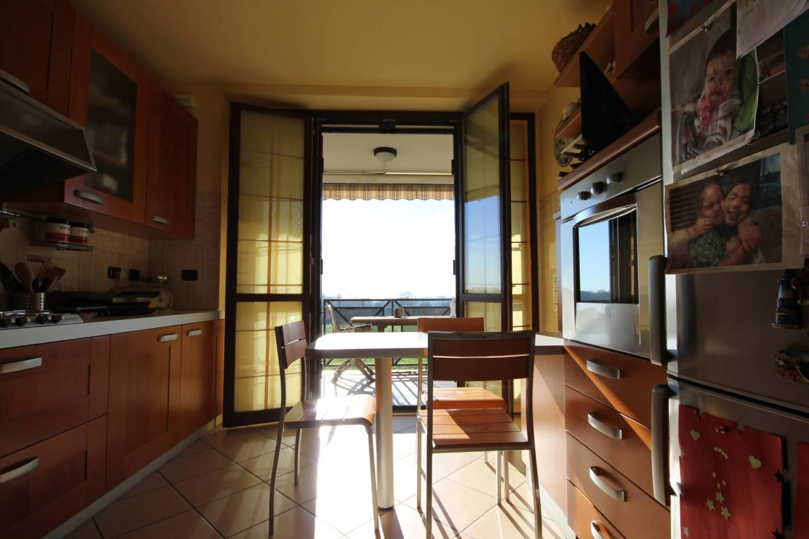 Ingresso nel luminoso soggiorno che si apre all'ampio terrazzo con vista aperta sul Bosco del Chignolo, disimpegno, bagno e cucina abitabile con uscita sul terrazzo.