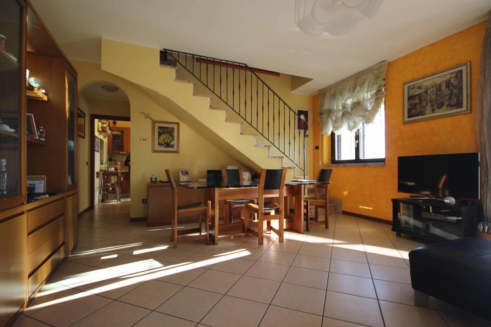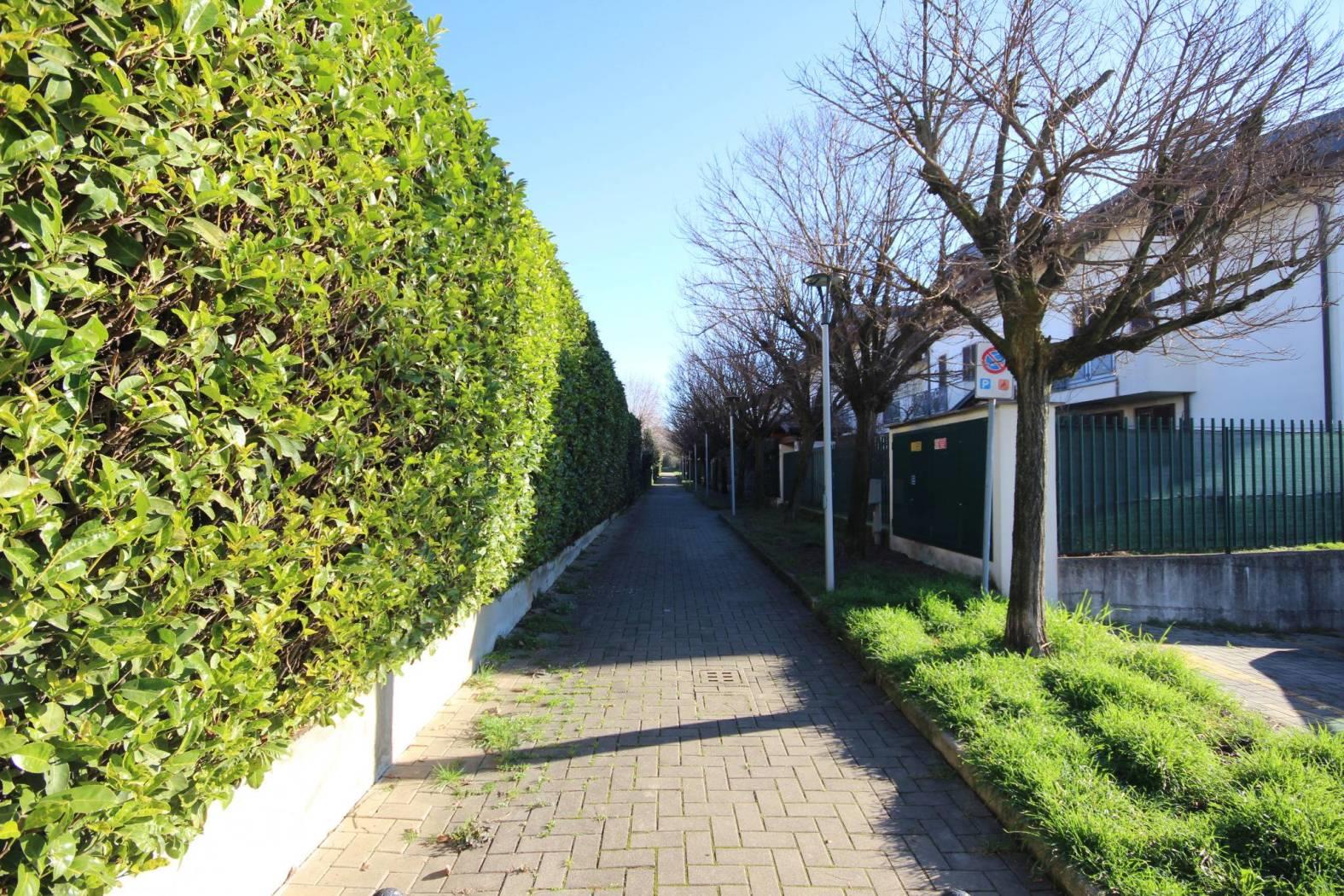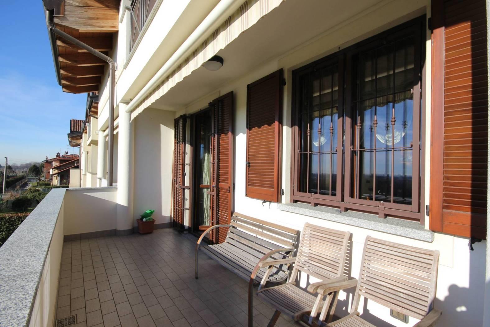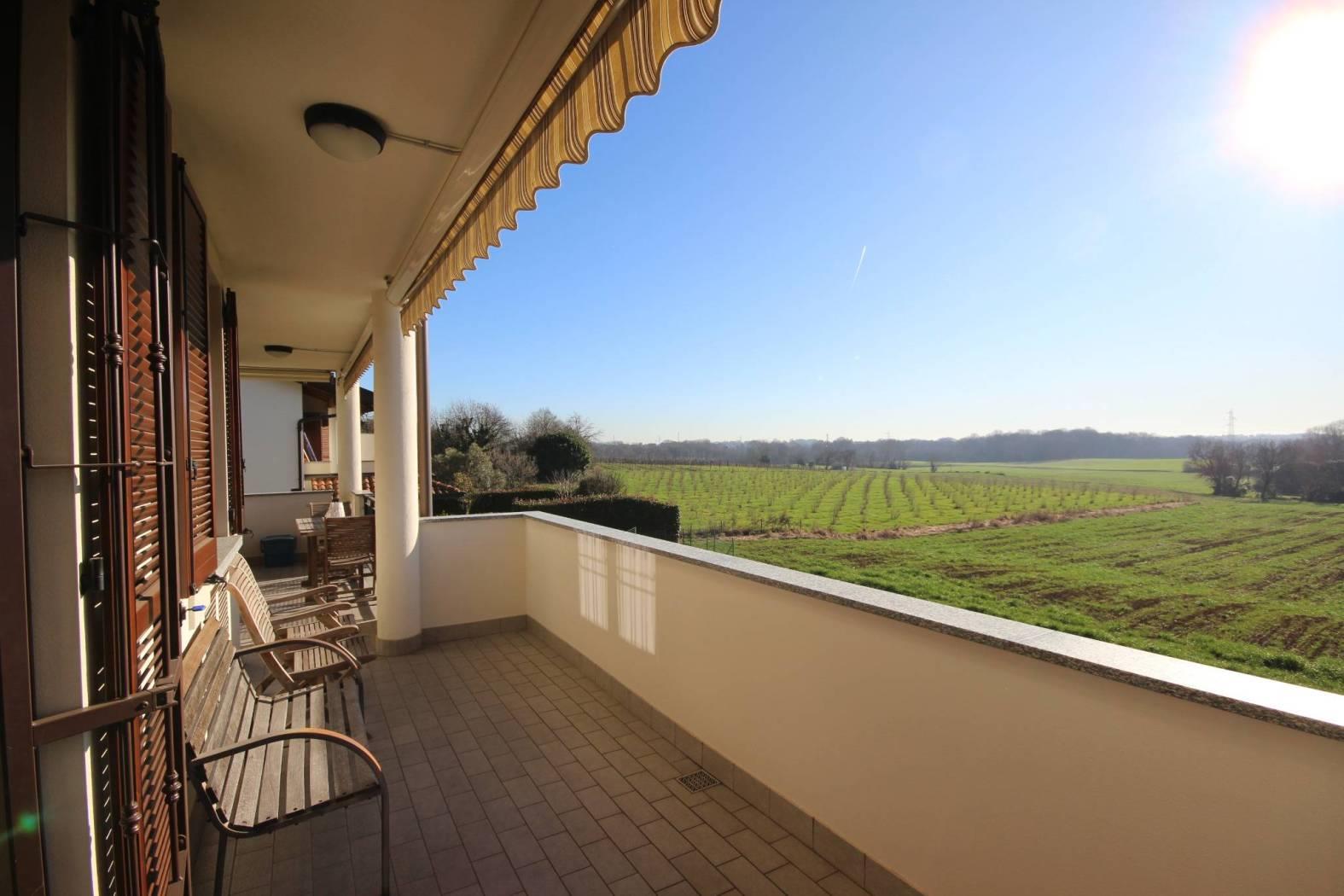 Ingresso nel luminoso soggiorno che si apre all'ampio terrazzo con vista aperta sul Bosco del Chignolo, disimpegno, bagno e cucina abitabile con uscita sul terrazzo.