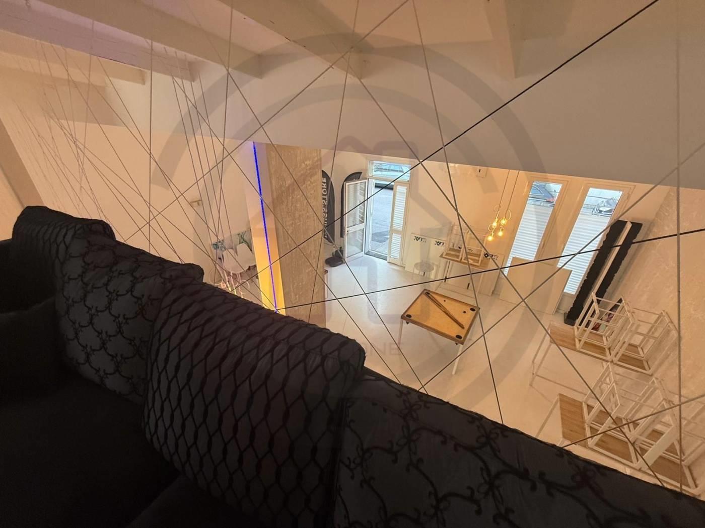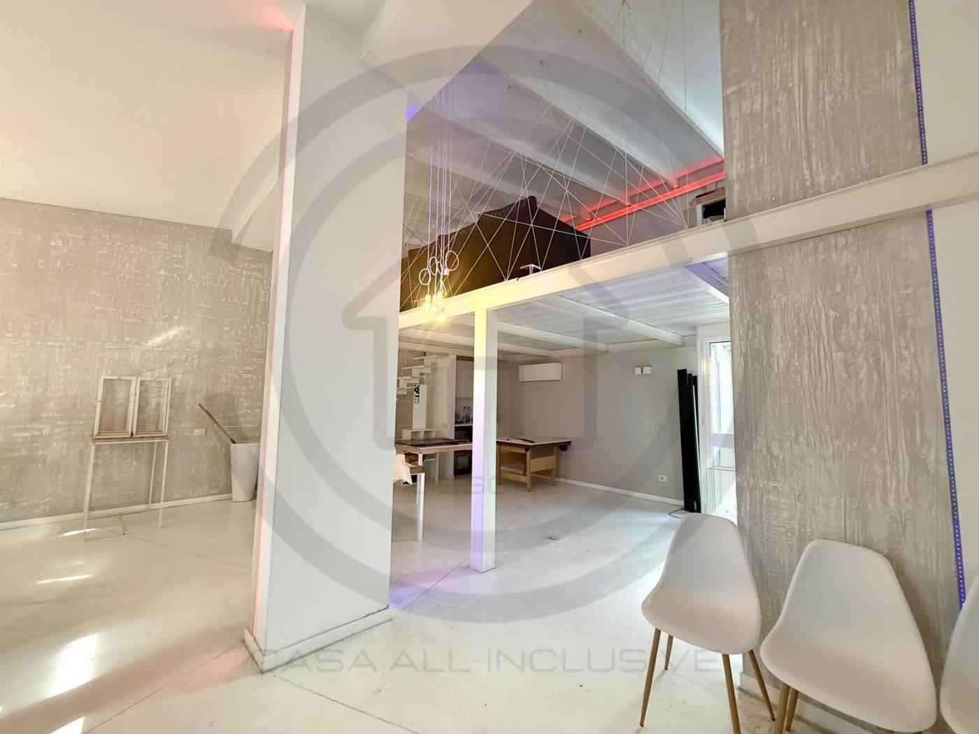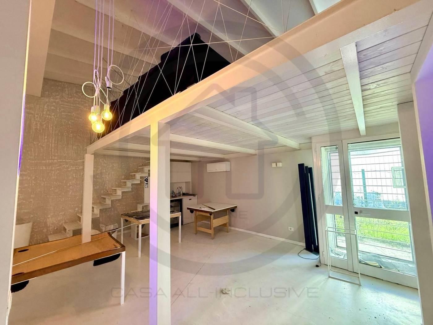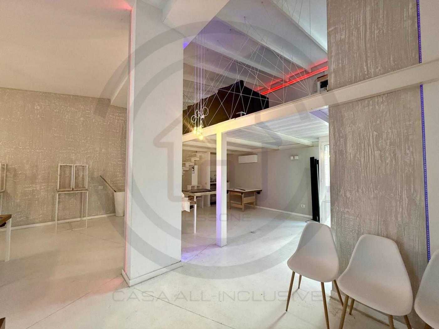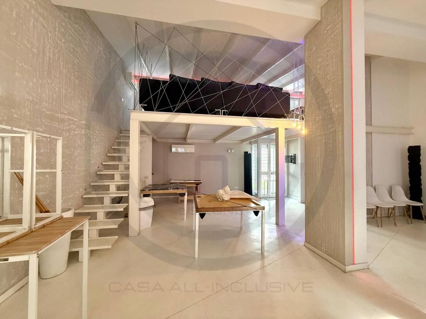 La soluzione posta al piano terra, e' composta da un open space di 80 mq circa, con un bagno al piano completo di sanitari e DOCCIA, tramite comodissima scala di DESIGN si accede alla zona del SOPPALCO, di 30 mq circa, dove e' stata ricavata una zona LIVING CON CUCINA completa di tutto il necessario.