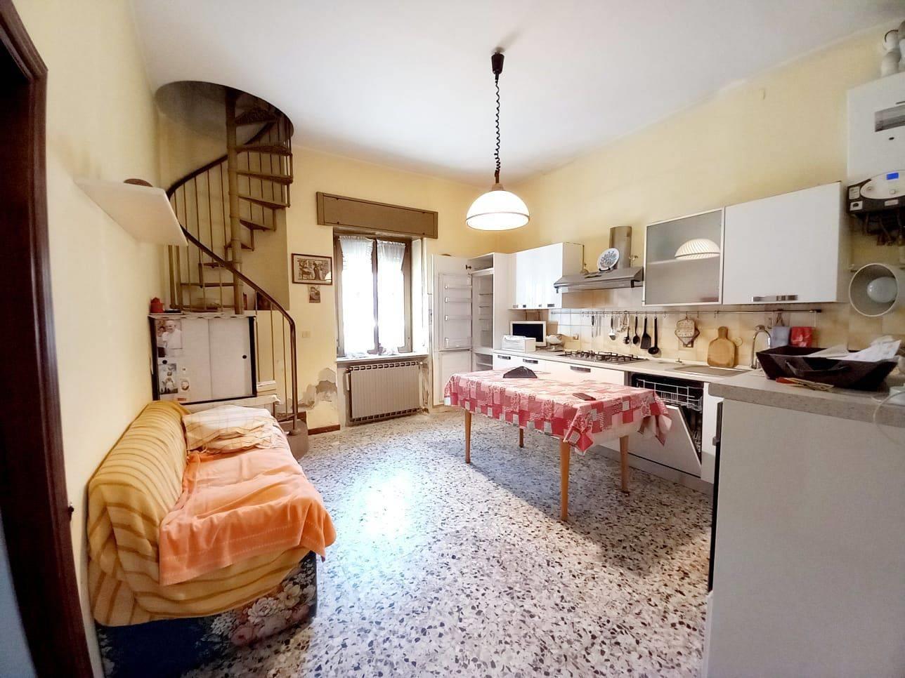 La cucina si collega al piano superiore tramite una scala a chiocciola dove si trovano due ampie camere da letto, un balcone e il bagno.