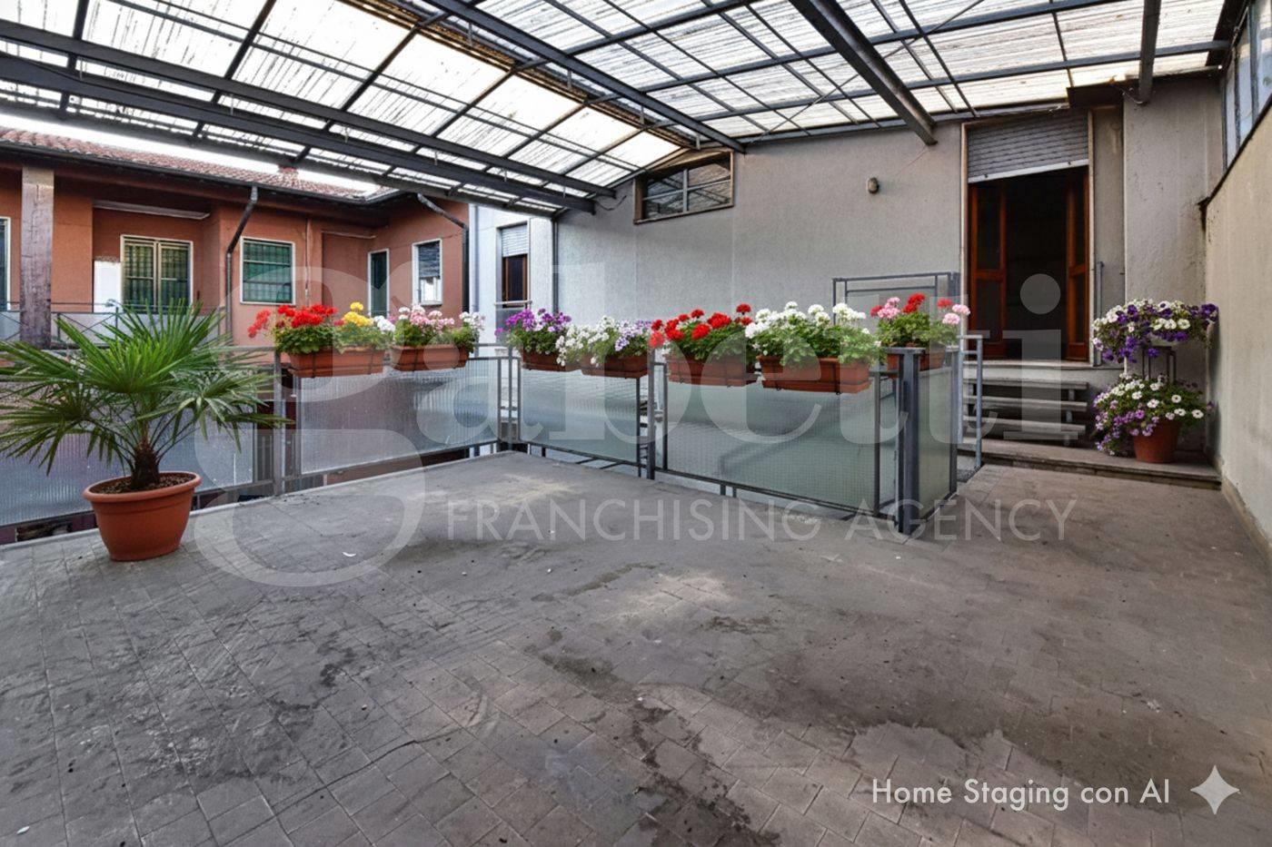ARCORE/CENTRO: palazzina terra-tetto DA RISTRUTTURARE (epoca di costruzione risalente ai primi anni Settanta), su due piani (terra e primo) dalla doppia esposizione e dalla superficie distribuita come segue. PIANO TERRA – NEGOZIO fronte strada a due luci di circa 105 mq con retro negozio e bagno; cortile di circa mq. 105 e due locali rustici di circa 100 mq; PIANO PRIMO - 1) BILOCALE (di circa 95 mq) composto da ingresso living sul soggiorno (con antistante terrazzo coperto di ca 30 mq), cucina abitabile, disimpegno, bagno, camera matrimoniale con terrazzo di ca 30 mq; TRILOCALE (di circa 125 mq) composto da ingresso living sull’ampia cucina abitabile, soggiorno in aggetto sulla balconata, due camere (di cui una sul terrazzo e l’altra sulla balconata), bagno finestrato e vano scala di collegamento al sottotetto (al trilocale è annesso altresì il piano cantinato di circa 60 mq di superficie, dal caratteristico soffitto a botte in mattoni a vista).
