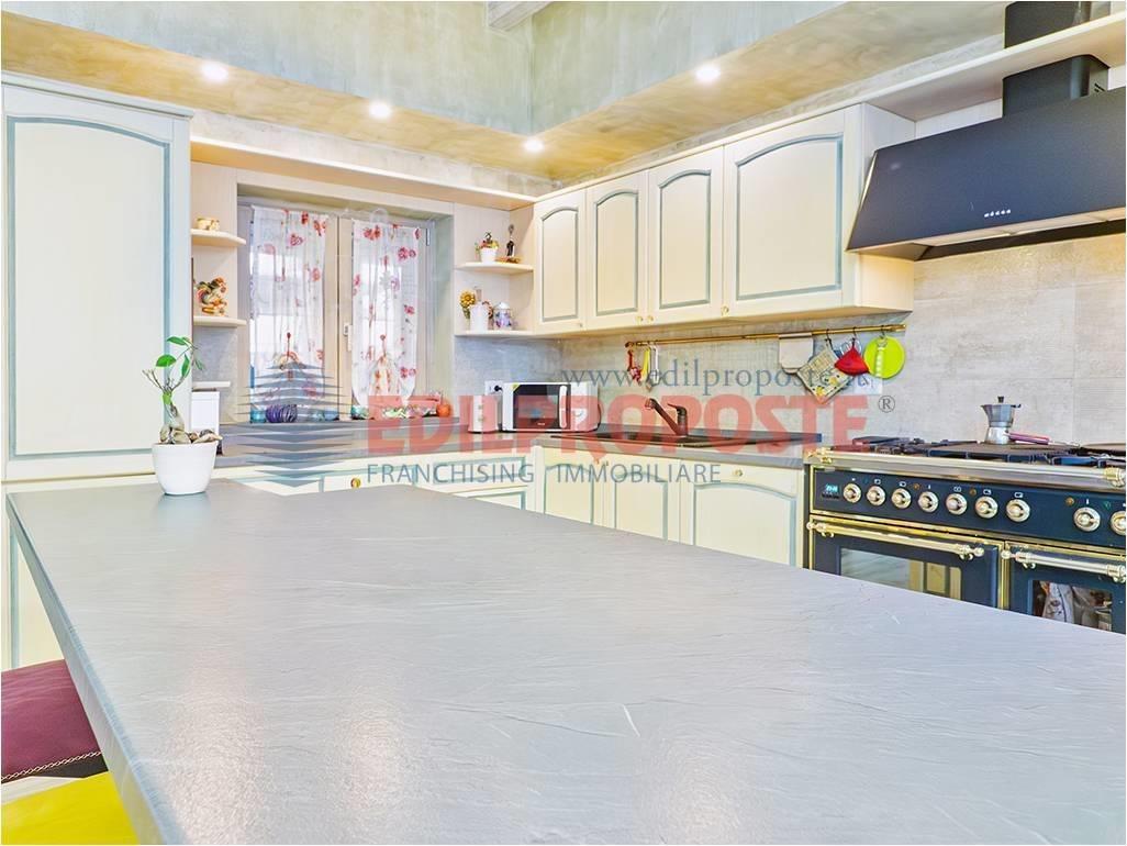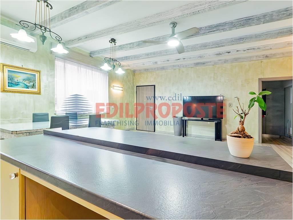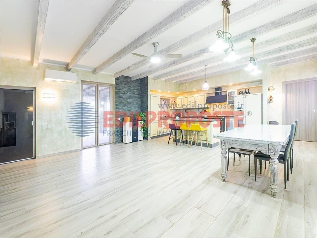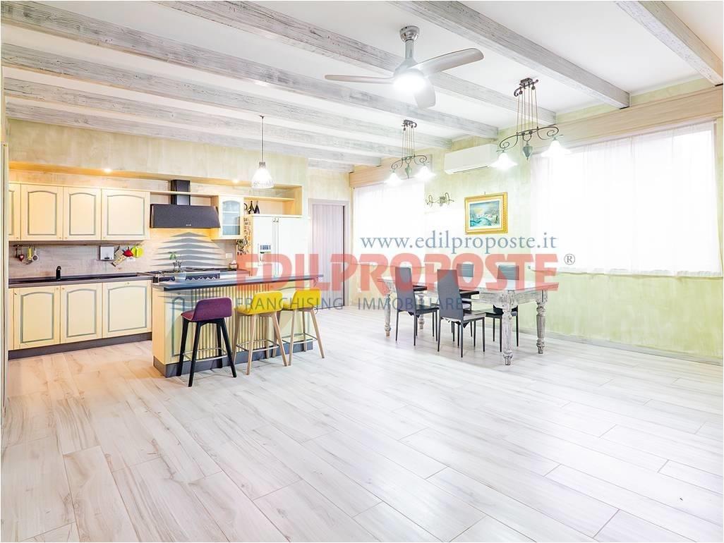 Soggiorno con cucina di ampia metratura, luminoso, con porte e finestre affacciate sul portico interno.