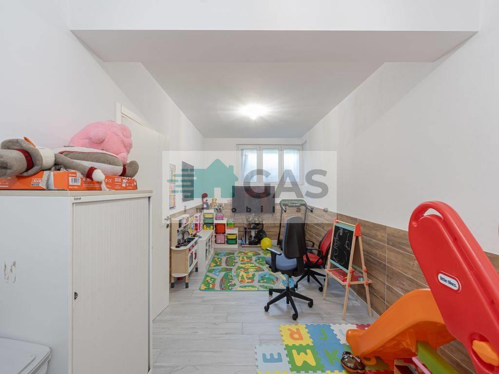 Il livello seminterrato accoglie un ampio salone con cucina a vista, ideale per momenti conviviali. Sono presenti inoltre un bagno, una lavanderia, una zona attualmente adibita a palestra e un locale studio/gioco, tutti spazi facilmente adattabili alle proprie esigenze. Dal seminterrato si accede a un affaccio sul retro, tranquillo e con vista sul verde.