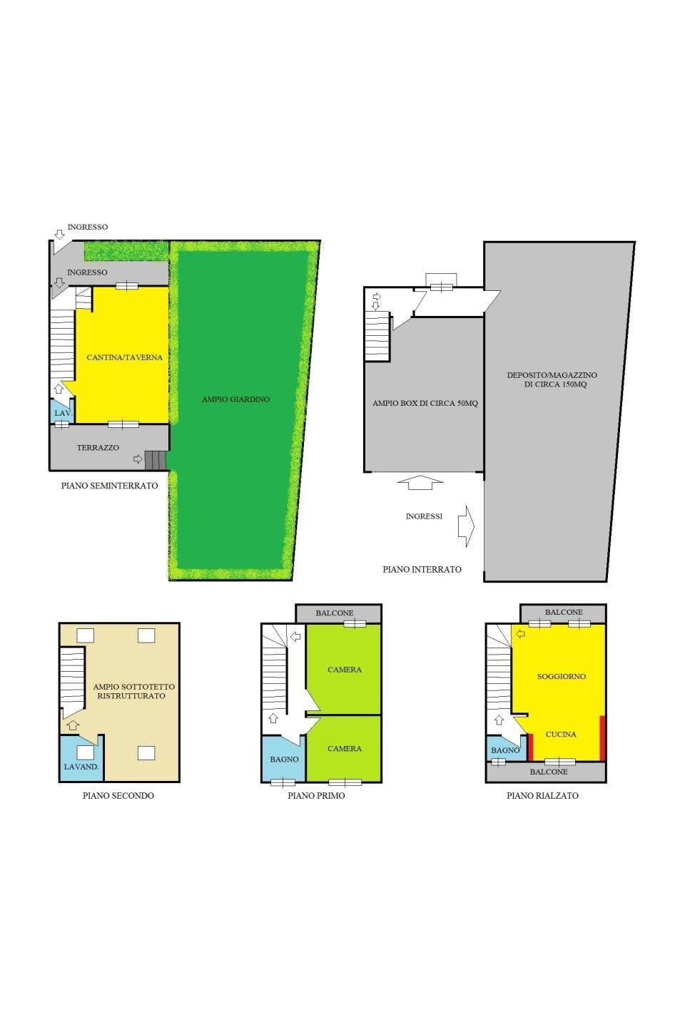 La distribuzione degli spazi è ottimale: al piano seminterrato si trova un’accogliente cantina rifinita ad uso taverna, con lavanderia e accesso diretto al terrazzo che collega al giardino. Al piano rialzato la zona giorno si presenta come un luminoso open space con ampio soggiorno e cucina a vista, arricchito da balcone e bagno di servizio. Al primo piano la zona notte ospita una camera matrimoniale con balcone, una seconda camera di generose dimensioni e un bagno con vasca idromassaggio. Il secondo piano è occupato da una mansarda open space, versatile e luminosa, ideale come ulteriore zona notte, studio o sala hobby, completa di bagno/lavanderia. Infine, al piano interrato, oltre al locale tecnico, si trovano il box triplo e l’ampio magazzino/deposito con ingresso indipendente.