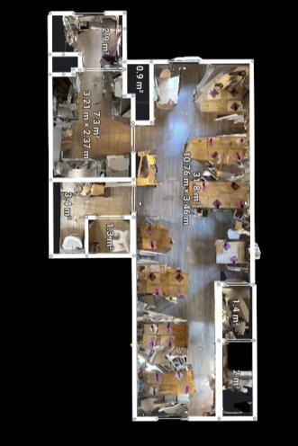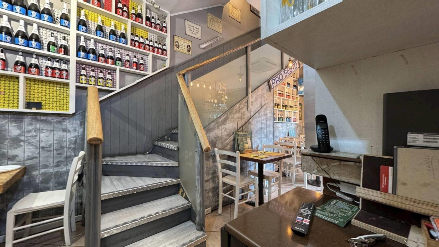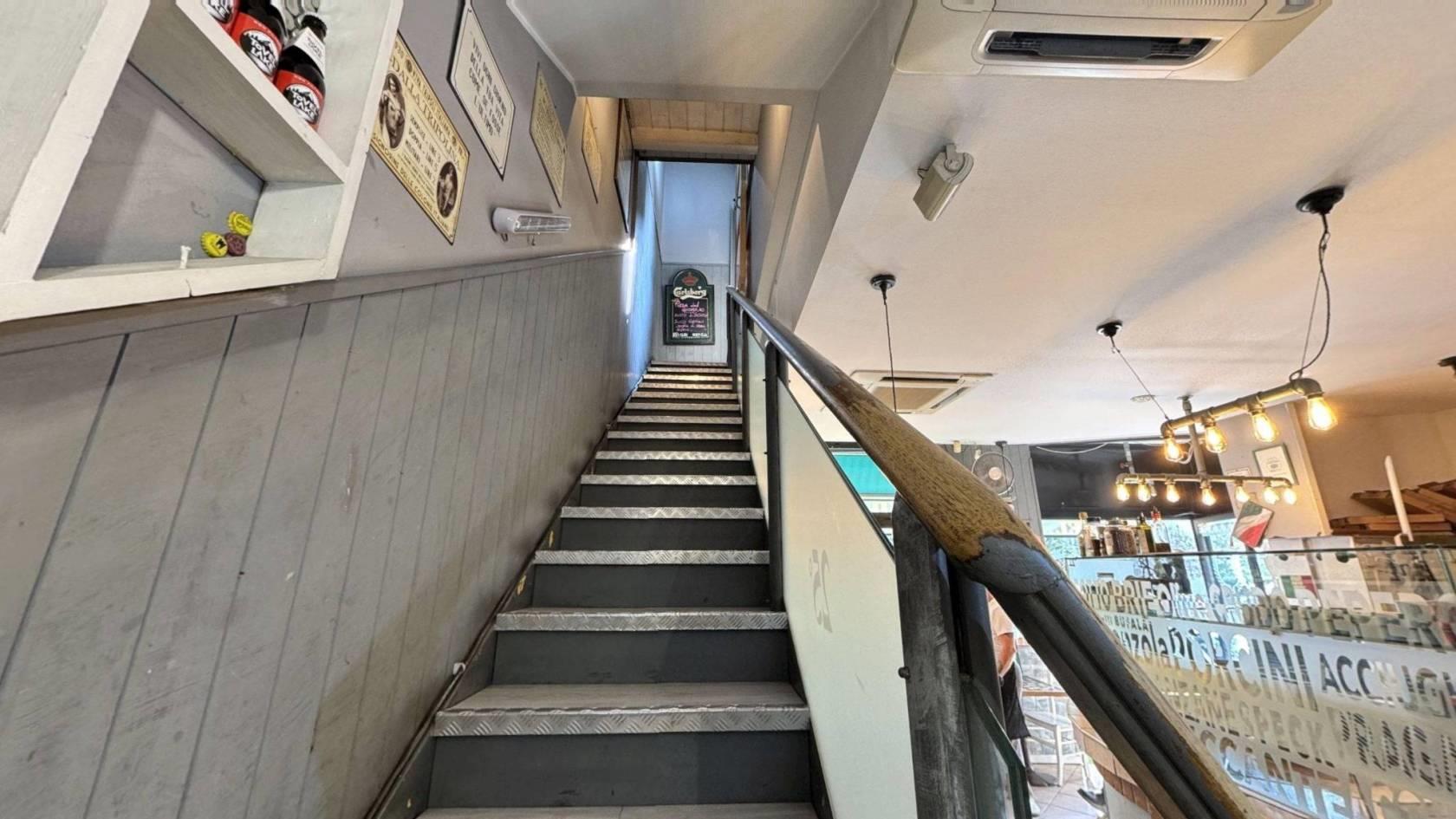 Dal piano terra, una scala ampia e funzionale conduce al piano superiore, un ambiente unico e luminoso, oggi utilizzato come seconda sala per i clienti, completo di cucina e di un ulteriore bagno.