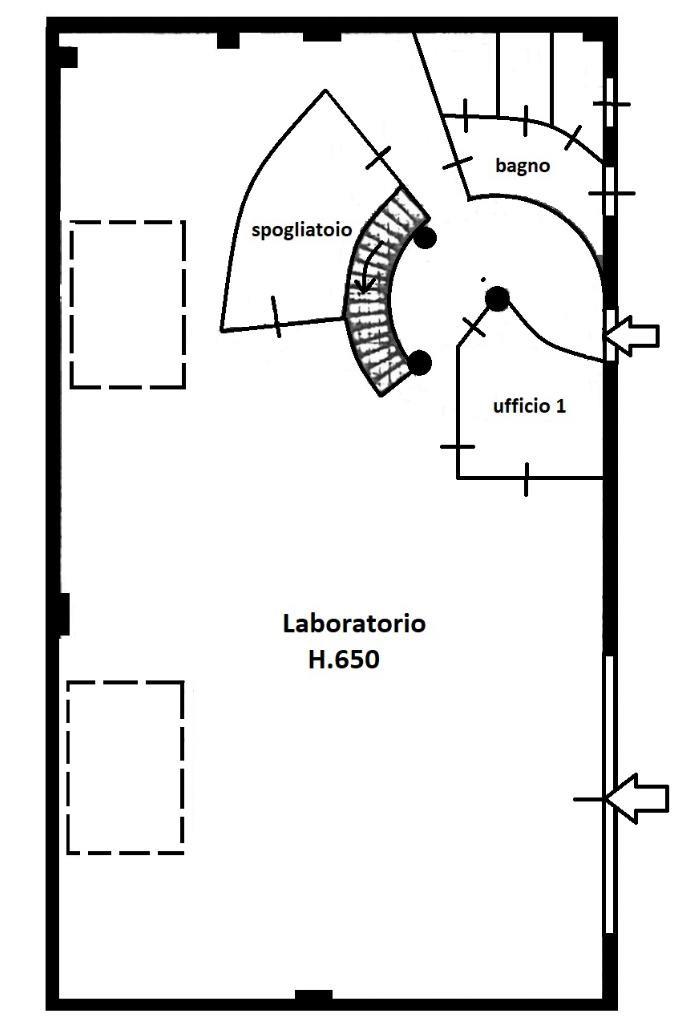 Il laboratorio è composto da un piano terra di 235 mq. con laboratorio, un ufficio e pluriservizi.