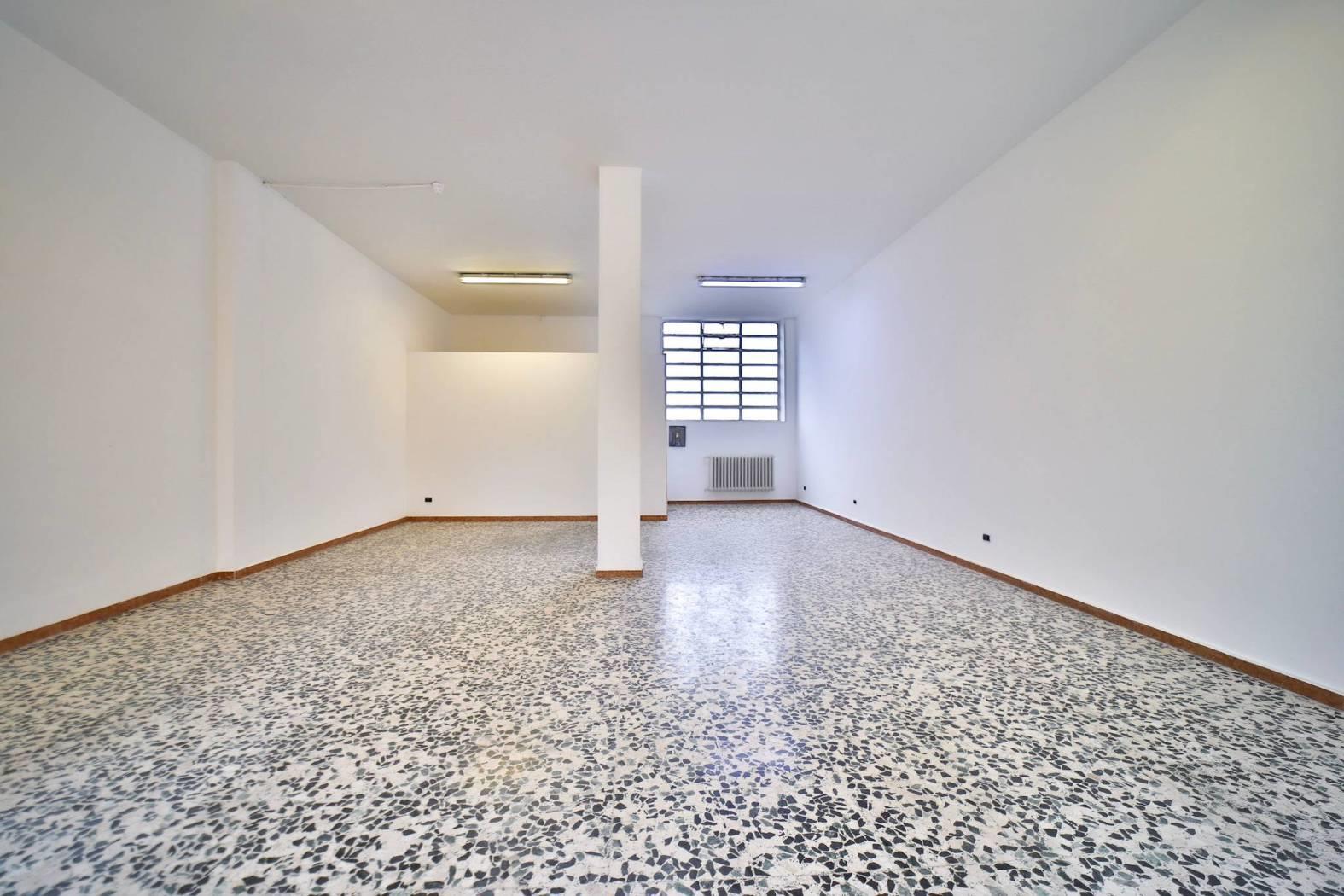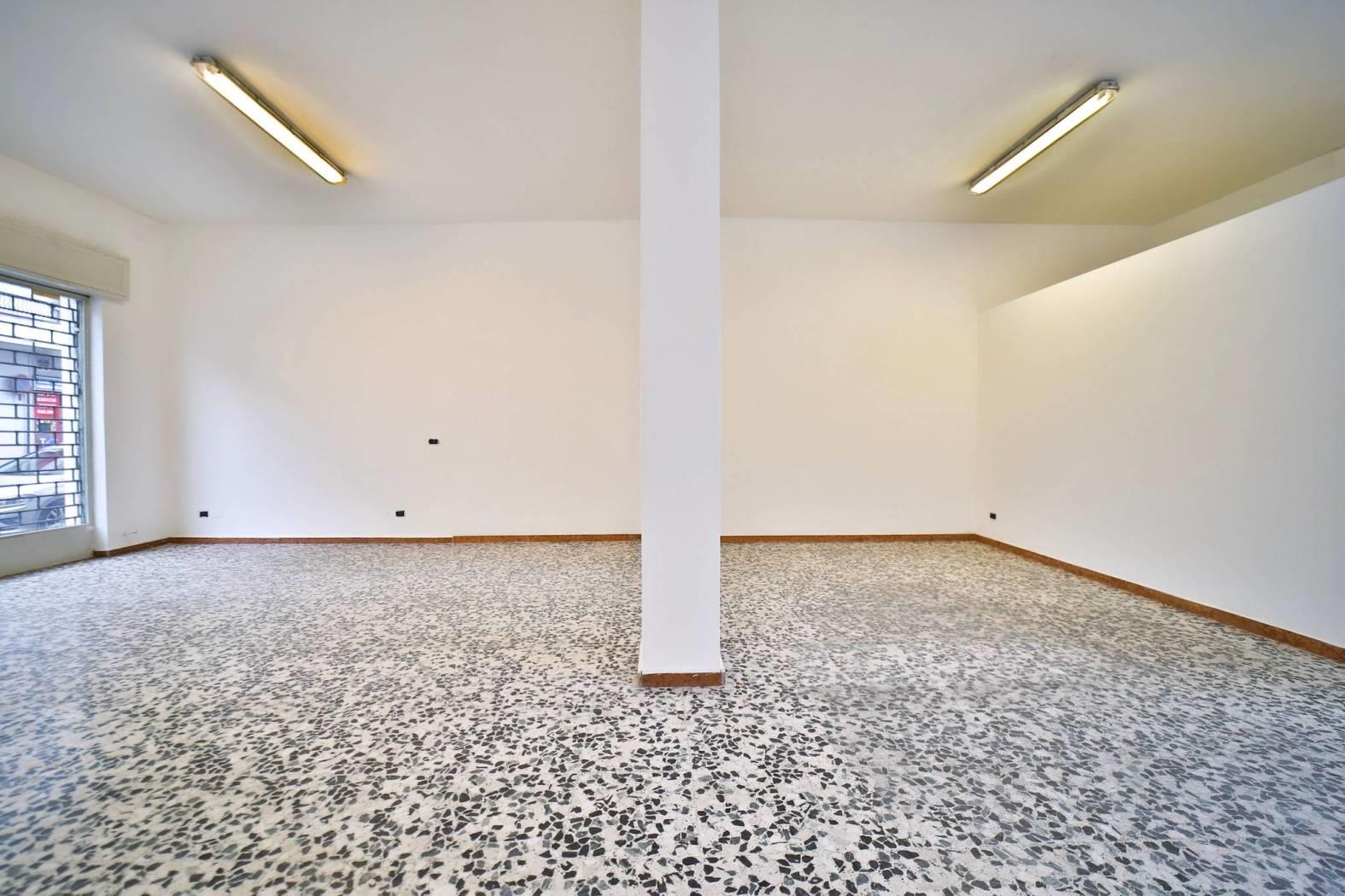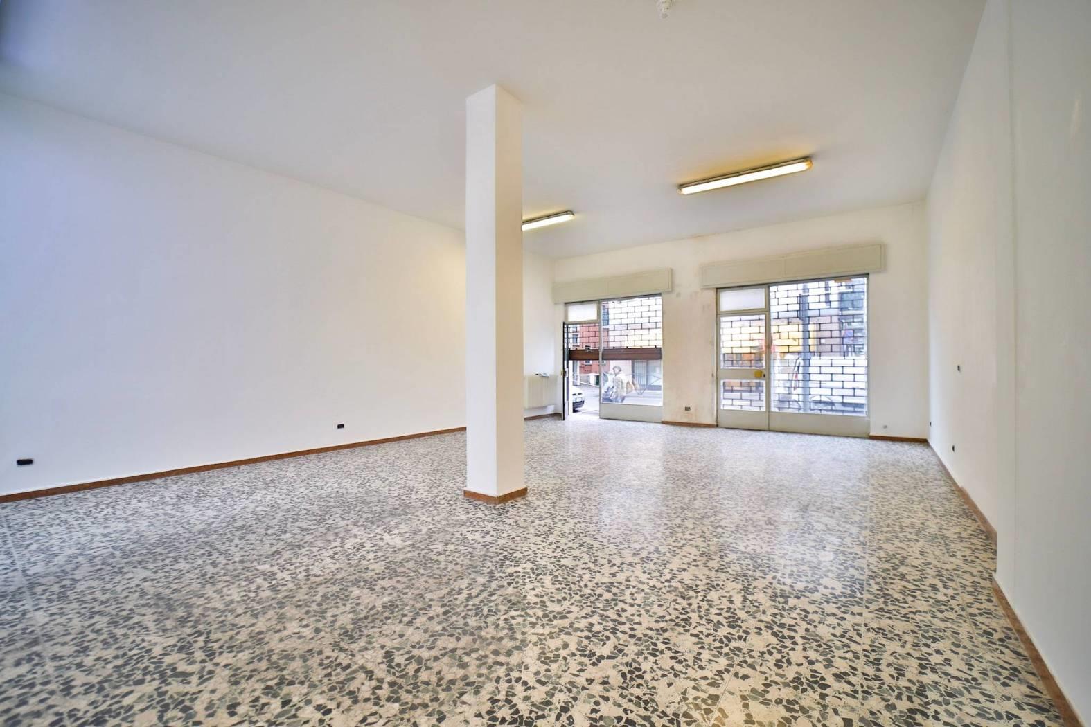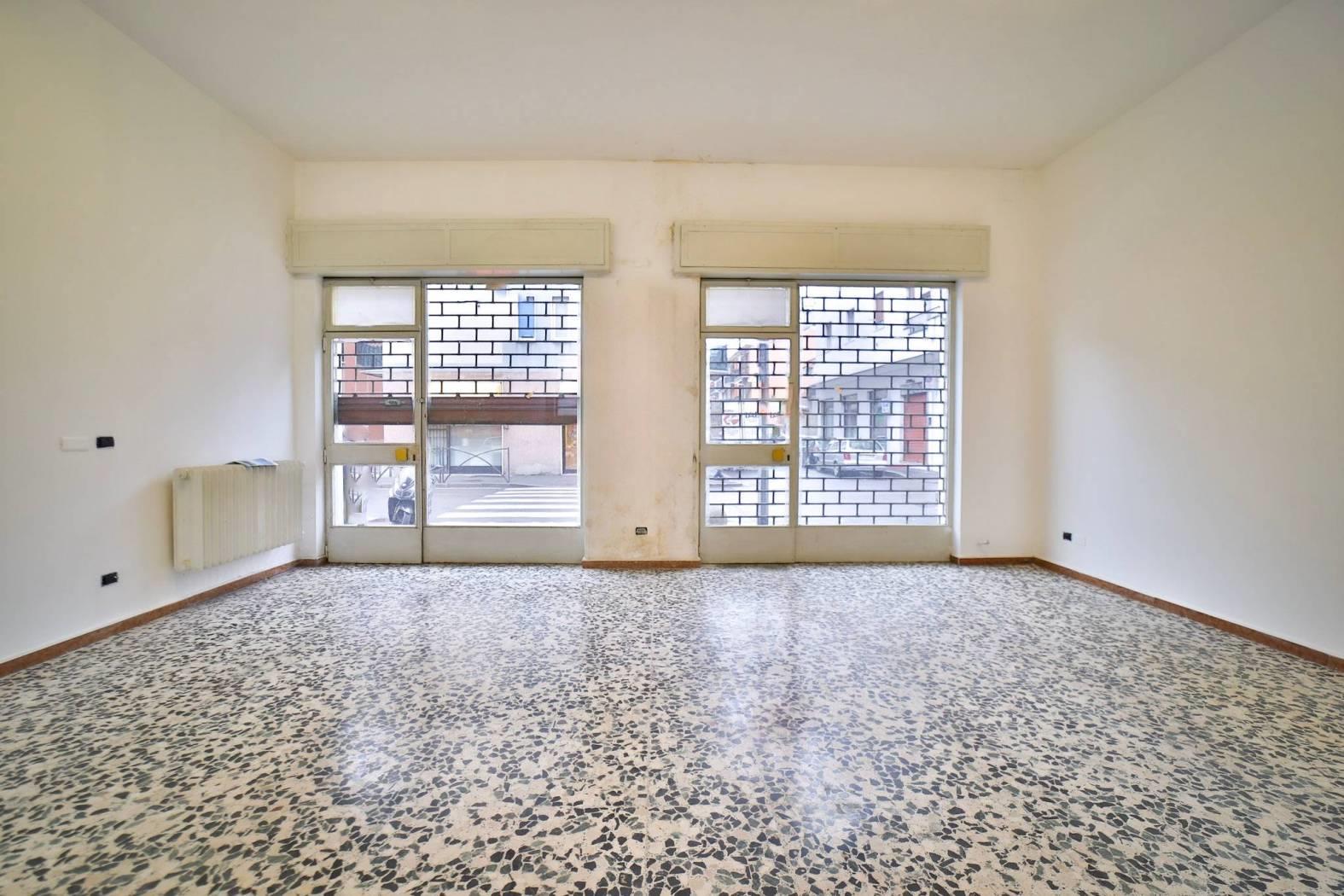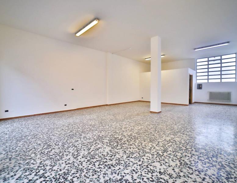 L’immobile è inserito in un edificio risalente indicativamente agli anni ’60-’70 e dispone di due ampie vetrine fronte strada che garantiscono un’eccellente visibilità. Gli spazi interni si articolano in un ampio locale open space con retro, antibagno e bagno finestrato. Le finiture sono di buona qualità con pavimentazione in graniglia e infissi in alluminio. L’immobile è attualmente privo di impianto di riscaldamento ed è libero subito.