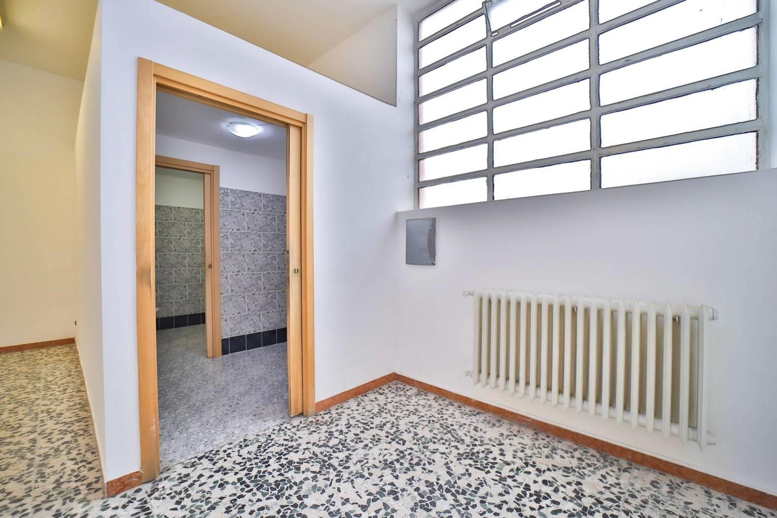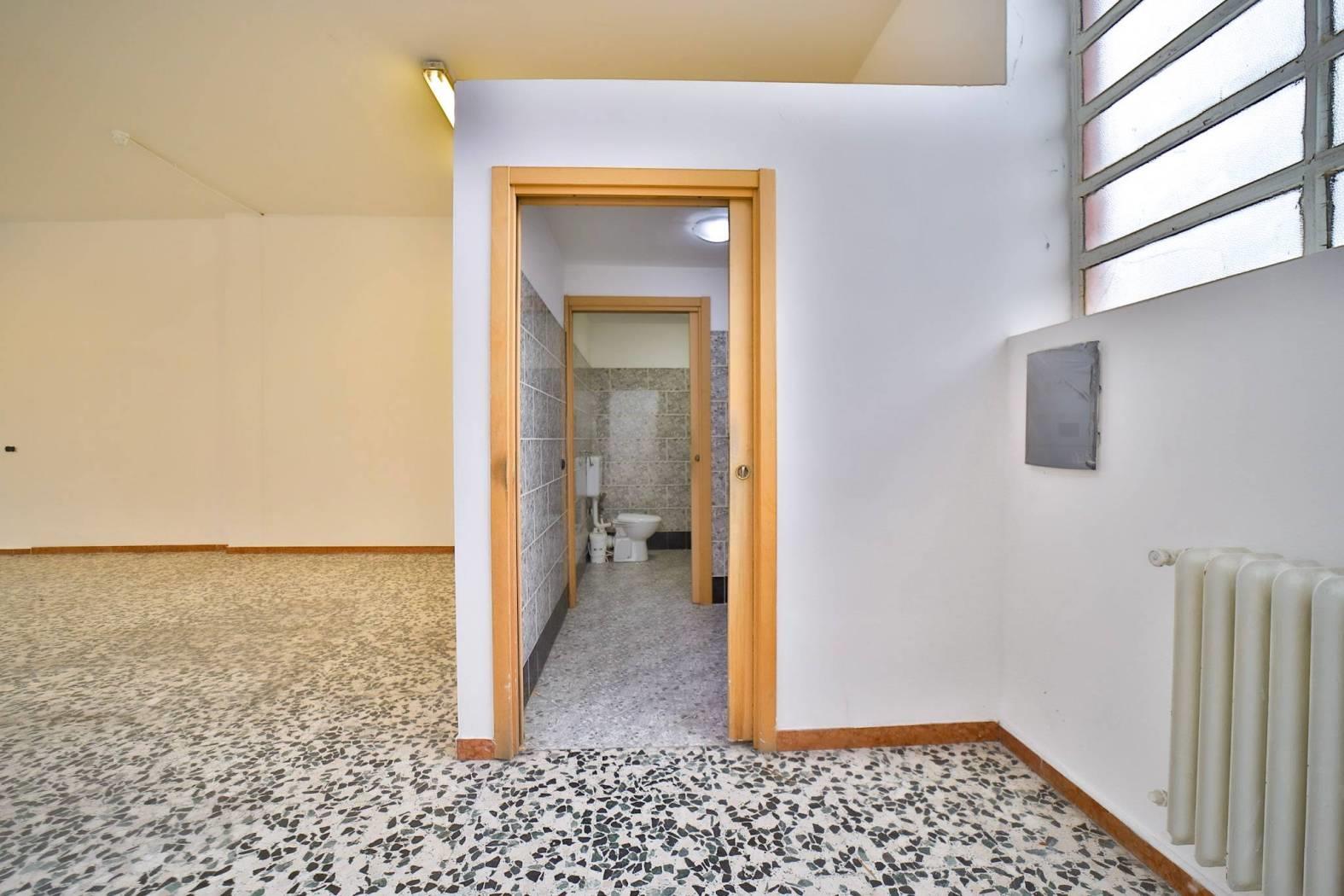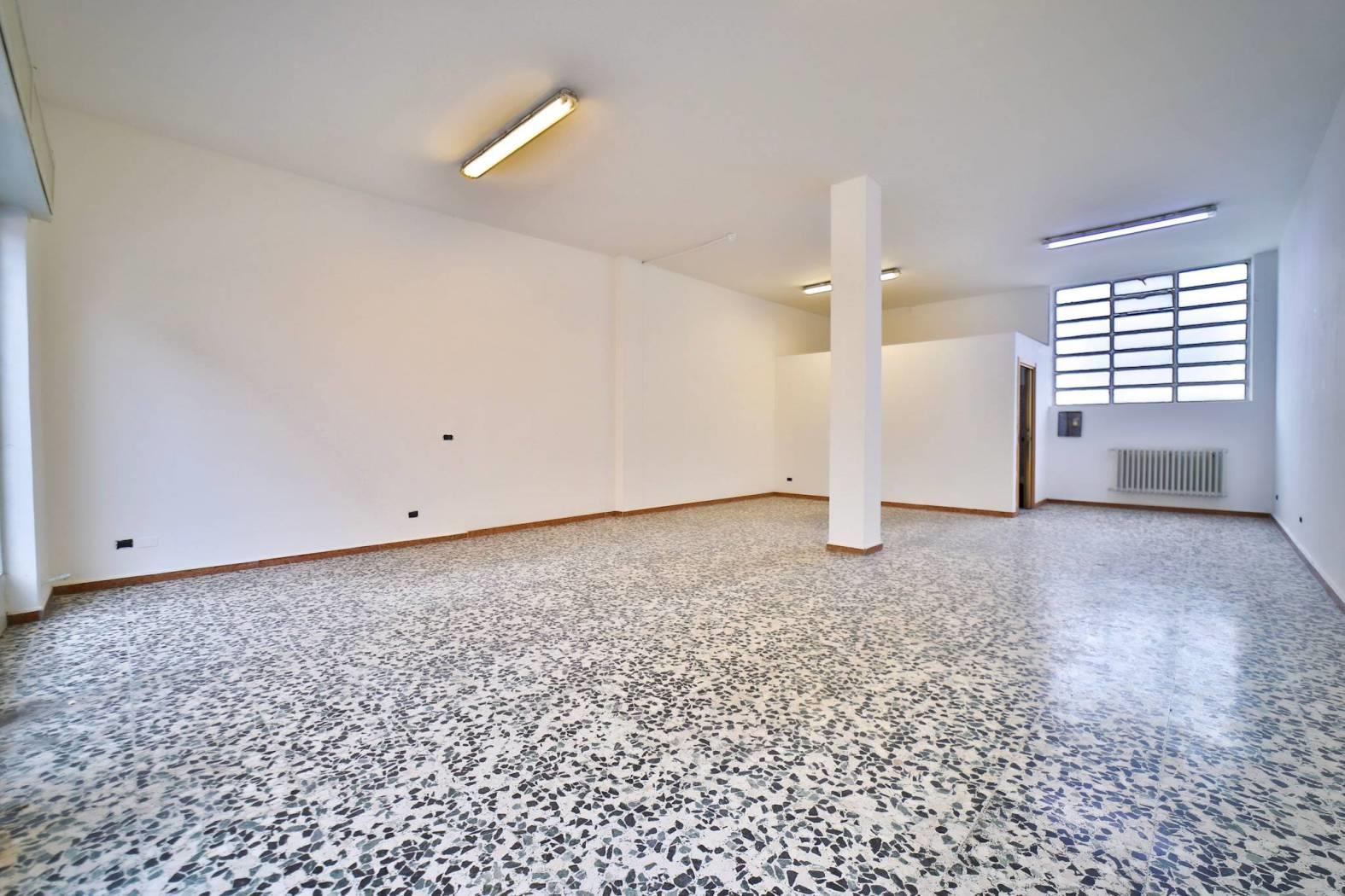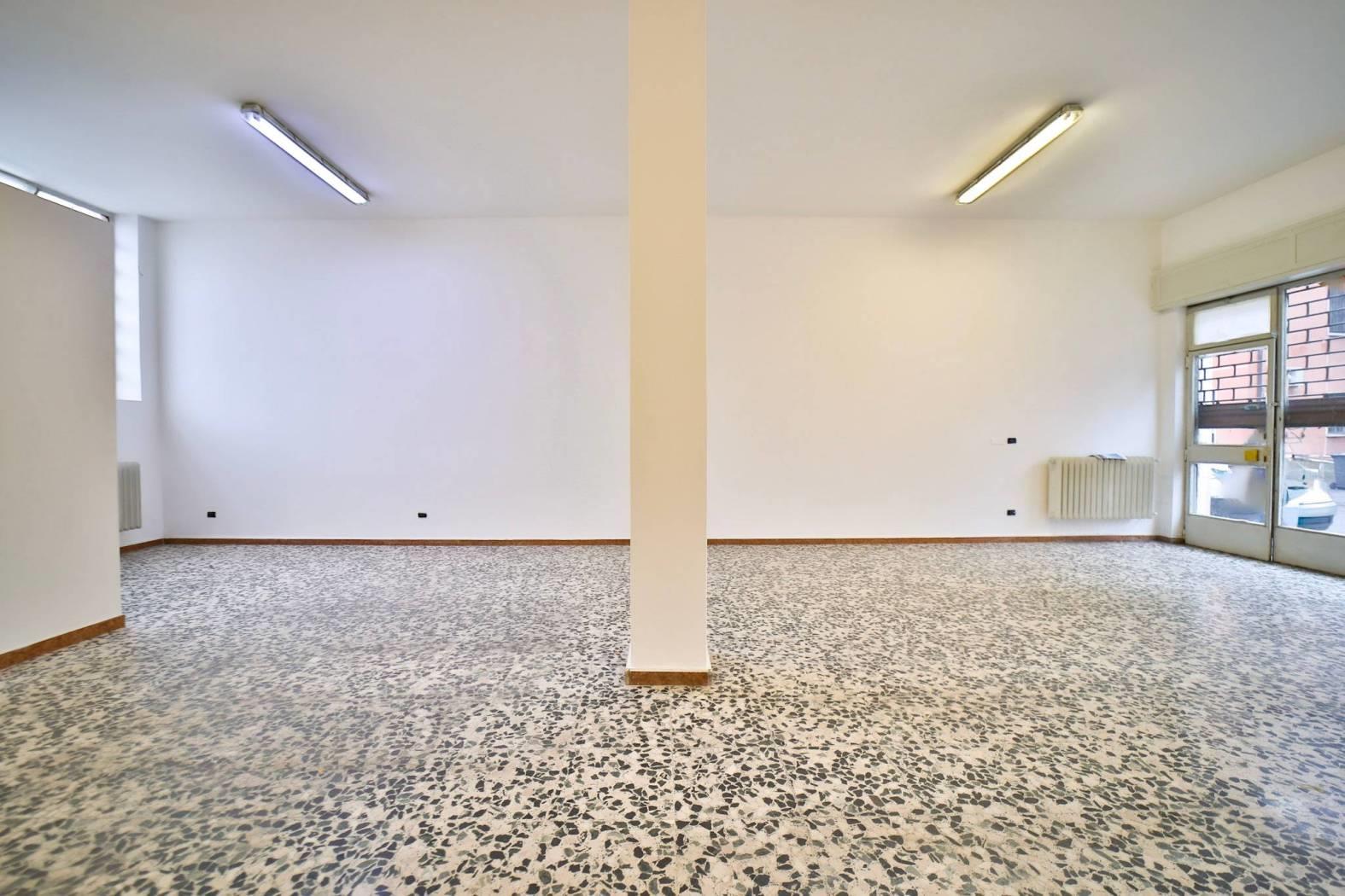 L’immobile è inserito in un edificio risalente indicativamente agli anni ’60-’70 e dispone di due ampie vetrine fronte strada che garantiscono un’eccellente visibilità. Gli spazi interni si articolano in un ampio locale open space con retro, antibagno e bagno finestrato. Le finiture sono di buona qualità con pavimentazione in graniglia e infissi in alluminio. L’immobile è attualmente privo di impianto di riscaldamento ed è libero subito.