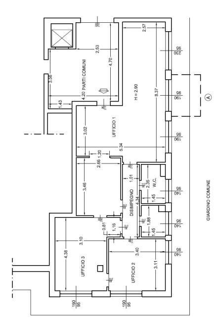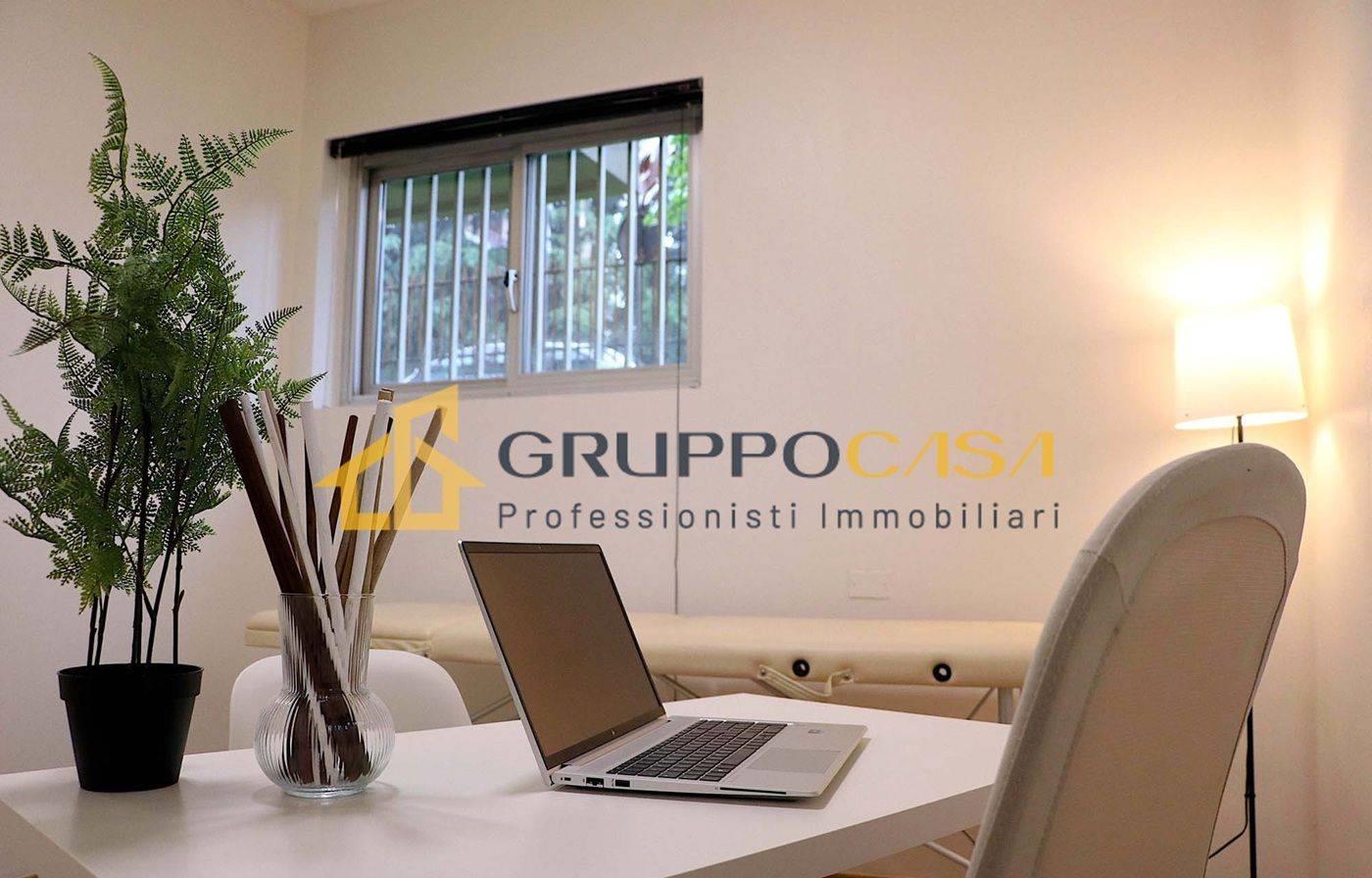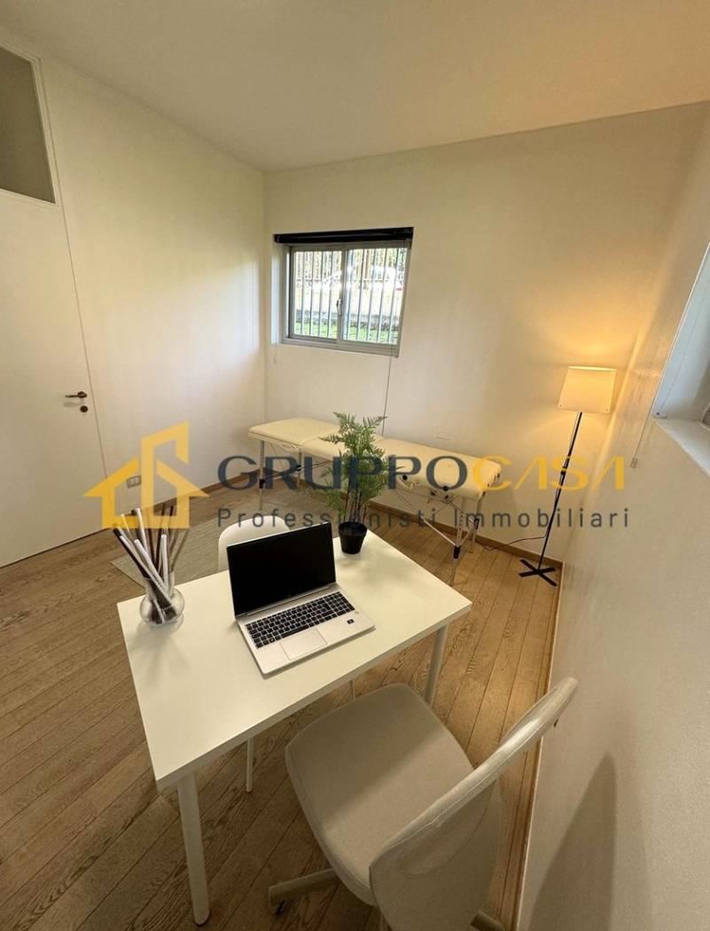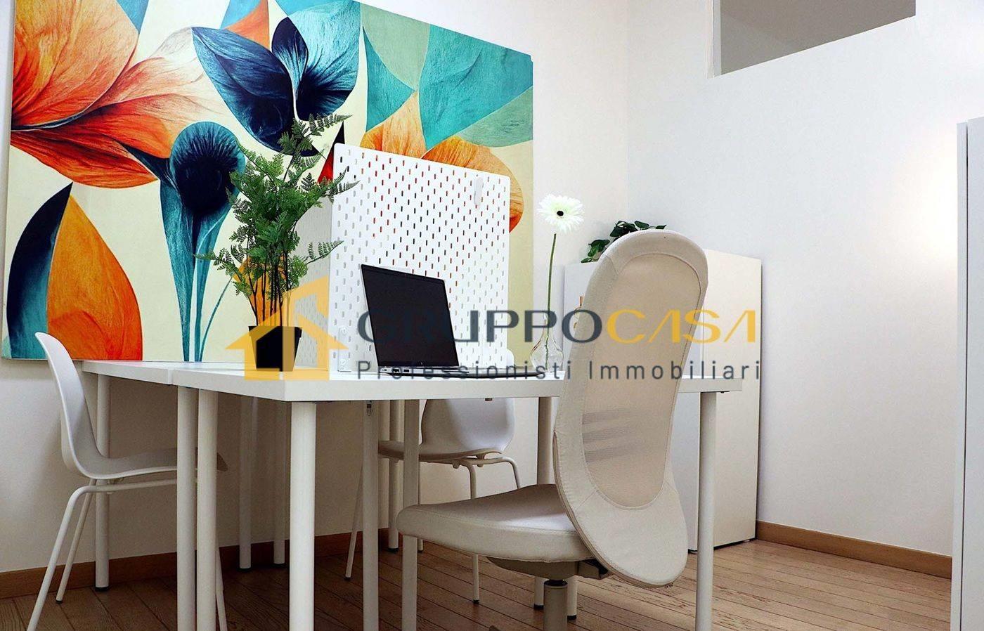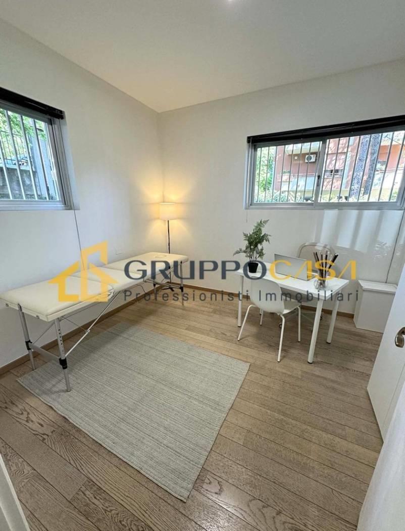 La soluzione è composta da un ingresso, quattro ampie sale funzionali, oltre servizi e locale ripostiglio/archivio, ed è estremamente luminosa, grazie alle ampie aperture che garantiscono un ambiente piacevole e professionale.