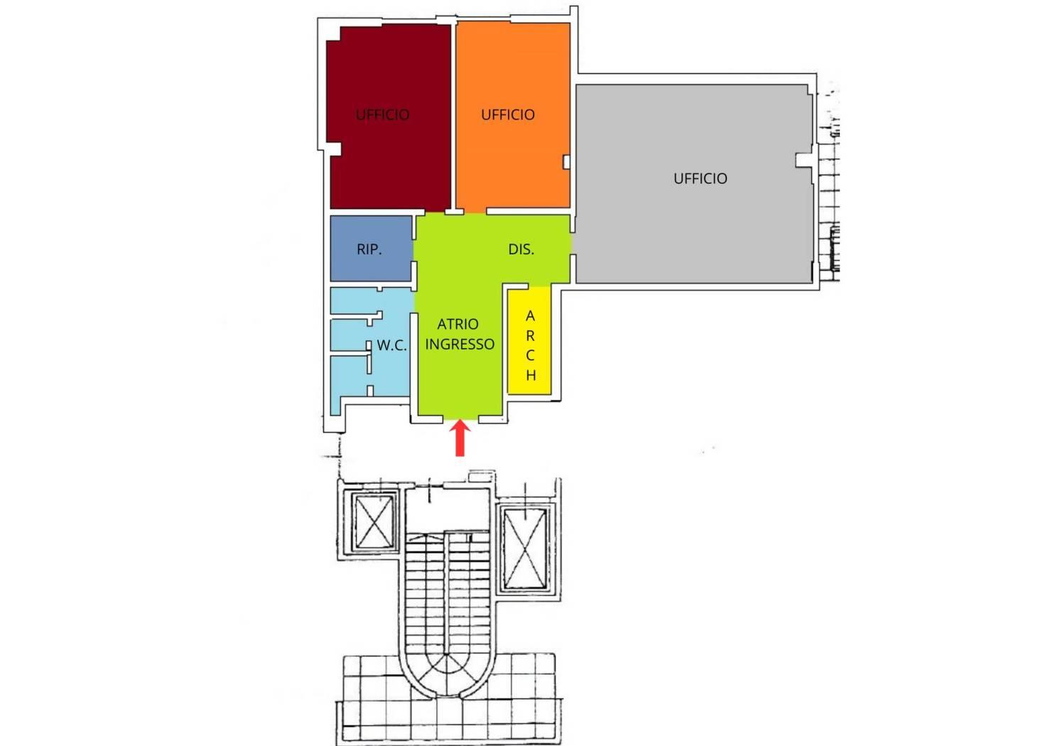 L’accesso avviene tramite un ingresso indipendente che conduce direttamente a un ampio e accogliente atrio, ideale per essere allestito come reception o sala d'attesa per i clienti. Lo spazio operativo è suddiviso in tre grandi uffici indipendenti, posizionati strategicamente. Un disimpegno centrale collega la zona lavoro a un’area servizi completa e funzionale, composta da un blocco di quattro bagni indipendenti, un pratico locale ripostiglio e uno spazio dedicato esclusivamente all'archivio.