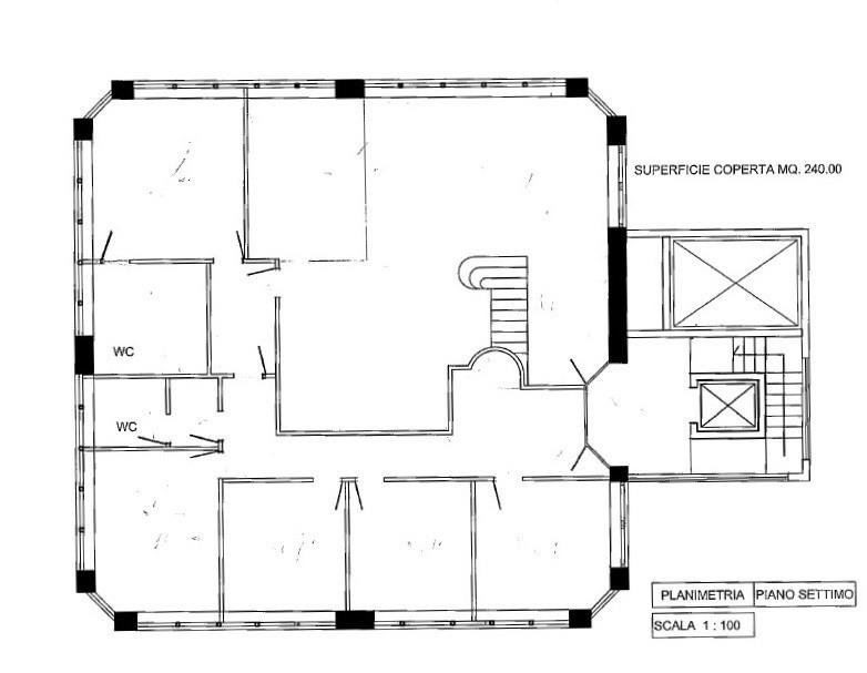 PIANO 7° - mq. 240: doppio ingresso, sbarco diretto ascensore, ampia reception, 4 uffici operativi e blocco servizi, oltre ad ufficio direzionale con bagno privato;