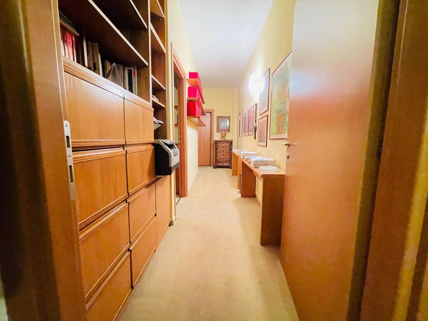 L'appartamento è cosi composto: ingresso ampio e corridoio, un primo locale segreteria/studio, ampio salone riunioni con affaccio esterno sul terrazzo, una ampia altra camera/ufficio con balcone, terza camera/studio, un bagno completo. Al momento adibito ad ufficio di rappresentanza, in tutti gli ambienti è presente una moquette beige in ottime condizioni.