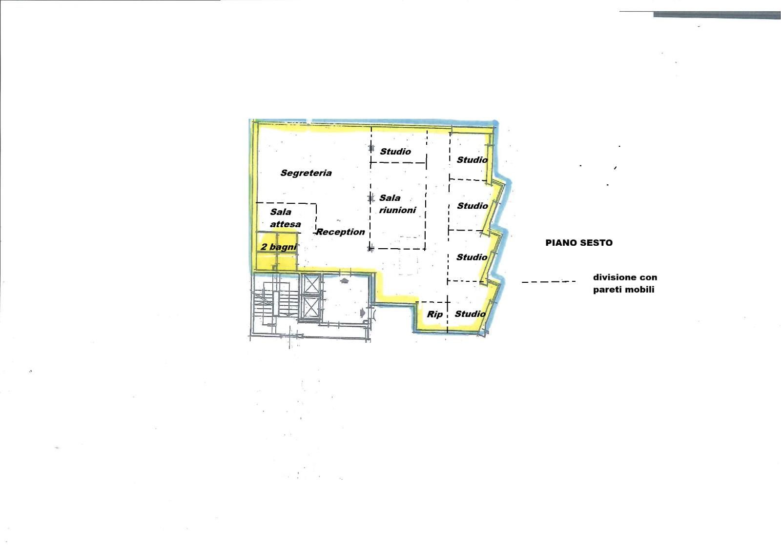 Ufficio di ampia metratura in posizione centrale posto al sesto ed ultimo piano di un fabbricato ad uso terziario/servizi. Suddivisione interna con pareti mobili attrezzate con ingresso con reception, ampio spazio operativo e segreteria, sala attesa, 5 studi privati, sala riunioni, 2 bagni. Completamento arredato e funzionante. Rete di cablaggio. Condizionamento. Doppio ascensore.