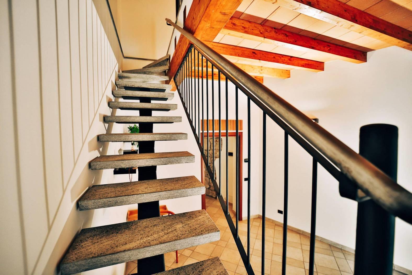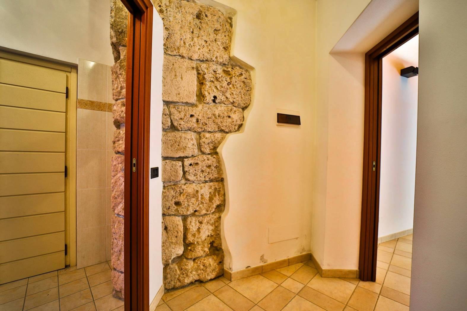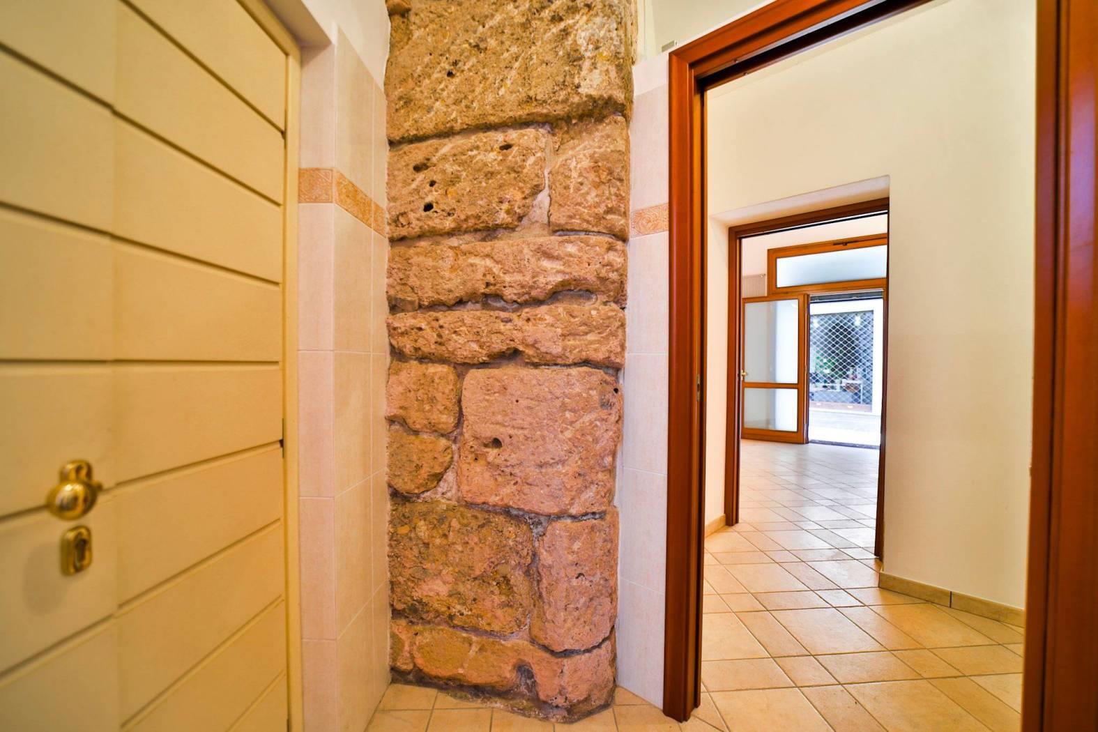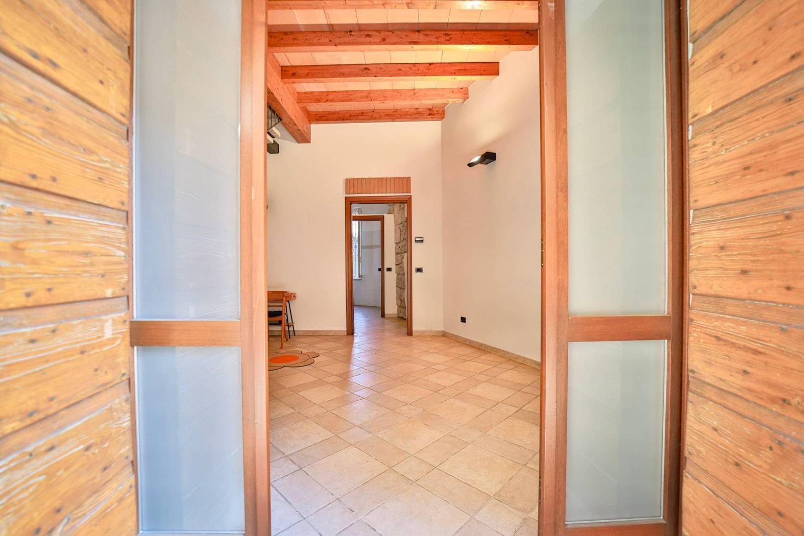 La pietra a vista, le travi lignee e le finiture ricercate dialogano con una scala in ferro e pietra dal gusto contemporaneo, creando uno spazio di lavoro che trasmette prestigio e identità. Tre accessi indipendenti — dalla strada, dal portone sul cortile interno e direttamente al primo piano — assicurano praticità e riservatezza.