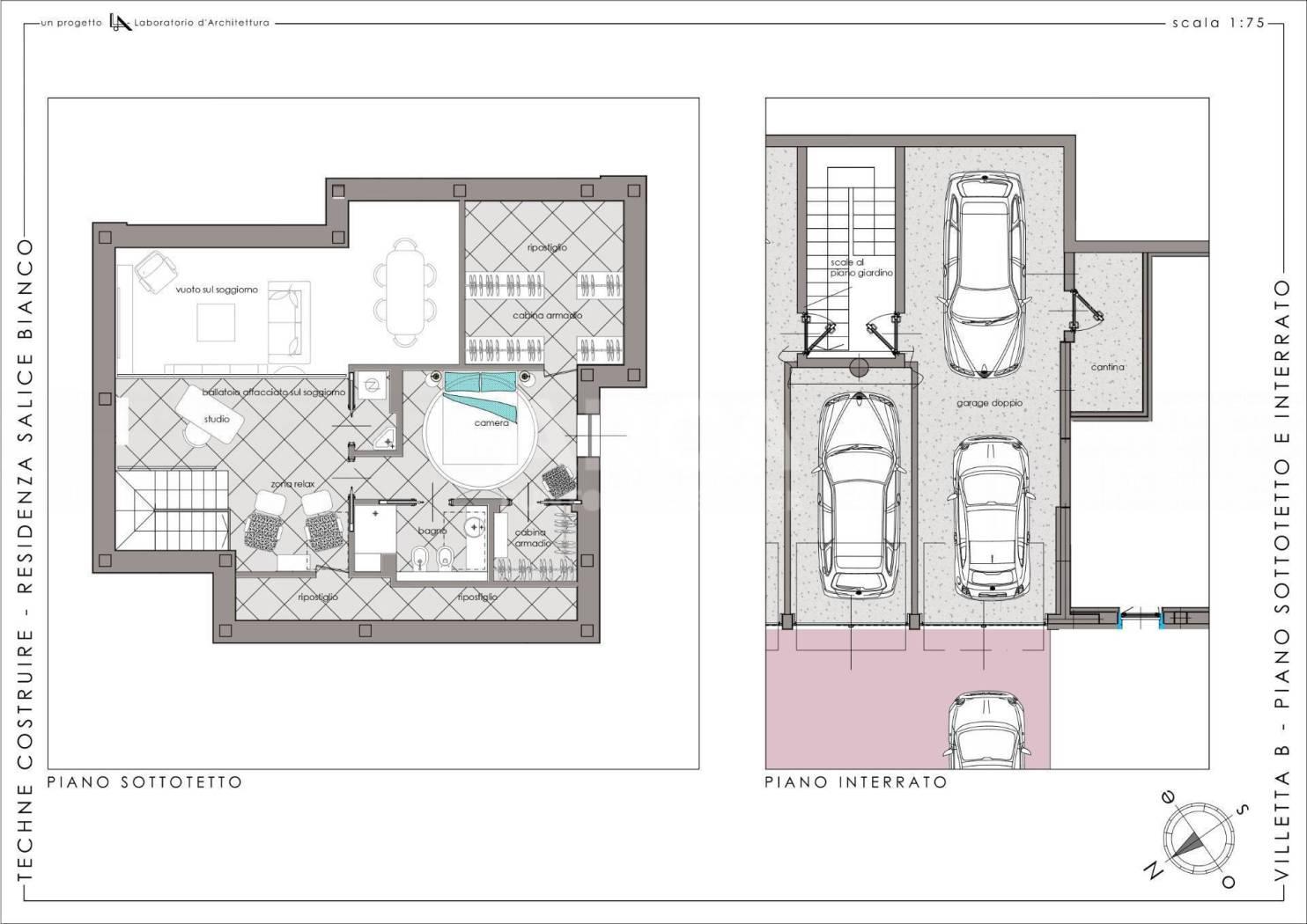 La villetta è così composta: ingresso esterno coperto con deposito biciclette, soggiorno a doppia altezza con travi a vista, zona pranzo con cucina a vista, camera da letto padronale con relativa anticamera e cabina armadio, seconda camera da letto e due bagni; al piano interrato locale tecnico/cantina e box doppio.