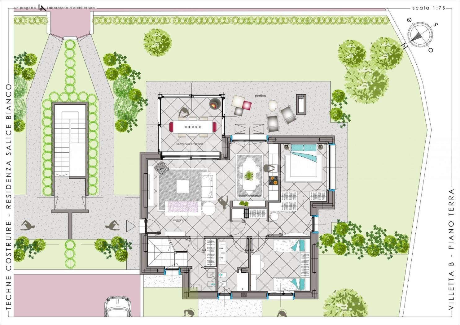 La soluzione qui proposta, prevede un appartamento con giardino di proprietà, portico e serra bioclimatica e Piano Sottotetto al rustico.