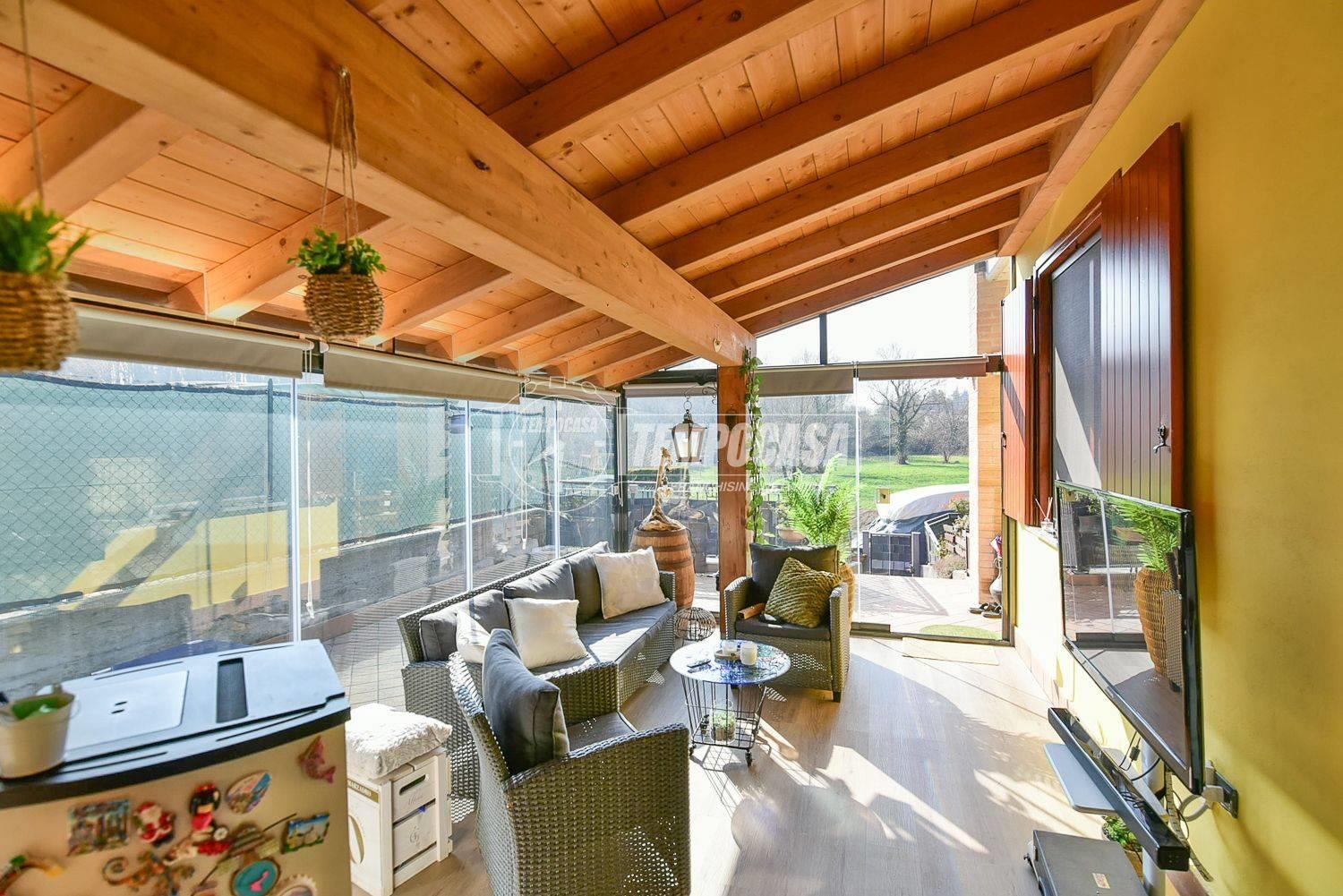 L’immobile, edificato nel 2004, si sviluppa su più livelli ed è così composto: al piano terra troviamo una veranda riscaldata con vetrate apribili, che regala uno spazio versatile da vivere sia in estate che in inverno. Da qui si accede all’abitazione, disposta su due livelli. Al piano terra troviamo la zona giorno composta da soggiorno con cucina a vista e accesso al giardino, disimpegno e bagno finestrato dotato di sanitari sospesi. Al piano primo troviamo la zona notte, composta da disimpegno, camera matrimoniale con accesso al balcone, cameretta e bagno finestrato con vasca idromassaggio e sanitari sospesi.