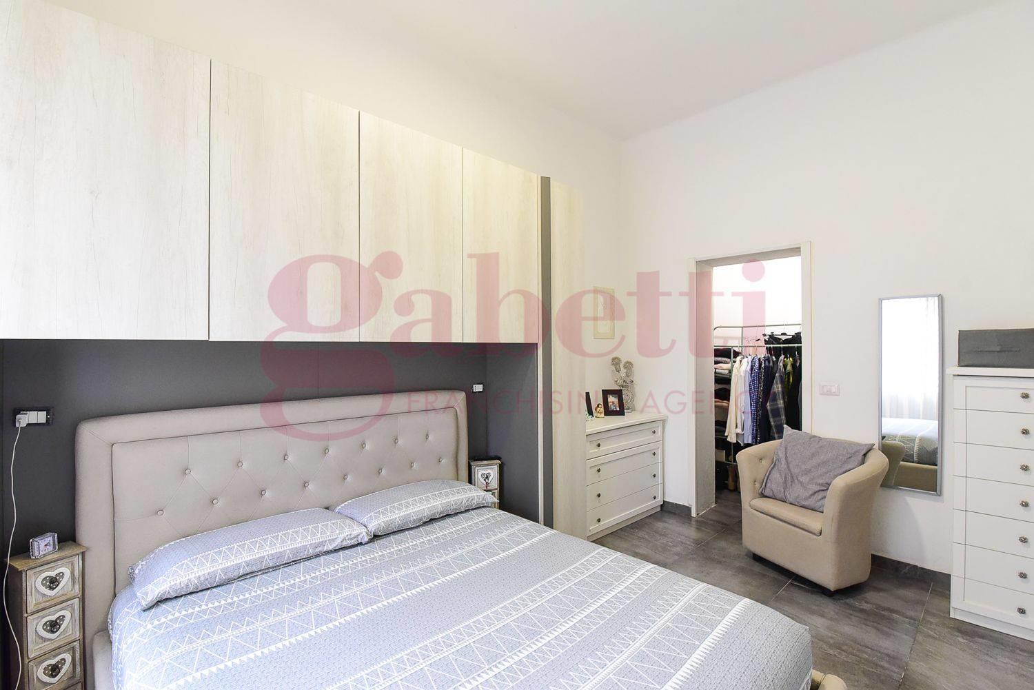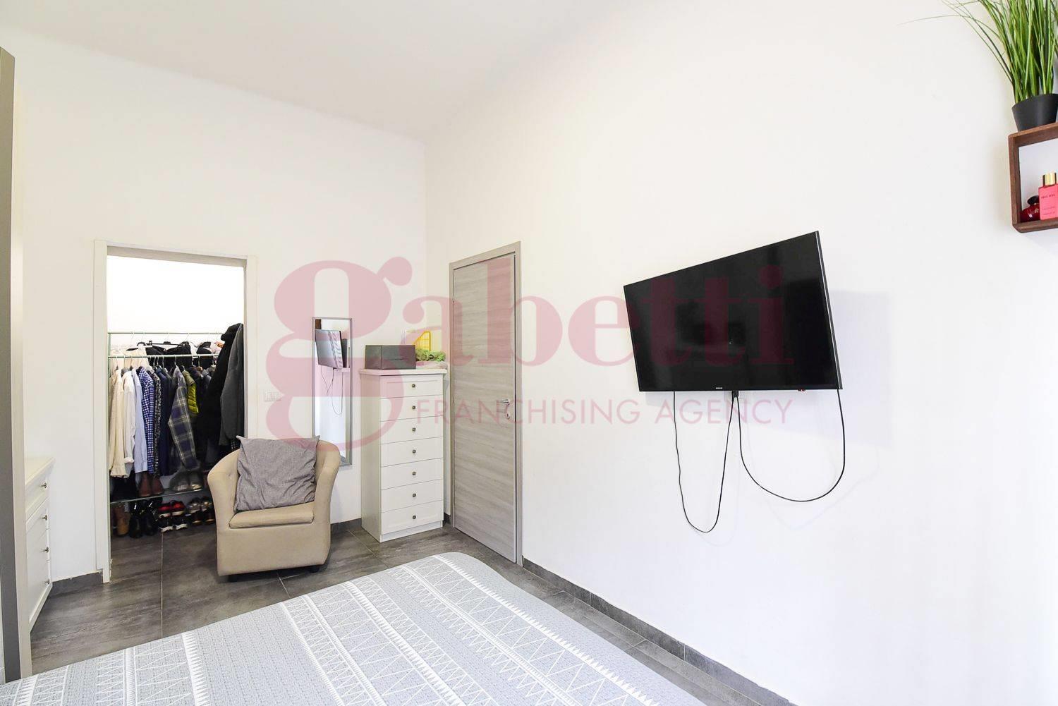 La soluzione al piano terra con doppio ingresso, è composta da soggiorno ampio con cucina a vista, disimpegno, camera matrimoniale con cabina armadio, bagno con box doccia e una lavanderia.