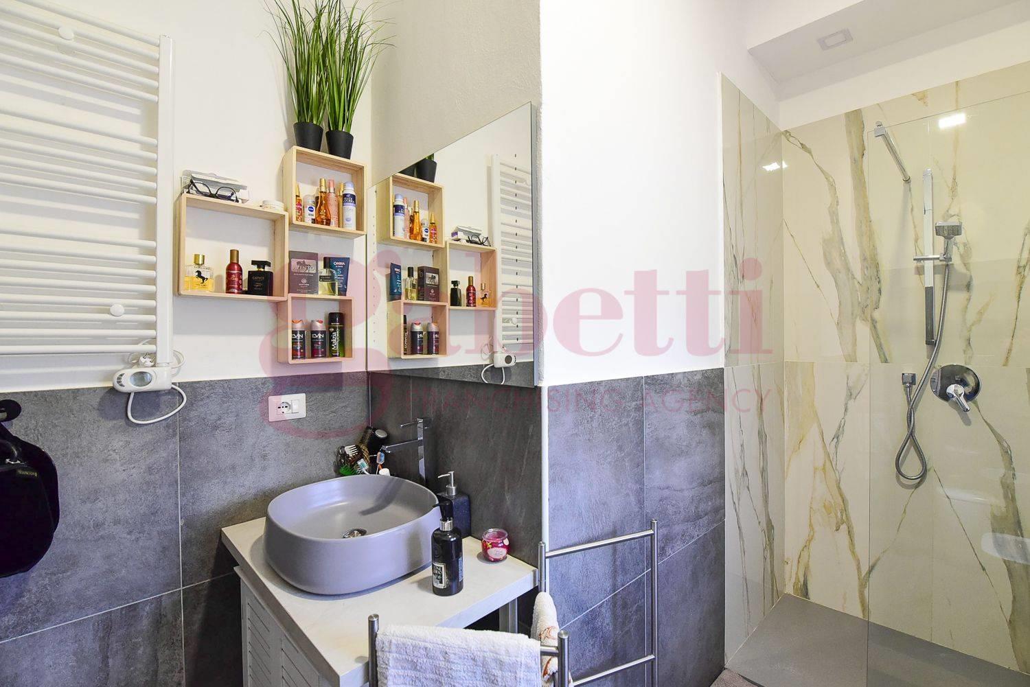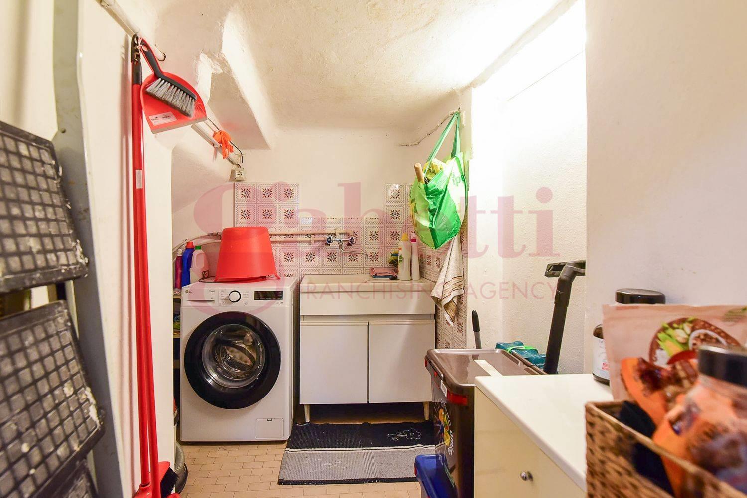 Comoda scala di collegamento che conduce al piano primo dove troviamo un ampio soggiorno con cucina separata, una camera matrimoniale con bagno completo di vasca e box doccia ed un ulteriore bagno di servizio.