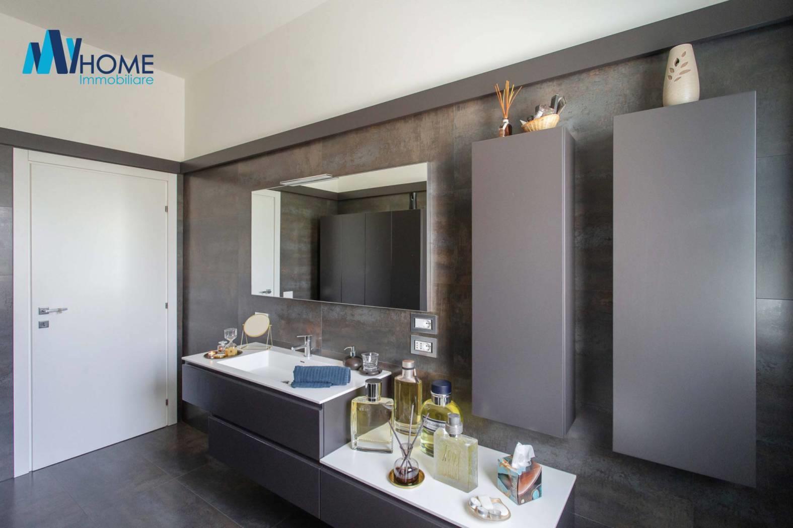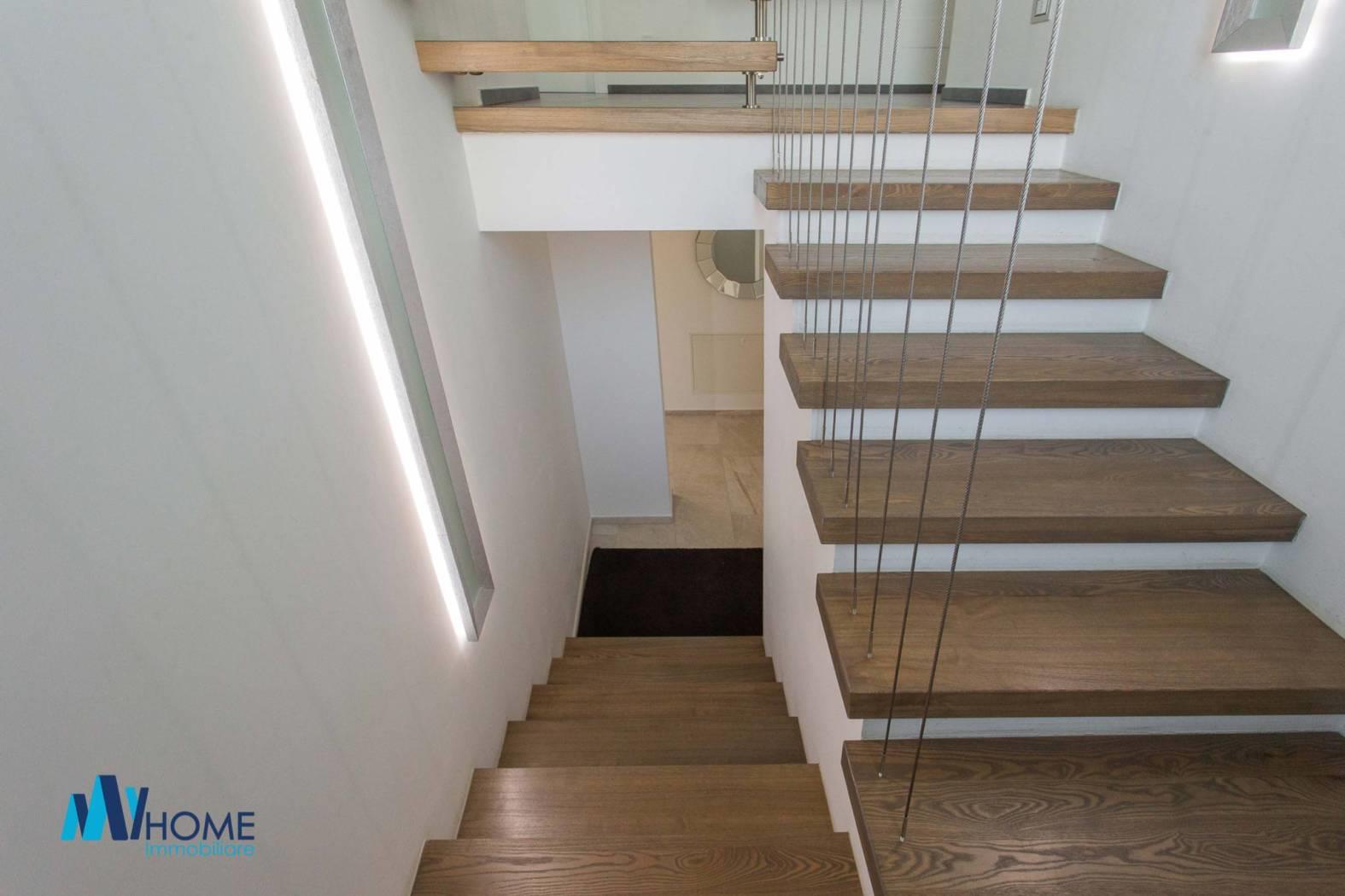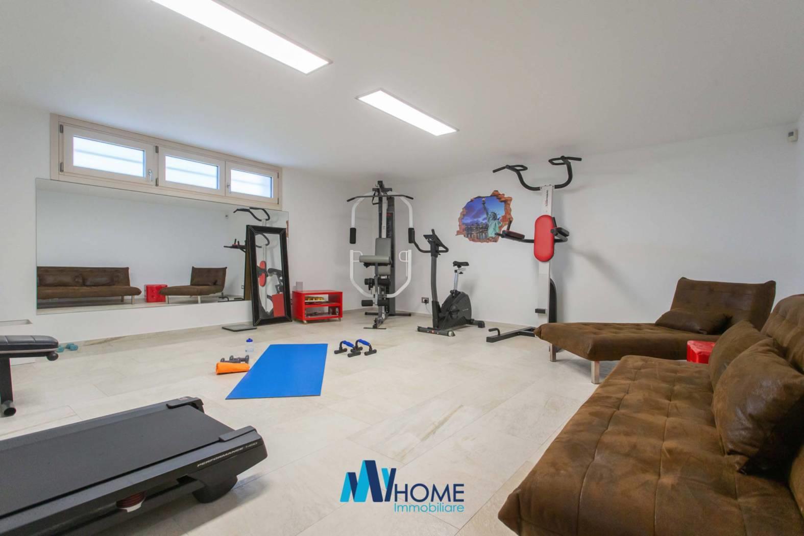 L'ingresso dell'immobile al piano terra, colpisce per l'ampio soggiorno living con delle finestre moderne per ammirare il giardino piantumato, la cucina è abitabile luminosa con penisola e ampia zona pranzo, il disimpegno ci porta nella zona notte dove troviamo le due camere matrimoniali, una con cabina armadio e due splendidi bagni con doccia doppia e giochi di luce oltre a delle finiture di alto pregio. La scala interna è in legno e di designer molto ampia fa da cornice al piano sottotetto con travi moderne a vista lamellari dove troviamo un locale open space con zona studio/ufficio, e zona relax cinema/tv oltre ad una camera riservata e un bagno. al piano seminterrato colpisce la luminosità degli ambienti dove troviamo una lavanderia, il locale tecnico, l'ampio box singolo con basculante motorizzata, un bagno finemente rifinito, la palestra con tutte le attrezzature oltre che la predisposizione per sauna e bagno turco, una camera per gli ospiti, oltre ad una splendida taverna che da sull'esterno dell'immobile dove troviamo un ampia zona piastrellata per passare delle giornate d'estate con amici e parenti a vista sulla splendida piscina 10 x 5 metri circondata dal giardino.