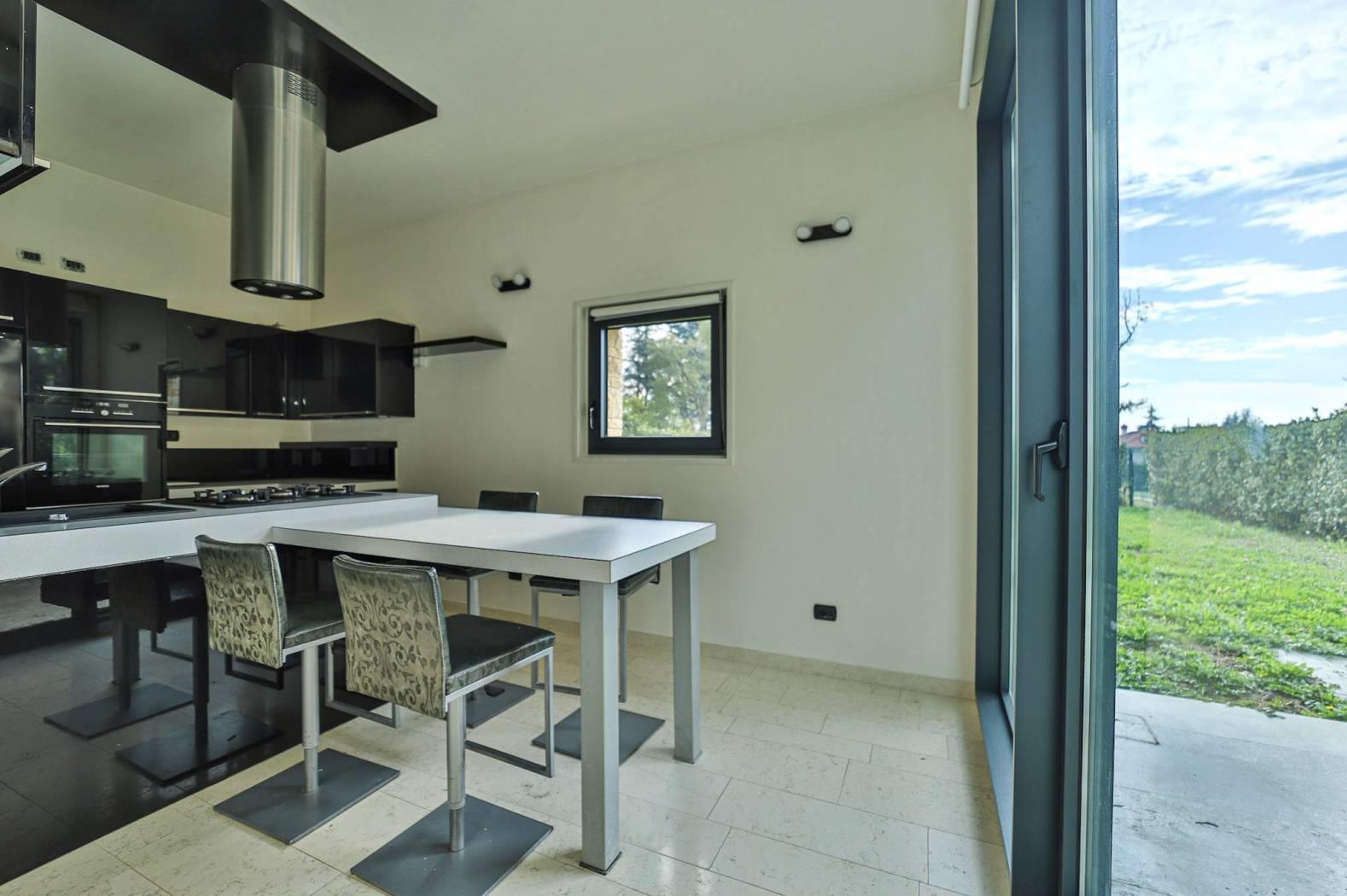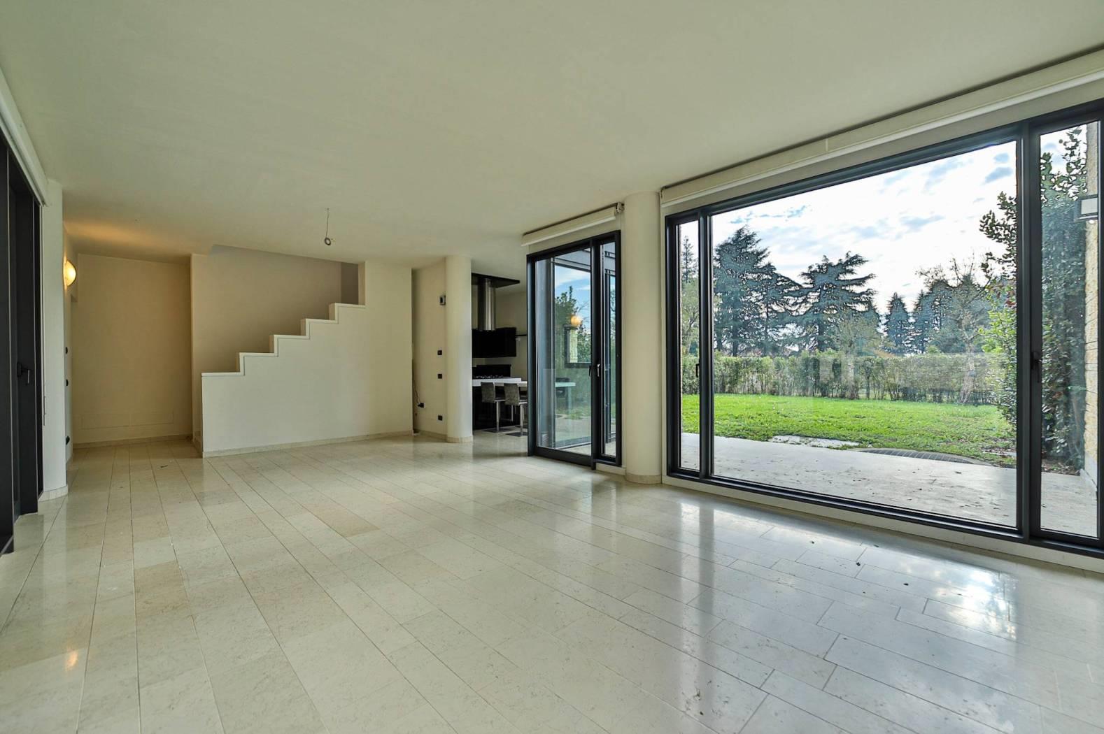 All'interno, l’ampio soggiorno si apre grazie alle vetrate verso il giardino, offrendo un ambiente accogliente e perfetto per il relax e la socializzazione. La cucina abitabile, anch’essa vetrata, si affaccia sul portico e sul giardino, rendendo ogni pasto un’esperienza immersa nella bellezza naturale. Completano il piano terra una camera matrimoniale con bagno privato, perfetta sia come raffinata suite per gli ospiti, sia come studio o ufficio.