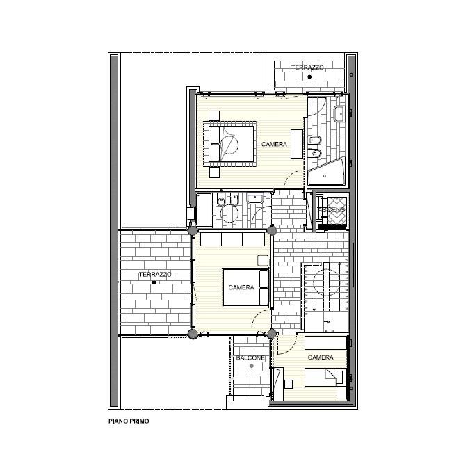 Al primo piano, questa villa offre una zona notte pensata per il massimo comfort e la privacy. Qui si trovano tre ampie camere da letto matrimoniali, ognuna dotata di un proprio terrazzino privato che permette di godere della tranquillità e del verde circostante. La suite padronale dispone di un bagno privato, mentre un’altra delle camere si distingue per due pareti interamente vetrate che si aprono su un terrazzo esclusivo di 15 mq, regalando una vista suggestiva e un’incredibile luminosità. A completare il piano, un secondo bagno, ben rifinito e funzionale, al servizio delle altre camere.