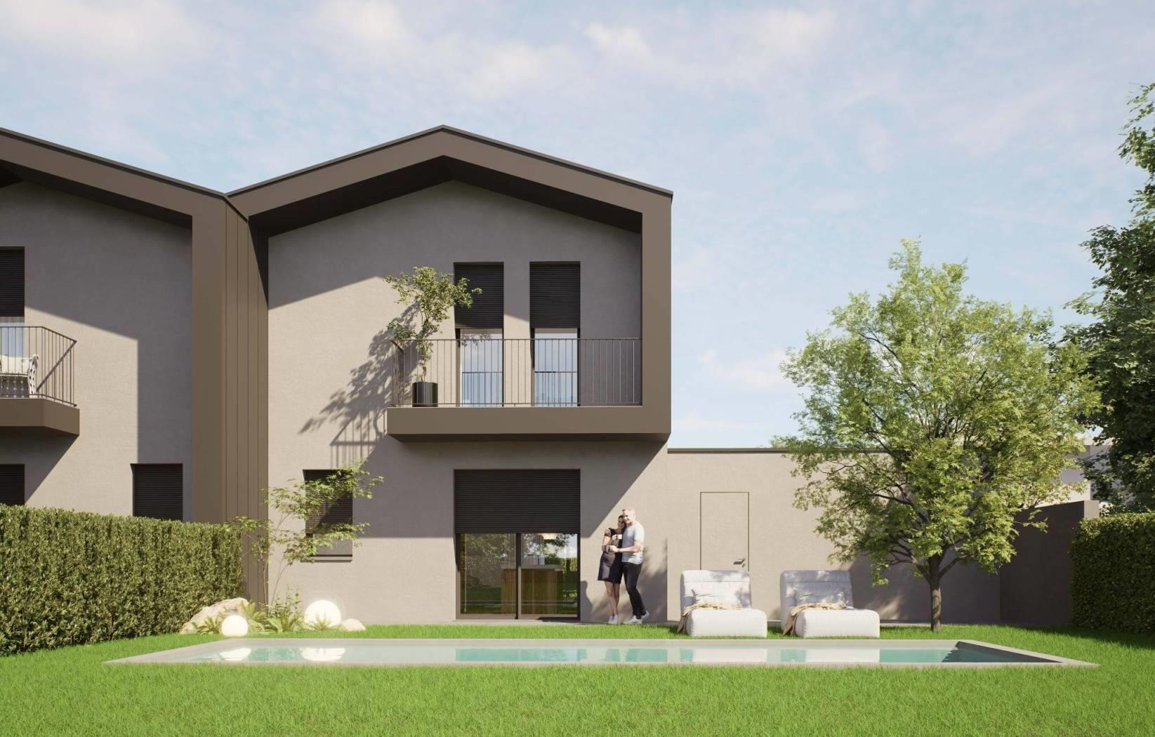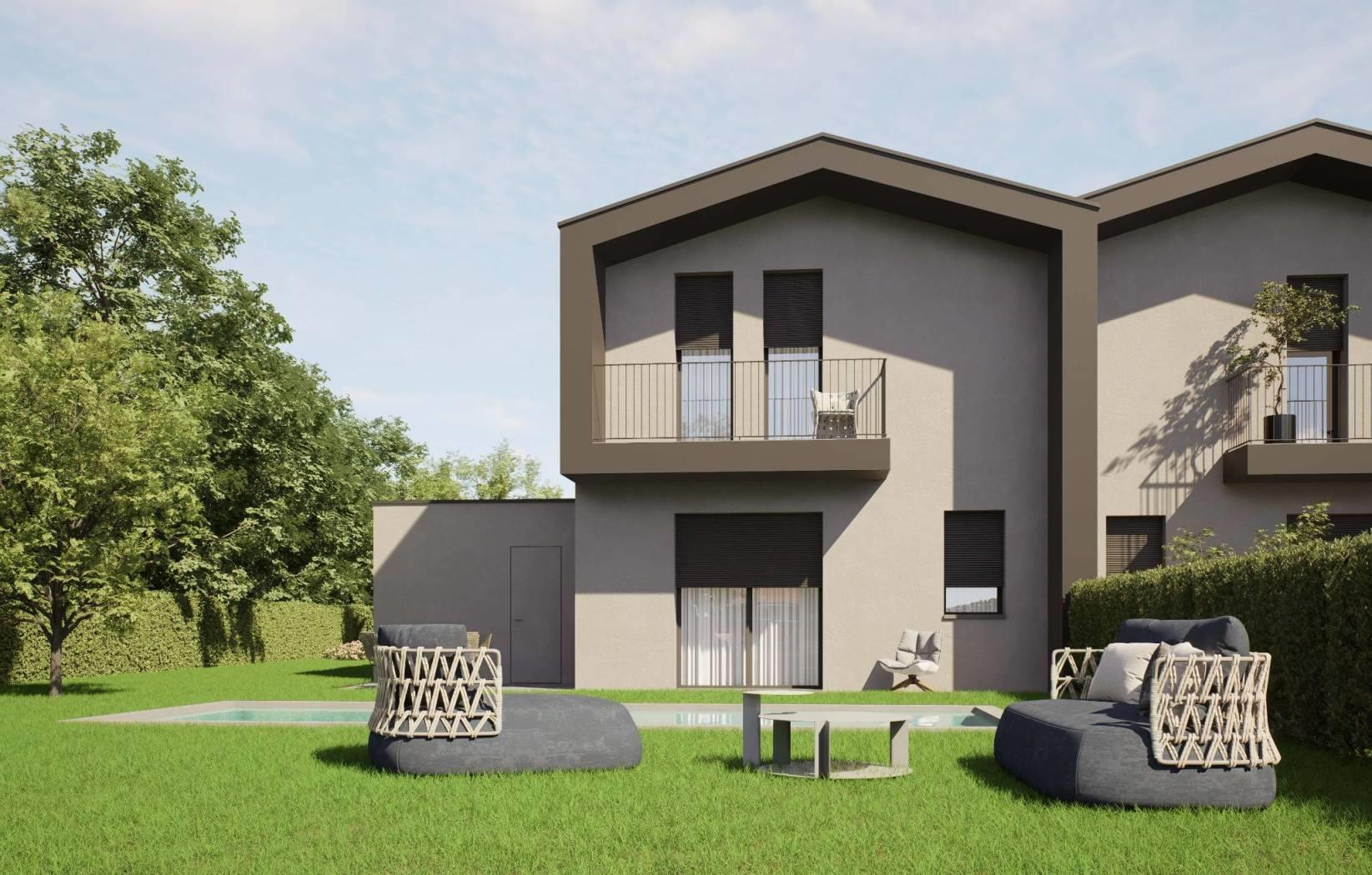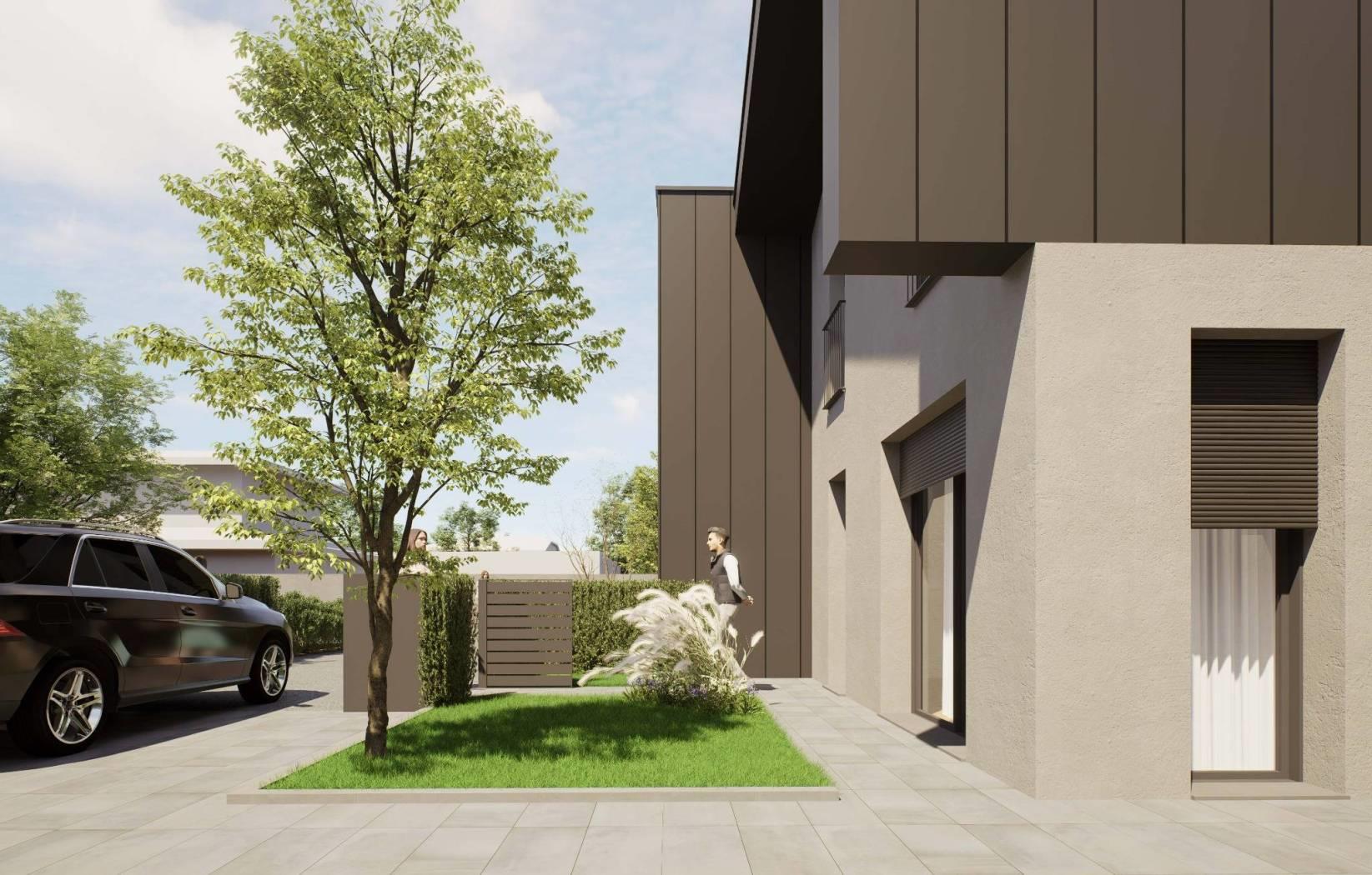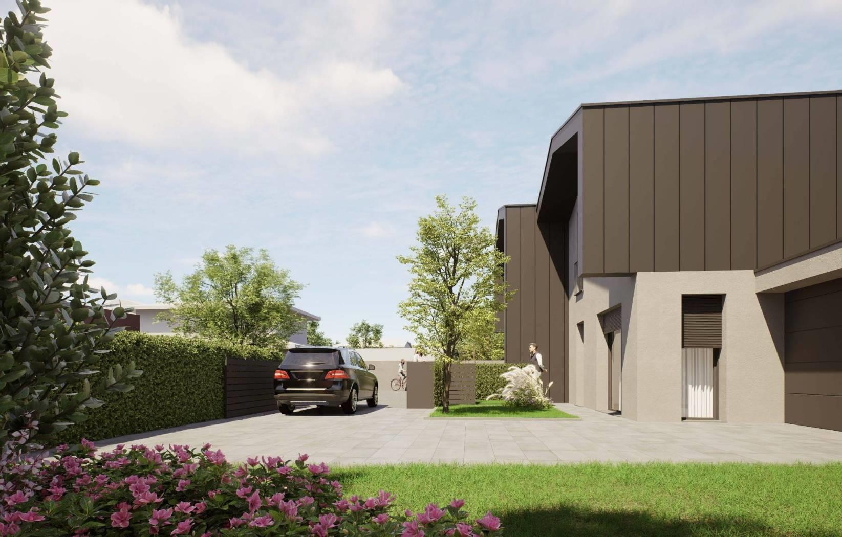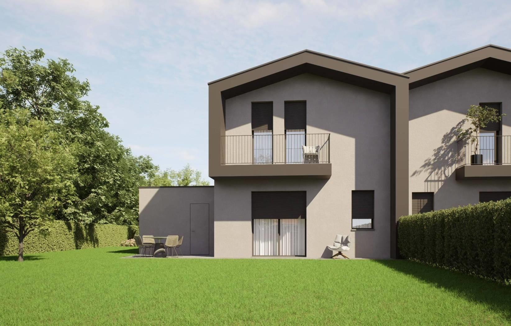 porzione di villa bifamiliare di nuova realizzazione con ingresso pedonale e carraio completamente indipendente, composta da: p.terra ingresso, ampio soggiorno, cucina abitabile, disimpegno e bagno; giardino privato di 680,77mq e box di 22,86mq sempre al piano terra;
