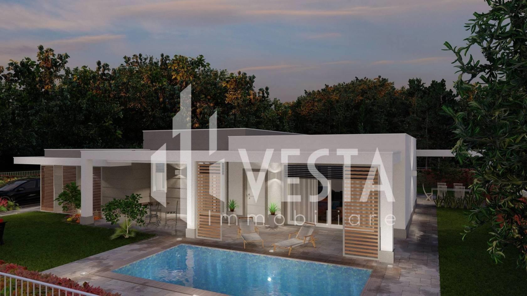 La Villa è concepita con uno stile elegante, dal design moderno, raffinato e funzionale, disposta su un unico livello abitativo con giardino privato di c.a 812mq con possibilità di progettare e realizzare la piscina di ca. mt. 5x3 (opzionale), le finiture interne sono a scelta e personalizzabili dell'acquirente da prestigioso capitolato (porte, pavimenti, rivestimenti, sanitari, rubinetterie,placche). Gli spazi sono sapientemente distribuiti; Tramite il portico coperto accediamo all'ingresso che si apre su un'ampia e luminosa zona living con zona pranzo caratterizzata da grandi vetrate scorrevoli, adiacente, una comoda cucina abitabile, il disimpegno ci introduce nella zona notte dove ci accolgono tre ampie camere tutte con uscita sul portico e giardino, di cui una matrimoniale, due bagni finestrati con sanitari sospesi, doccia e termoarredo oltre ed una comoda lavanderia.