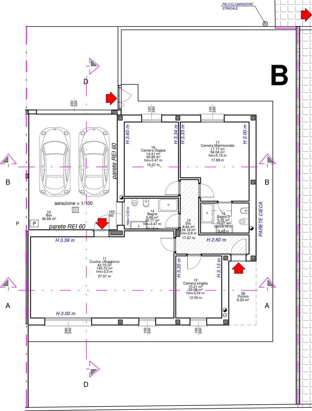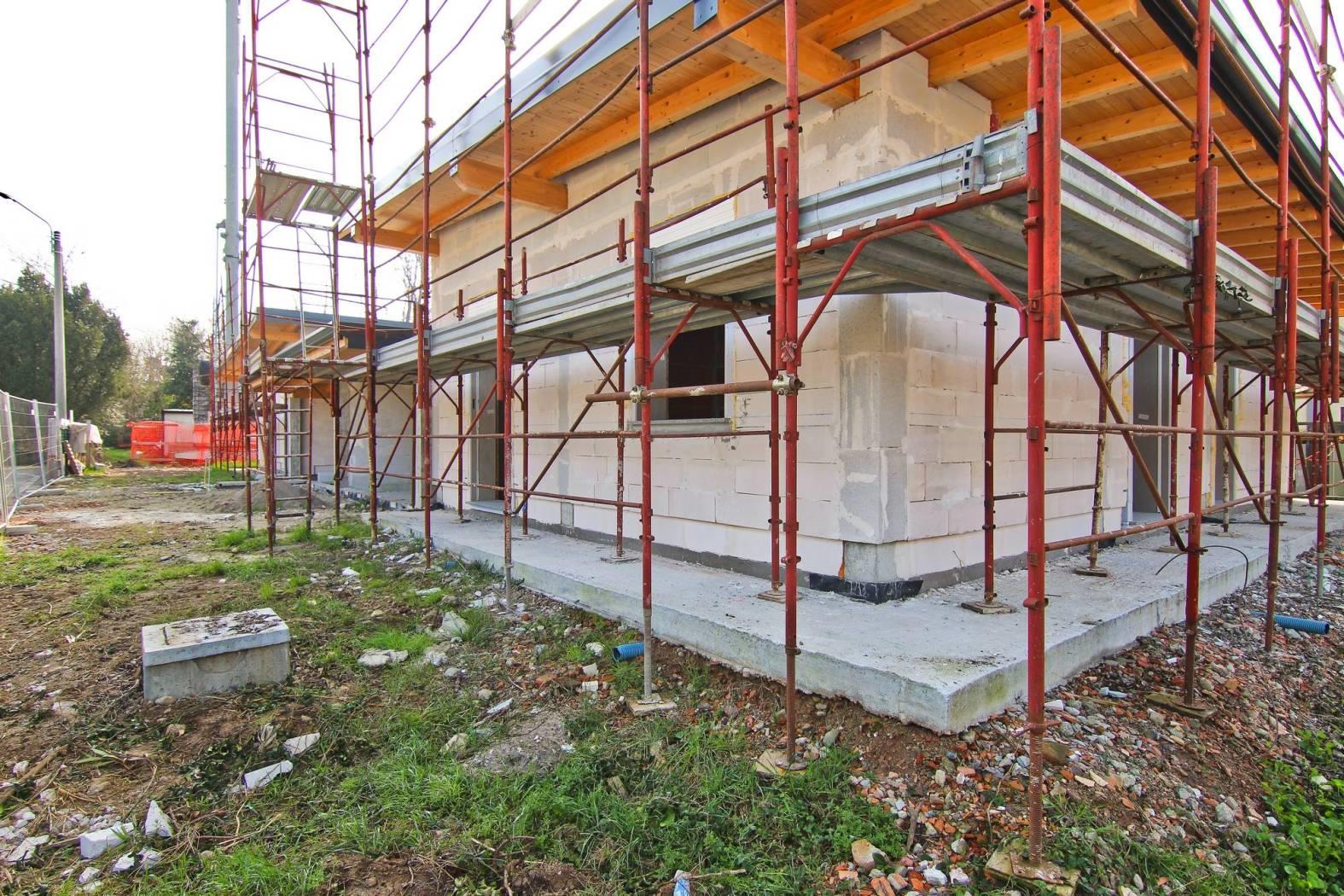 VILLA B – Sviluppa una metratura di mq 127 con una divisione interna che prevede un quattro locali più doppi servizi DISPOSTI SU UN UNICO LIVELLO abitativo. Le zona giorno sono esposte in direzione SUD caratteristica che garantisce luminosità per tutto l’arco della giornata. Il soggiorno raggiunge una superfice di mq 43 comunicante con il giardino di proprietà tramite il finestrone scorrevole. La cucina è gestita su una parete del grande ambiente con possibilità, date le grandi dimensioni, di poterla separare. Il disimpegno conduce alla zona notte composta da tre camere da letto, tutte sopra la media delle metrature e doppi servizi. Il box auto anch’esso molto grande arriva ad una metratura di mq 42 in grado di ospitare due autovetture una di fianco all’altra ed è dotato di comodo accesso diretto alla villa. Il giardino, luogo di relax privato all’aria aperta, circonda l’abitazione sui tre lati, una vera e propria oasi di relax all’aria aperta, in una zona dove il traffico veicolare è quasi assente. Di fronte al box è presente un’area di proprietà dove è possibile parcheggiare due auto visitatori. Il tetto costruito con scenografiche travi a vista in legno lamellare raggiunge un’altezza interna di 4 metri donando impatto scenografico ed estetico degli ambienti. Un cuore tecnologico, che grazie a materiali ad alte prestazioni energetiche e impianti di ultima generazione consentiranno il raggiungimento della classe energetica “A3“a salvaguardia dei consumi e nel rispetto dell’ambiente.