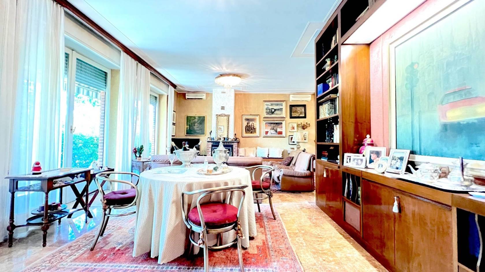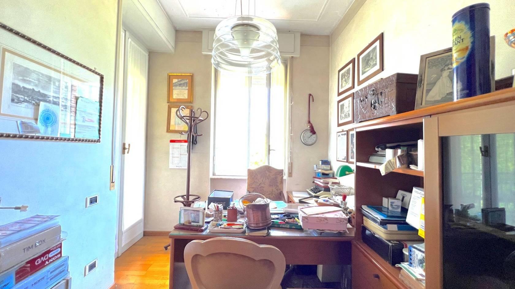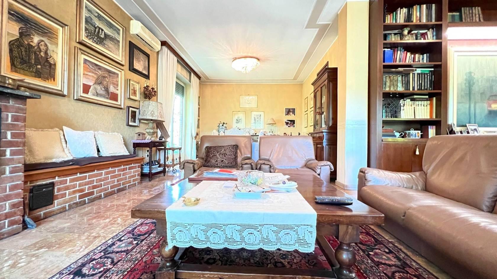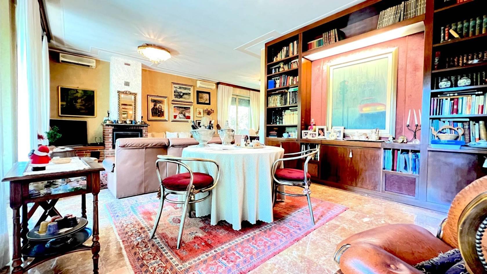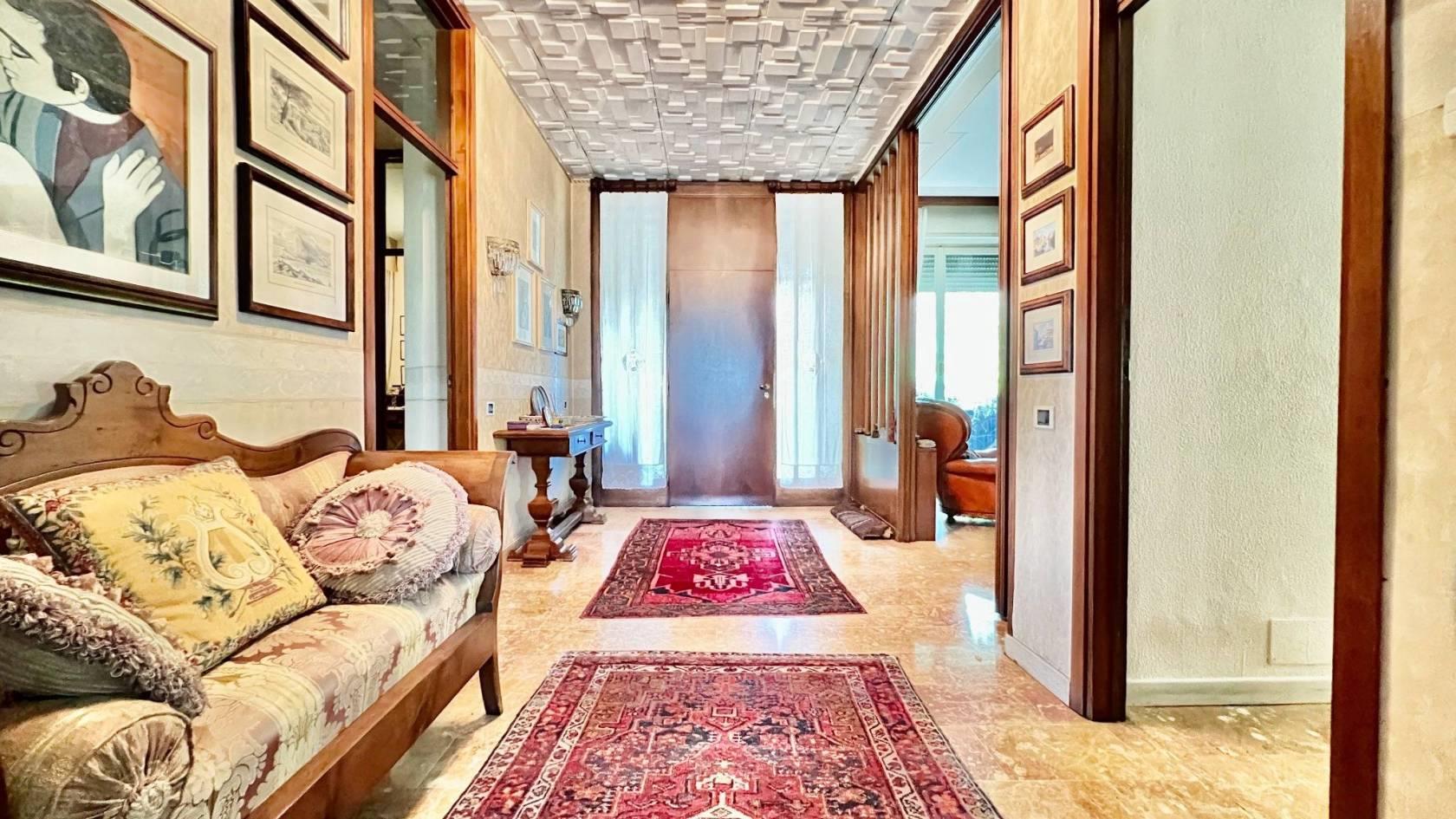 Entrando troviamo un elegante disimpegno d’accesso caratteristico delle abitazioni degni anni ’70, che suddivide la zona giorno dalla notte, dove è inserito uno studio privato.