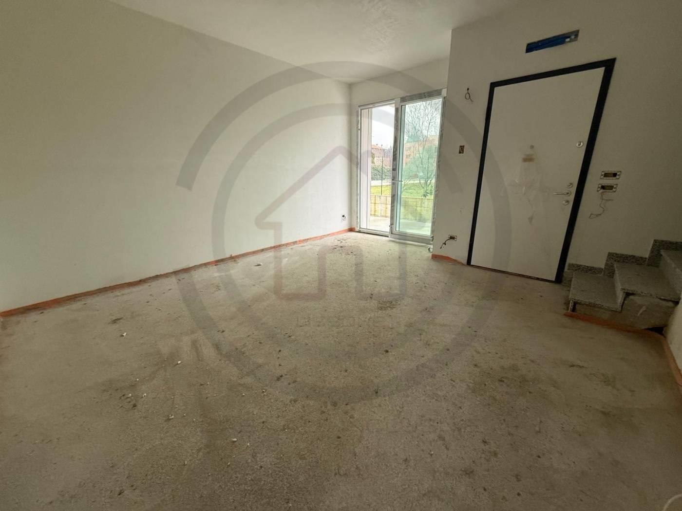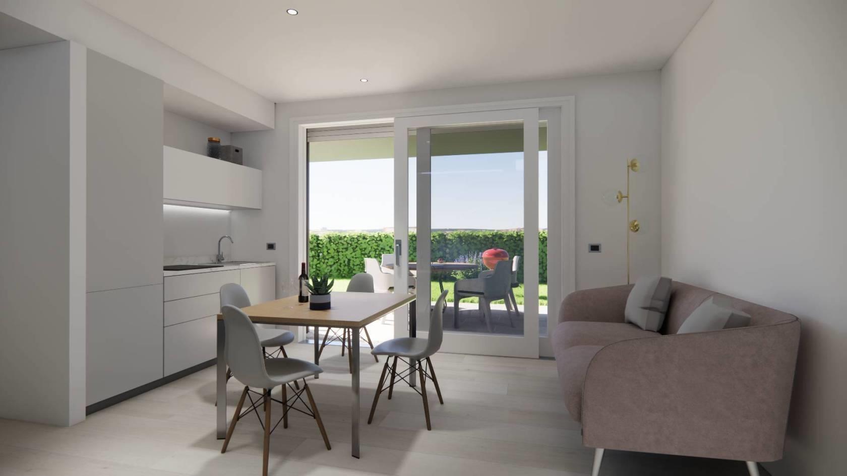 Piano terra composto da doppio GIARDINO PRIVATO, ZONA LIVING con cucina a vista, disimpegno e bagno.