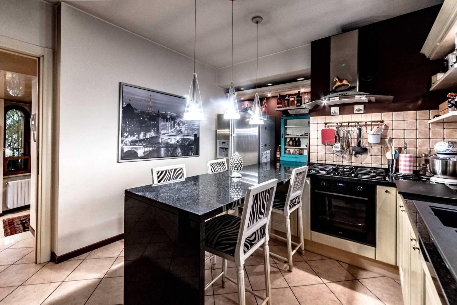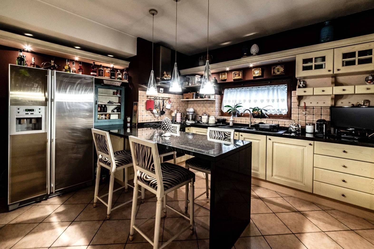 La cucina abitabile, spaziosa e ben organizzata, ha accesso diretto al portico, soluzione perfetta per pranzi e cene all’aperto.