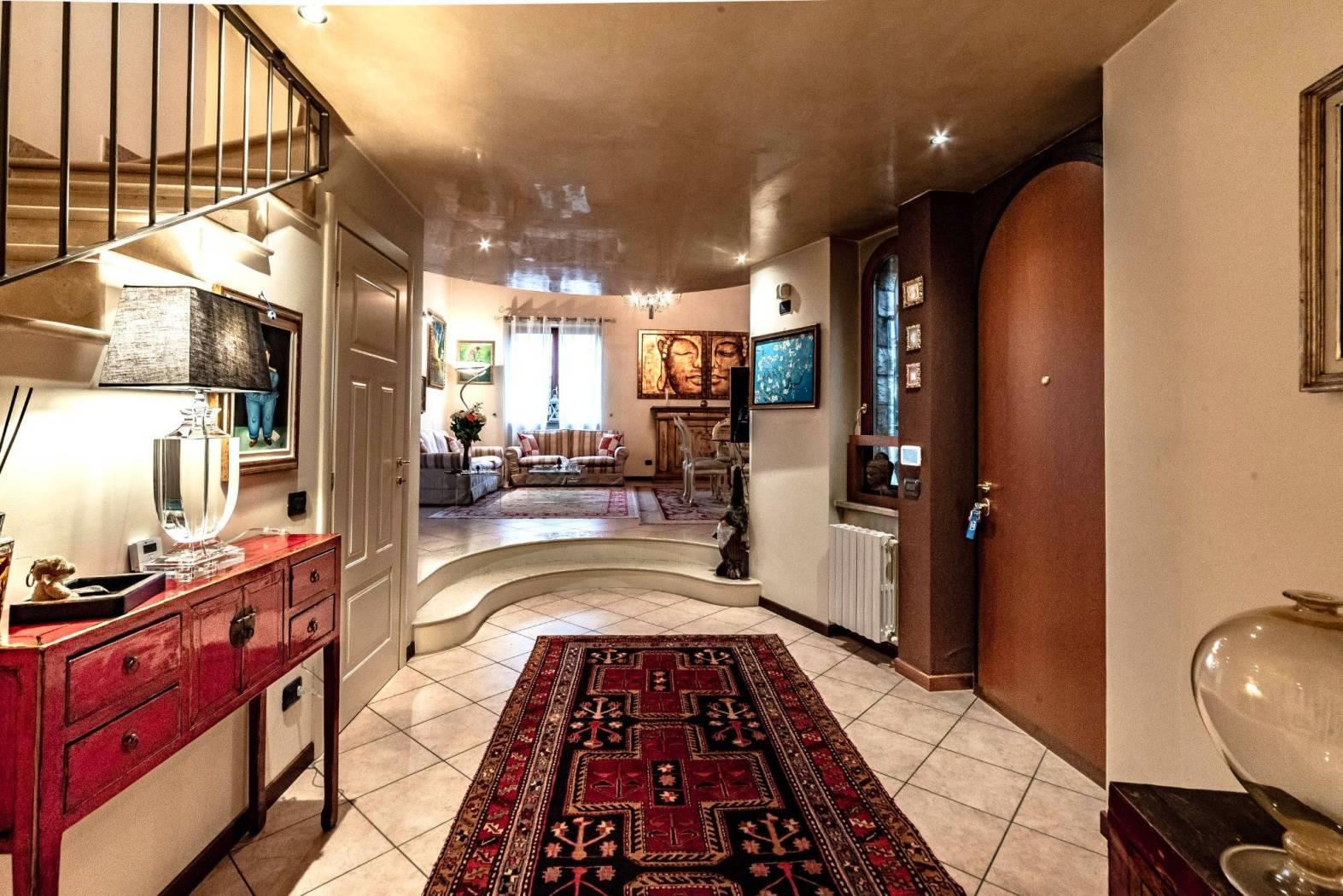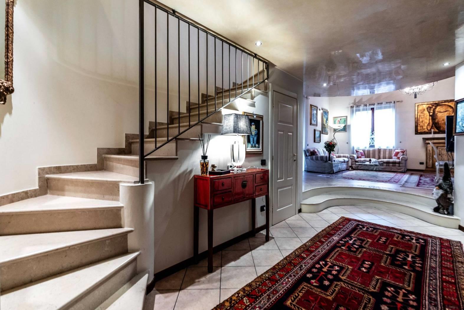 L’ingresso introduce in un grande disimpegno centrale, impreziosito da un caratteristico vano scala a sviluppo ellittico, che collega con eleganza i vari livelli della villa.