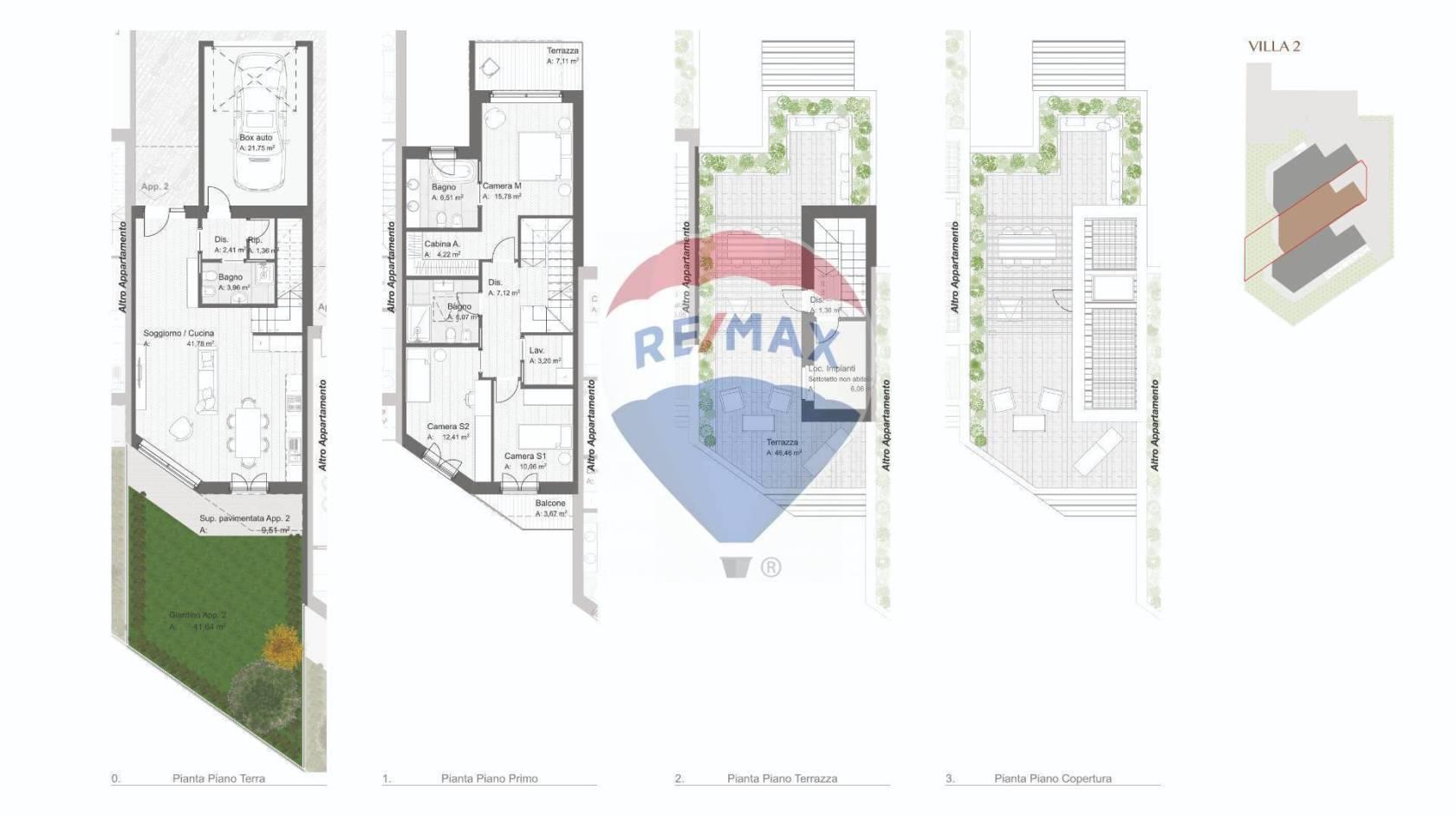 VILLA 2 : la Villa 2 è la residenza centrale. ll portoncino d'accesso è stato progettato con una porzione del piano superiore aggettante, al fine di formare un'area riparata fuori dalla zona della porta principale. Il piano terra di 66 mq si caratterizza da un'ampia zona giorno open space che si affaccia direttamente sul giardino privato (50 mq) e verso le migliori esposizioni solari, al fine di sfruttare al meglio l'apporto della luce solare e garantire una buona illuminazione naturale degli ambienti. Al piano terra vi è poi la presenza di un bagno completo, un ripostiglio ed un disimpegno che collega direttamente l'abitazione al box auto privato.