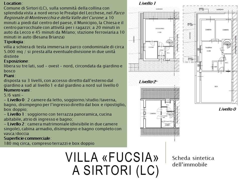 SIRTORI proponiamo villetta di testa con posizione e vista panoramica. La proprietà è disposta su tre livelli e si trova così divisa: al primo livello troviamo un ampia taverna in parte abitabile con giardino, ripostiglio, 2 camere da letto e bagno, possibilità di ricavare un appartamento indipendente. Al piano terreno disponiamo di un ampio soggiorno con camino con balcone con splendida vista panoramica, cucina abitabile e bagno. Mansarda con disimpegno scala con armadiatura fissa e ampia camera matrimoniale doppia (possibilità di ricavare la terza camera) e bagno. Giardino condominiale. Box doppio. Riscaldamento autonomo, spese condominiali contenute. Caratteristiche dell’immobile: confortevole, inserito in contesto residenziale di ottimo arredo urbano, luminoso, accogliente e gode di una tripla esposizione con ottima vista panoramica. Classe energetica E. Indice prestazione energetica KWh/m2a 134,57. Richiesta euro 275.000. POSSIBILITA' DI ACQUISTO DEGLI ARREDI (prezzo da concordare). Riferimento immobile 1196. Per informazioni e visite telefonare ai seguenti numeri: 335/5343529 - 0362/941040, oppure visitare il nostro sito www.immobiliareitalinvest.