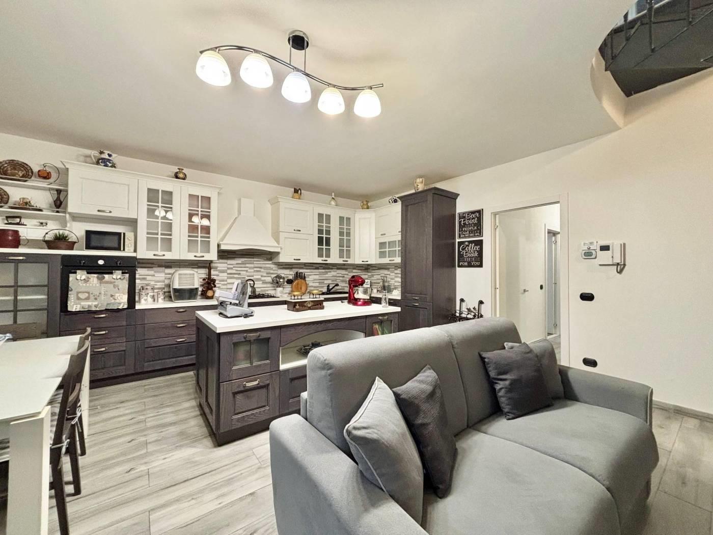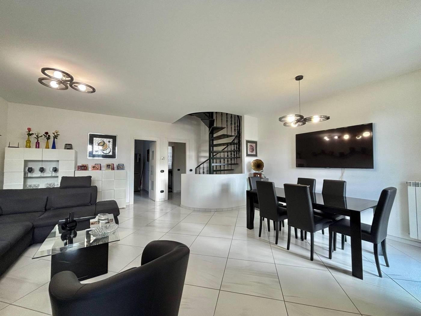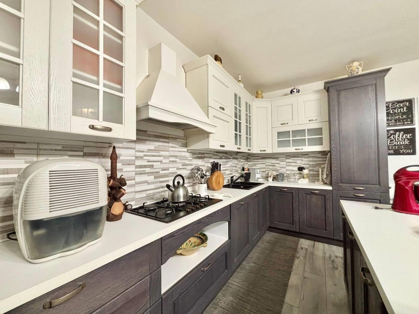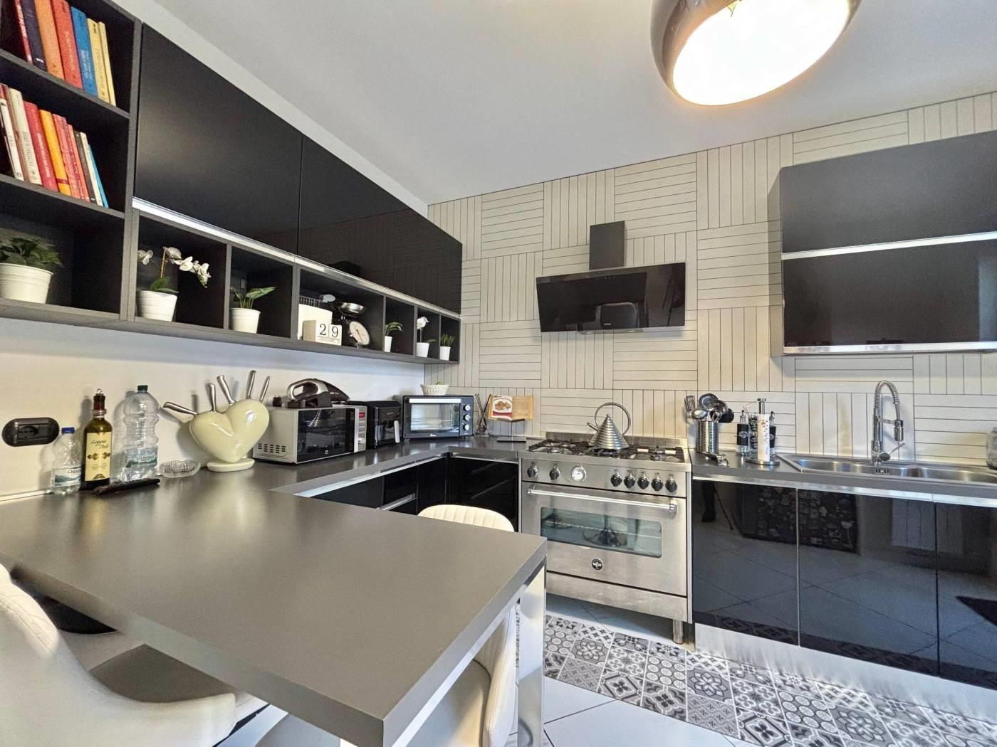 L'ingresso si apre su un soggiorno ampio e luminoso. La cucina è abitabile moderna e funzionale