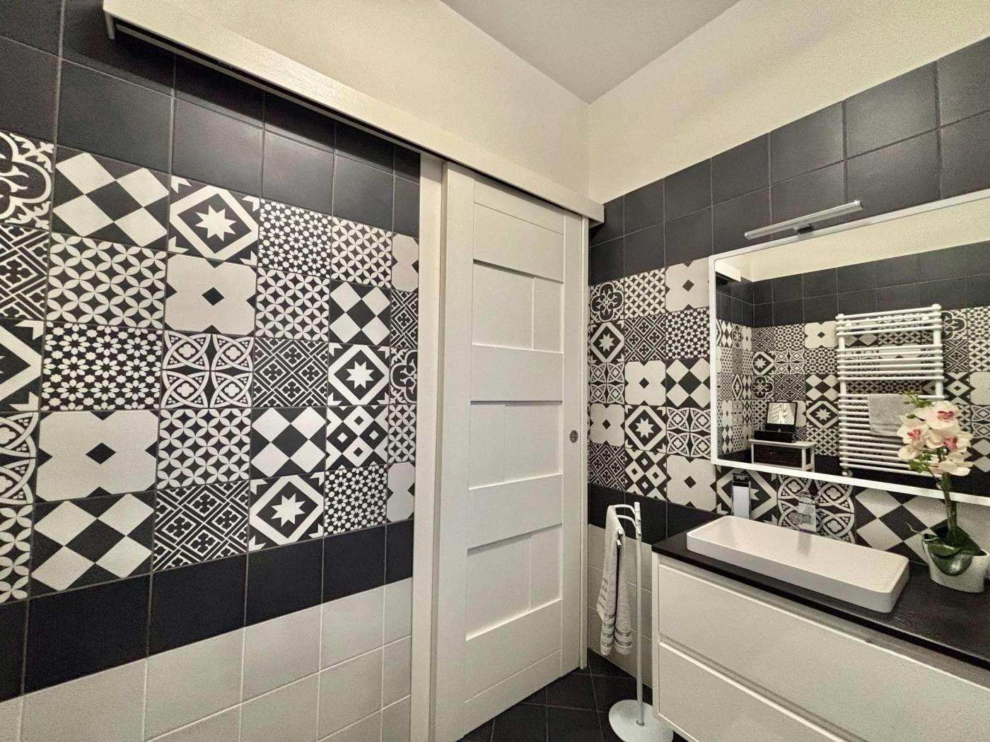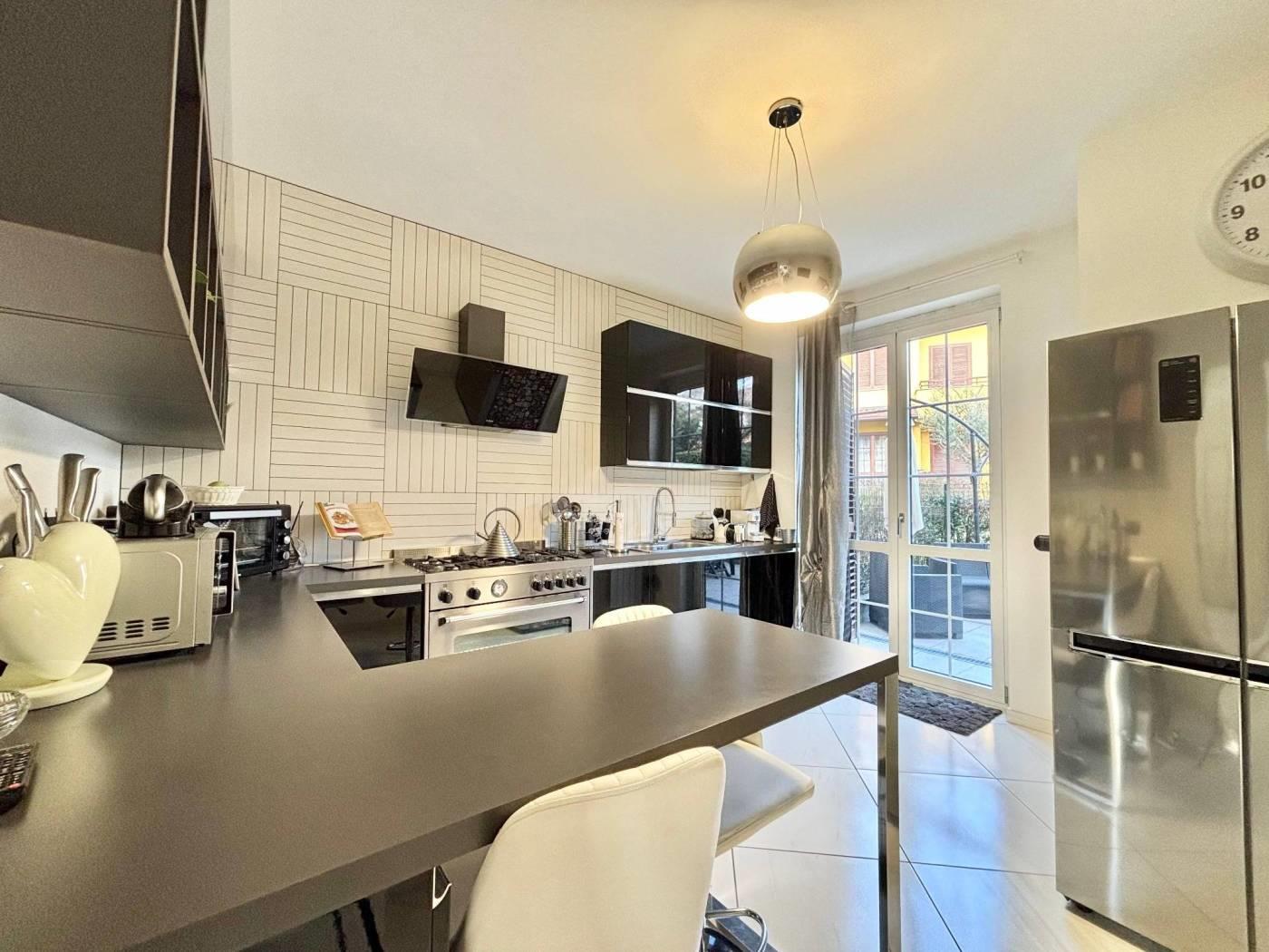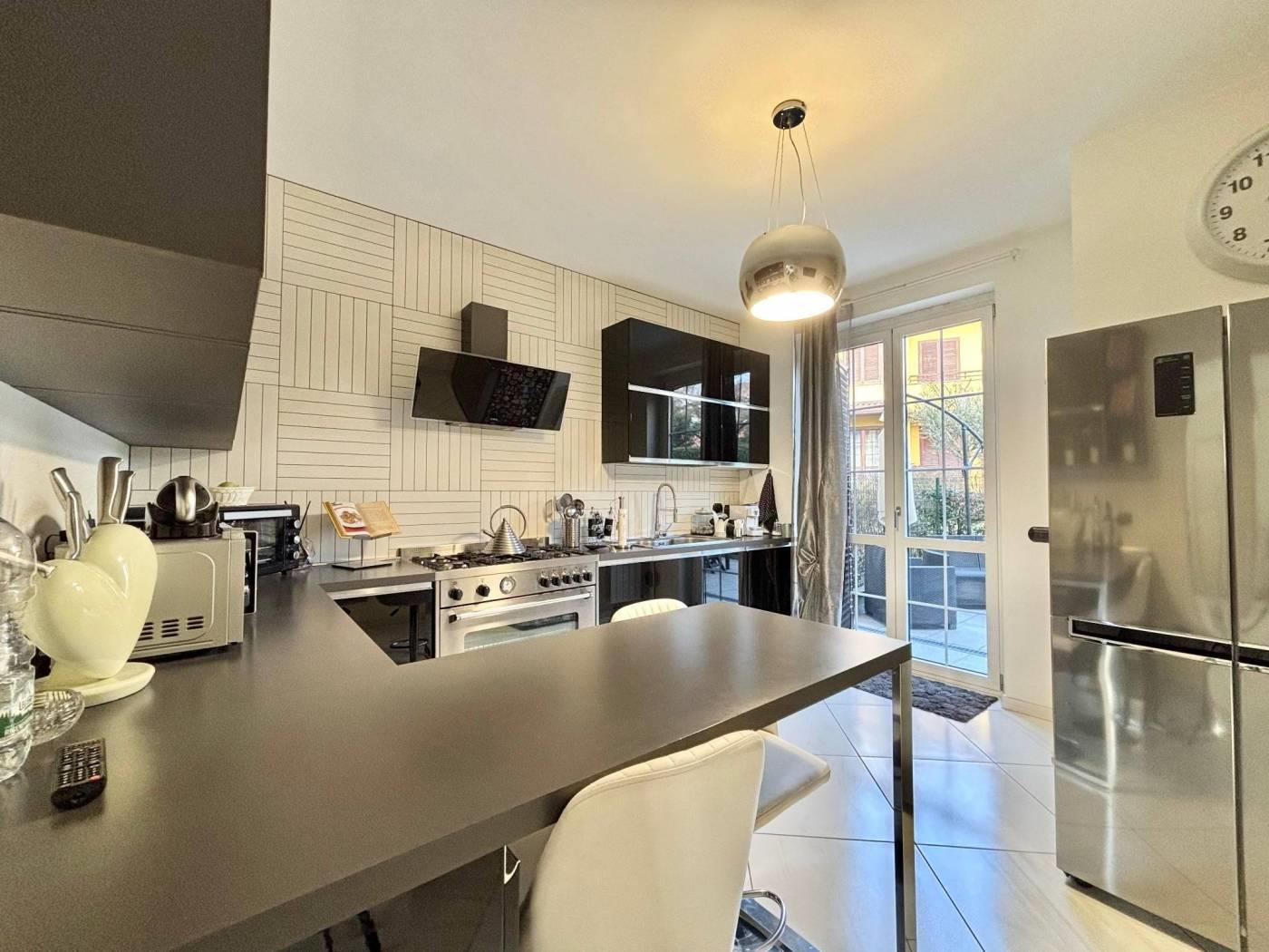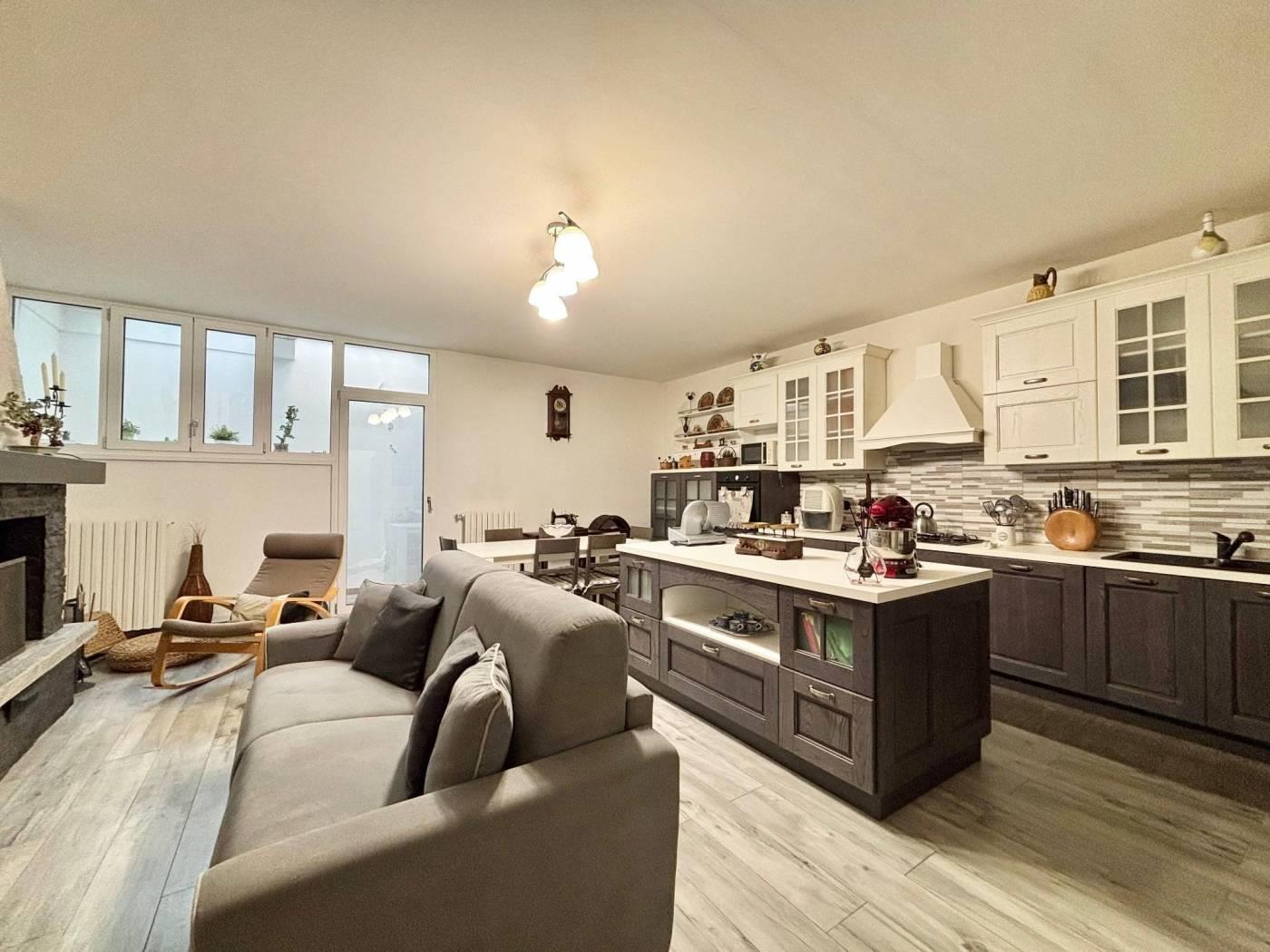 L'ingresso si apre su un soggiorno ampio e luminoso. La cucina è abitabile moderna e funzionale