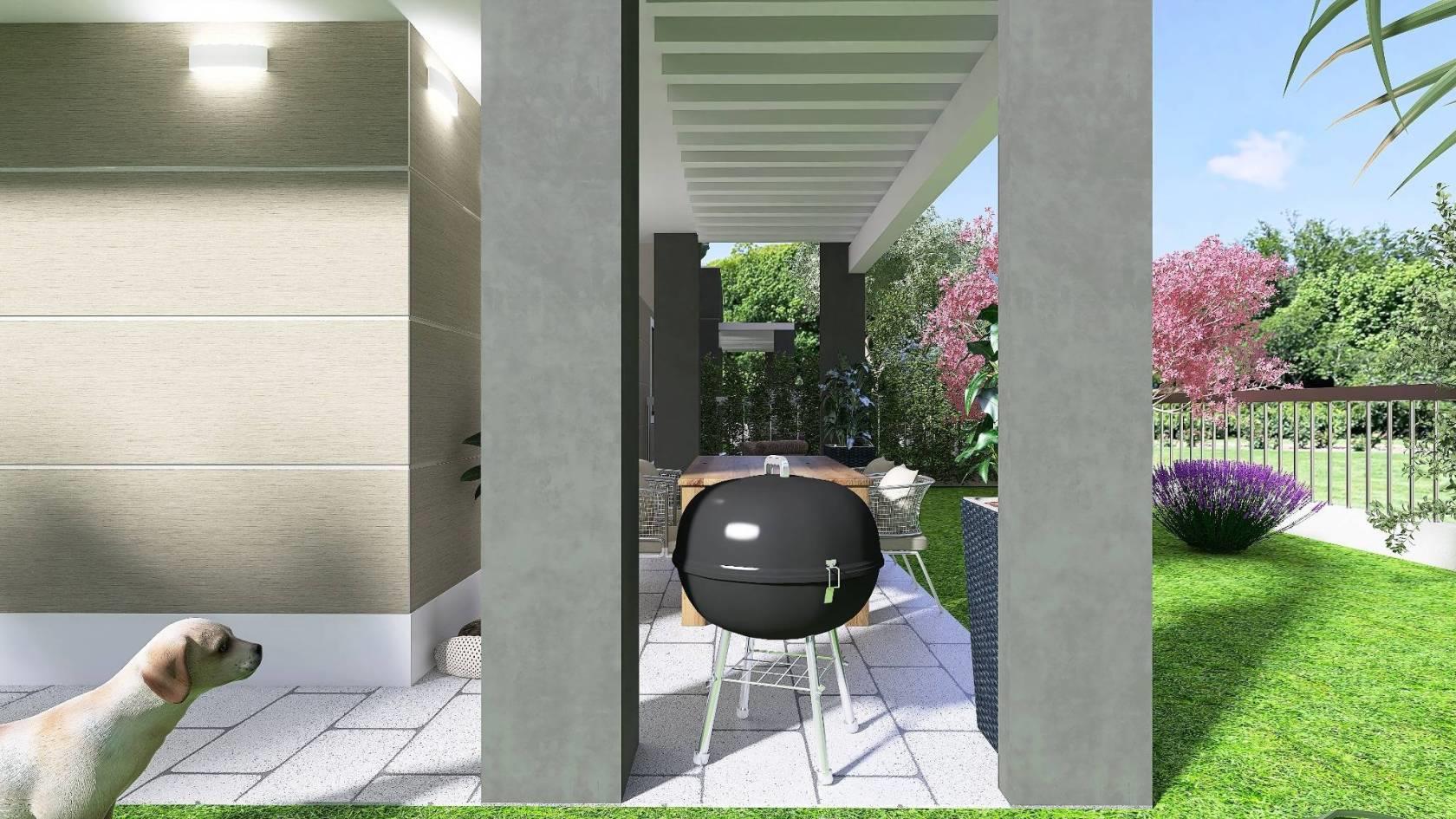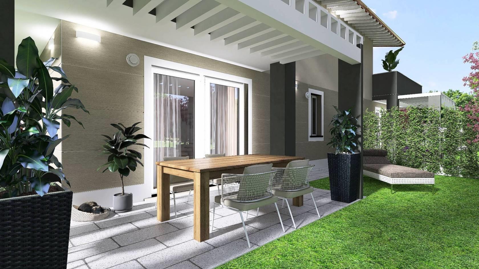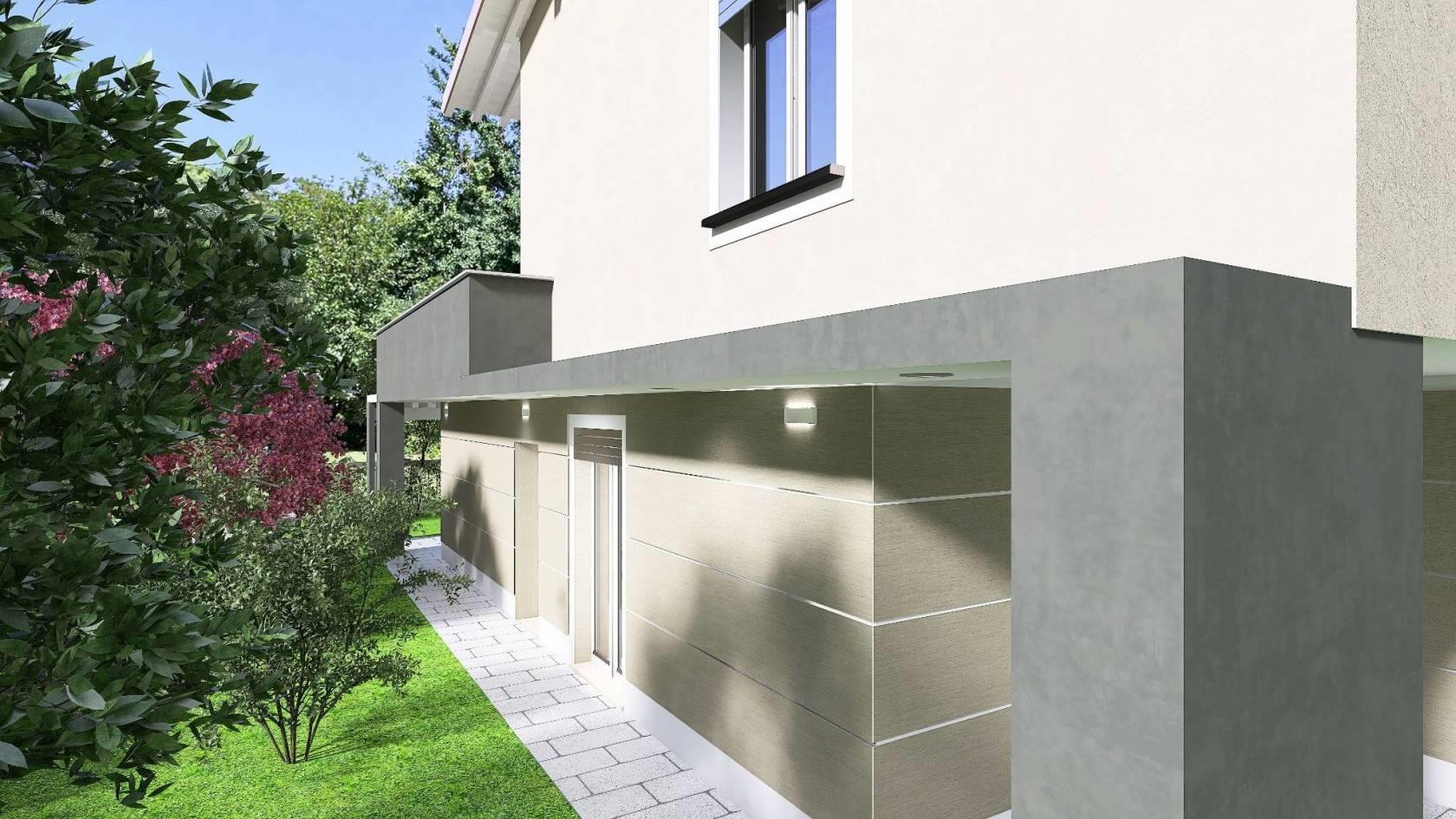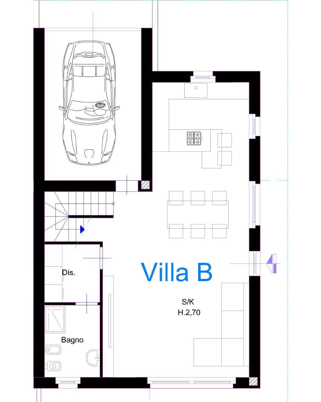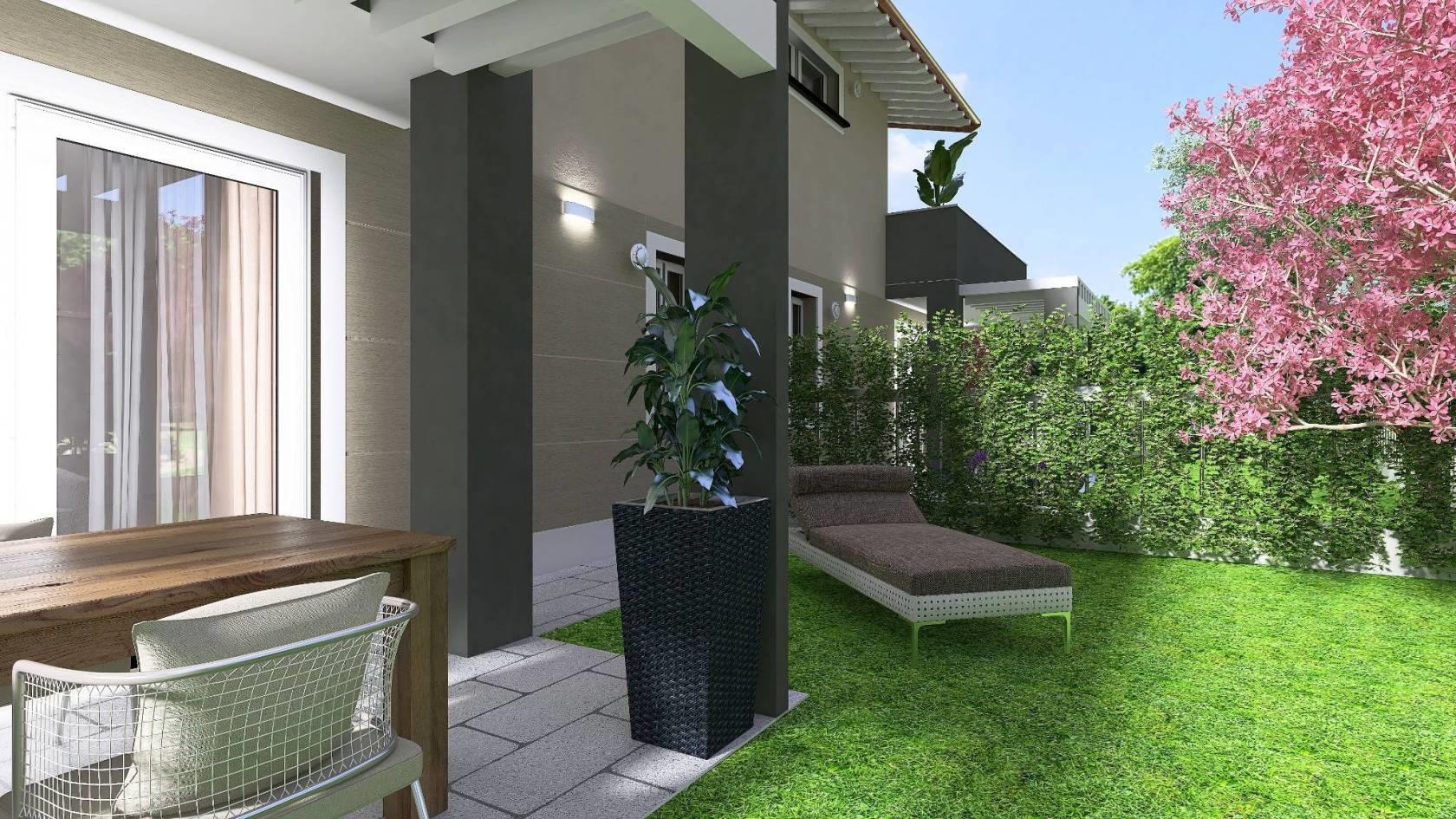 P. T. Salone con ampie vetrate, cucina abitabile (o a vista), lavanderia, bagno finestrato, GIARDINO mq 205 CON PORTICI (possibilità realizzo piscina) + box singolo mq 20. (possibilità di valutare la divisione degli spazi interni in collaborazione con la Direzione lavori).