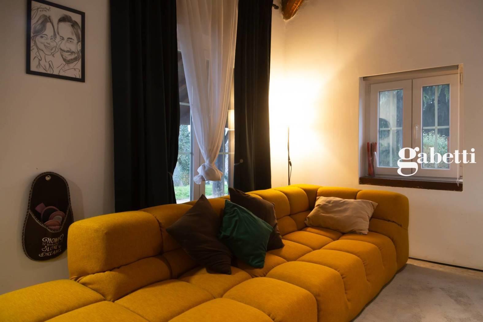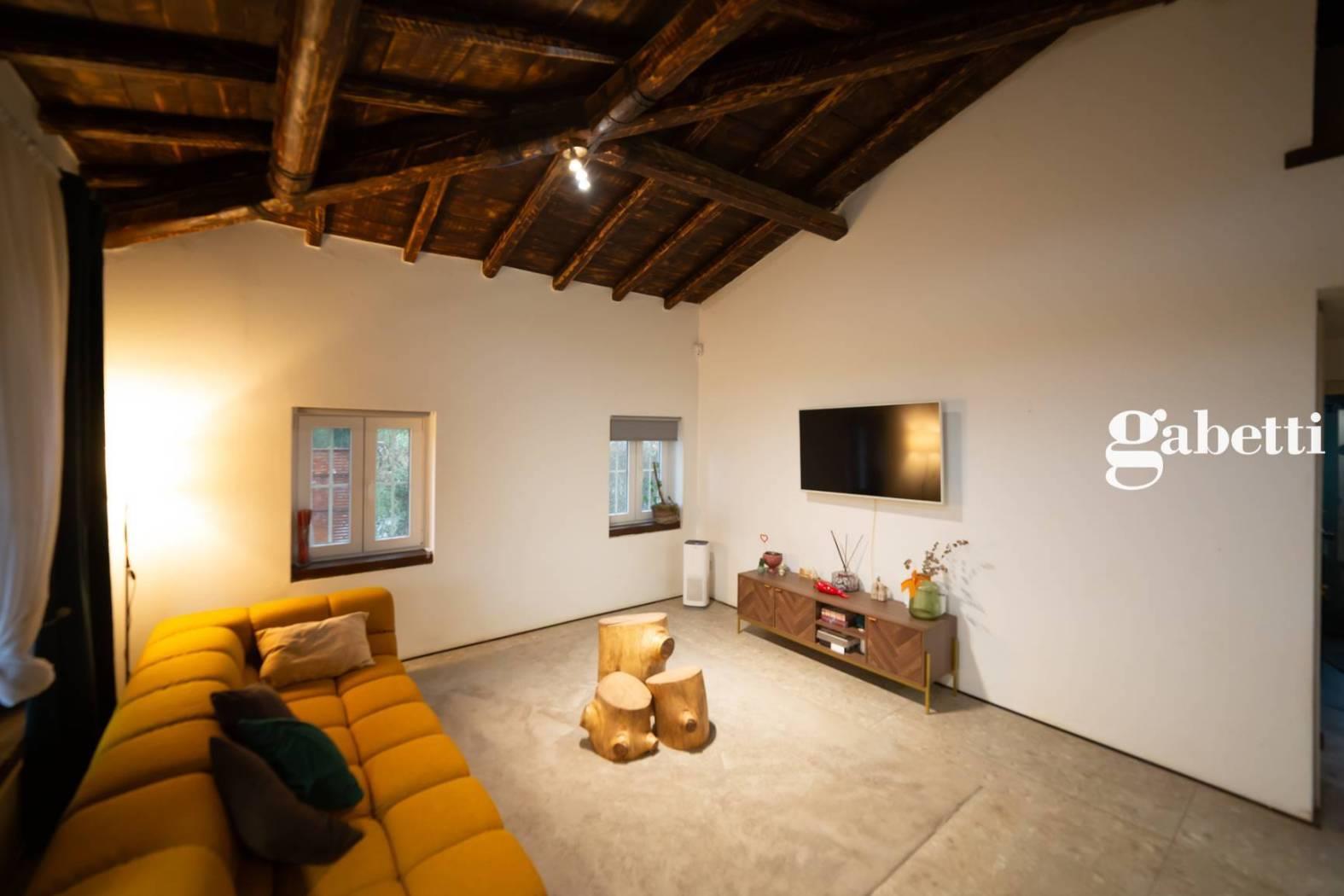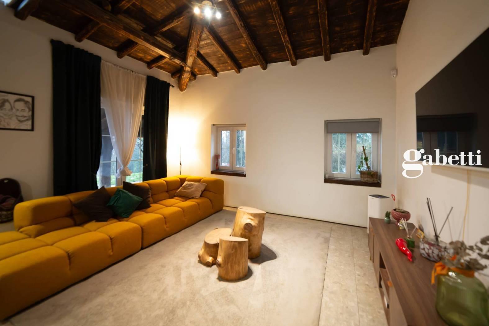 Sirtori - In piccolo residence con cancello condominiale disponiamo di villa bifamiliare disposta su un unico livello abitativo con travi a vista, soffitti a doppia altezza, circondata da 1100 mq di giardino.