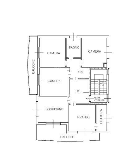 Al primo piano si sviluppa il primo appartamento quadrilocale. La zona giorno è composta da sala da pranzo e soggiorno luminosi con accesso a un ampio balcone, uno spazio perfetto per vivere momenti di relax all’aperto. La cucina è organizzata con cucinotto separato, mentre la zona notte offre tre camere da letto con uscita su un secondo balcone lungo e un bagno con vasca.
