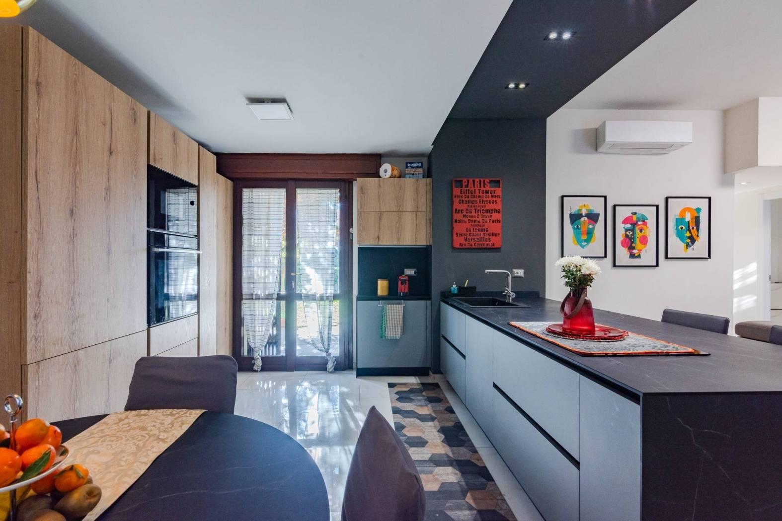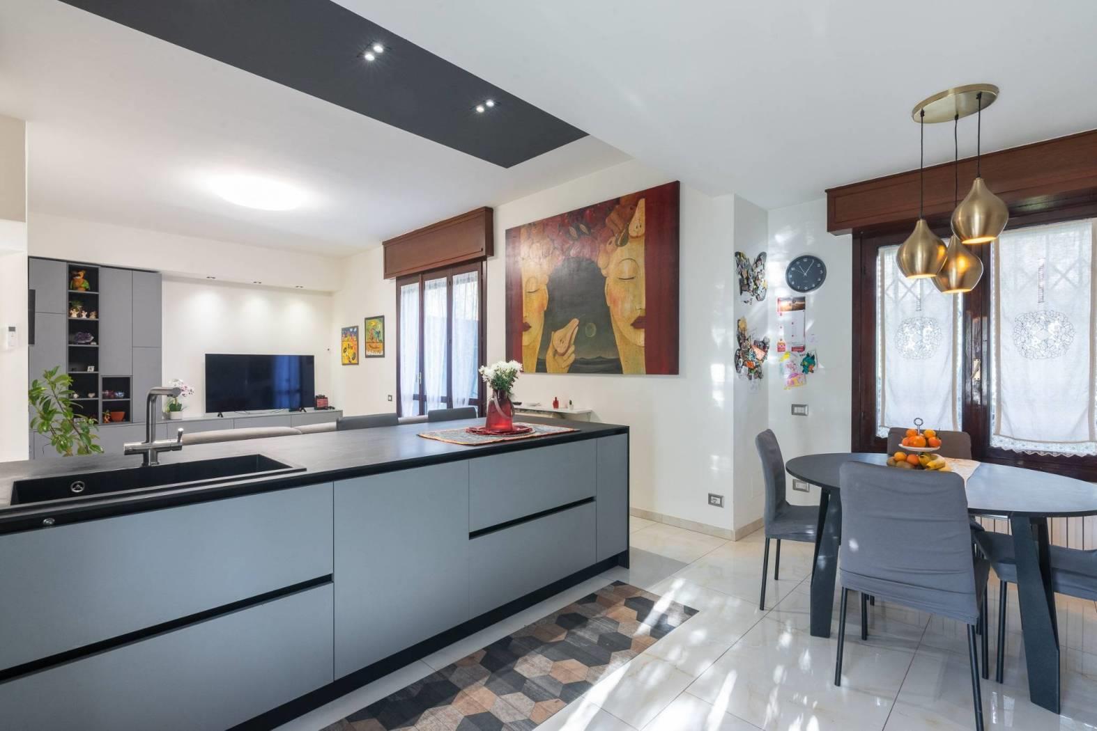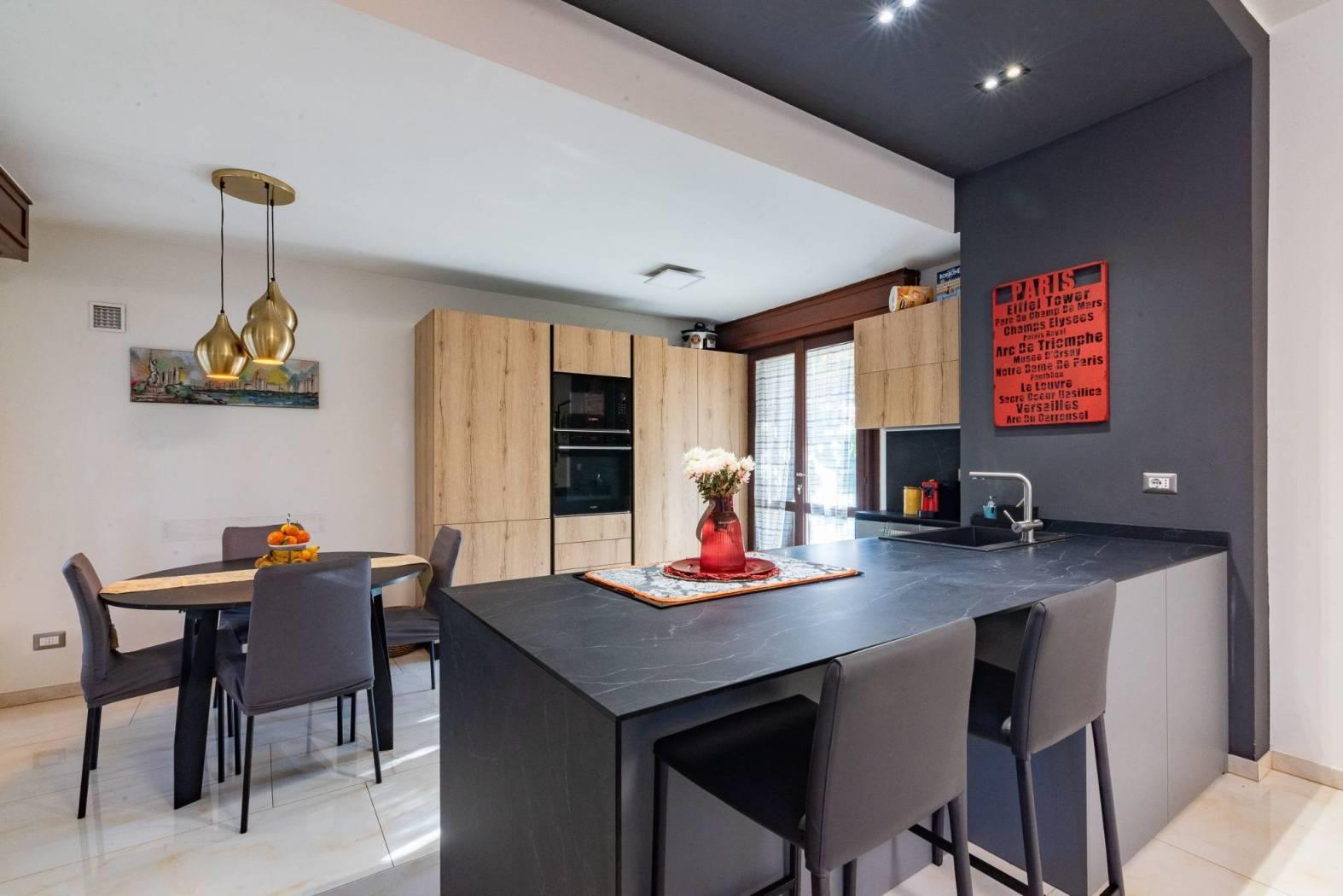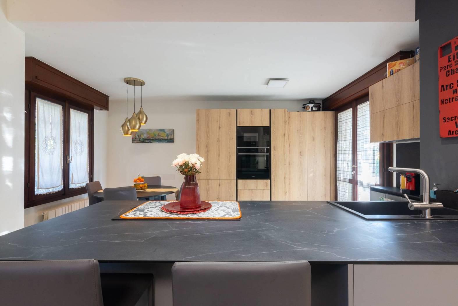 La cucina a vista con isola rappresenta l’elemento centrale della zona living: materiali contemporanei, ottima organizzazione degli spazi e una disposizione pensata per vivere la casa ogni giorno, tra momenti in famiglia e convivialità con gli ospiti.