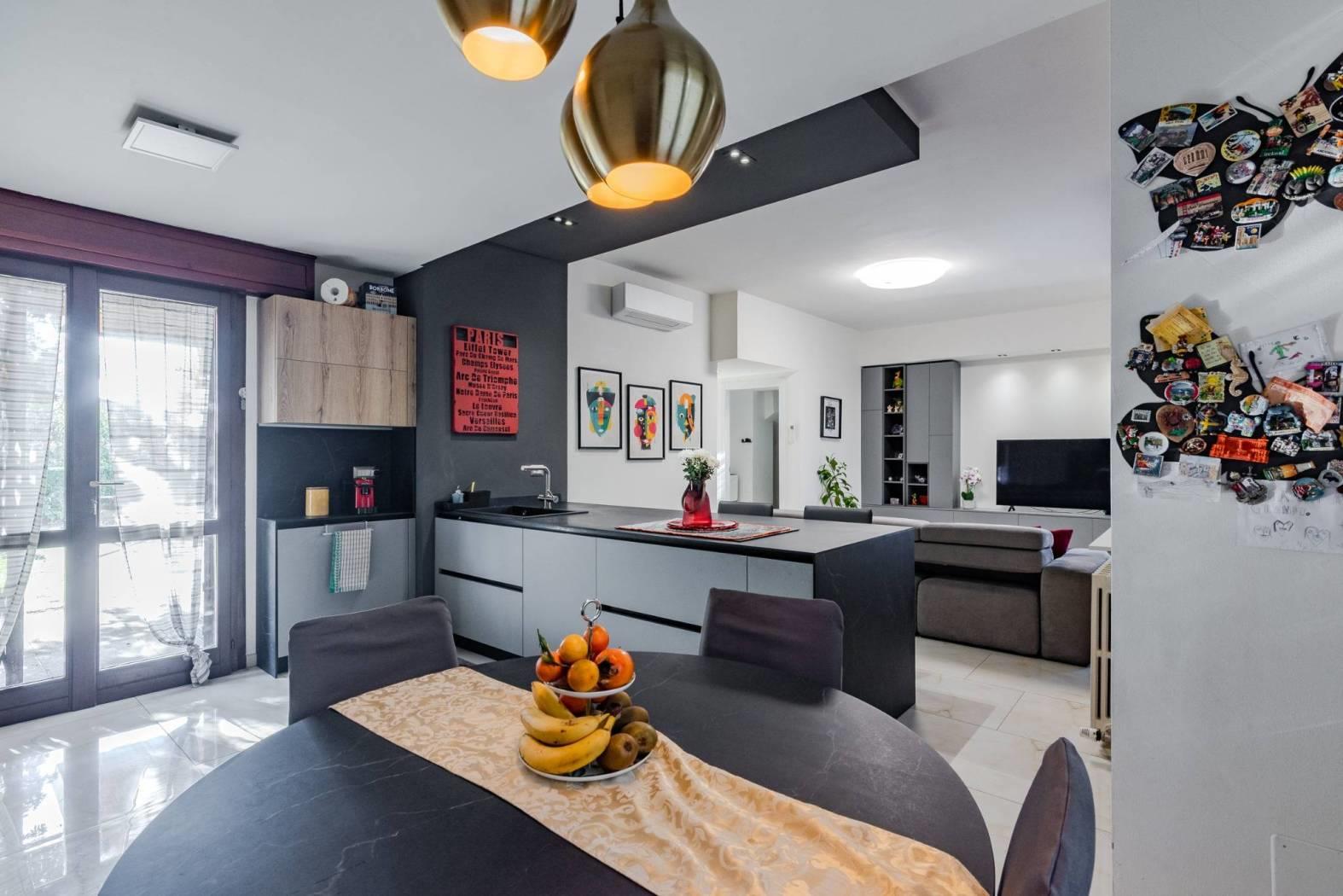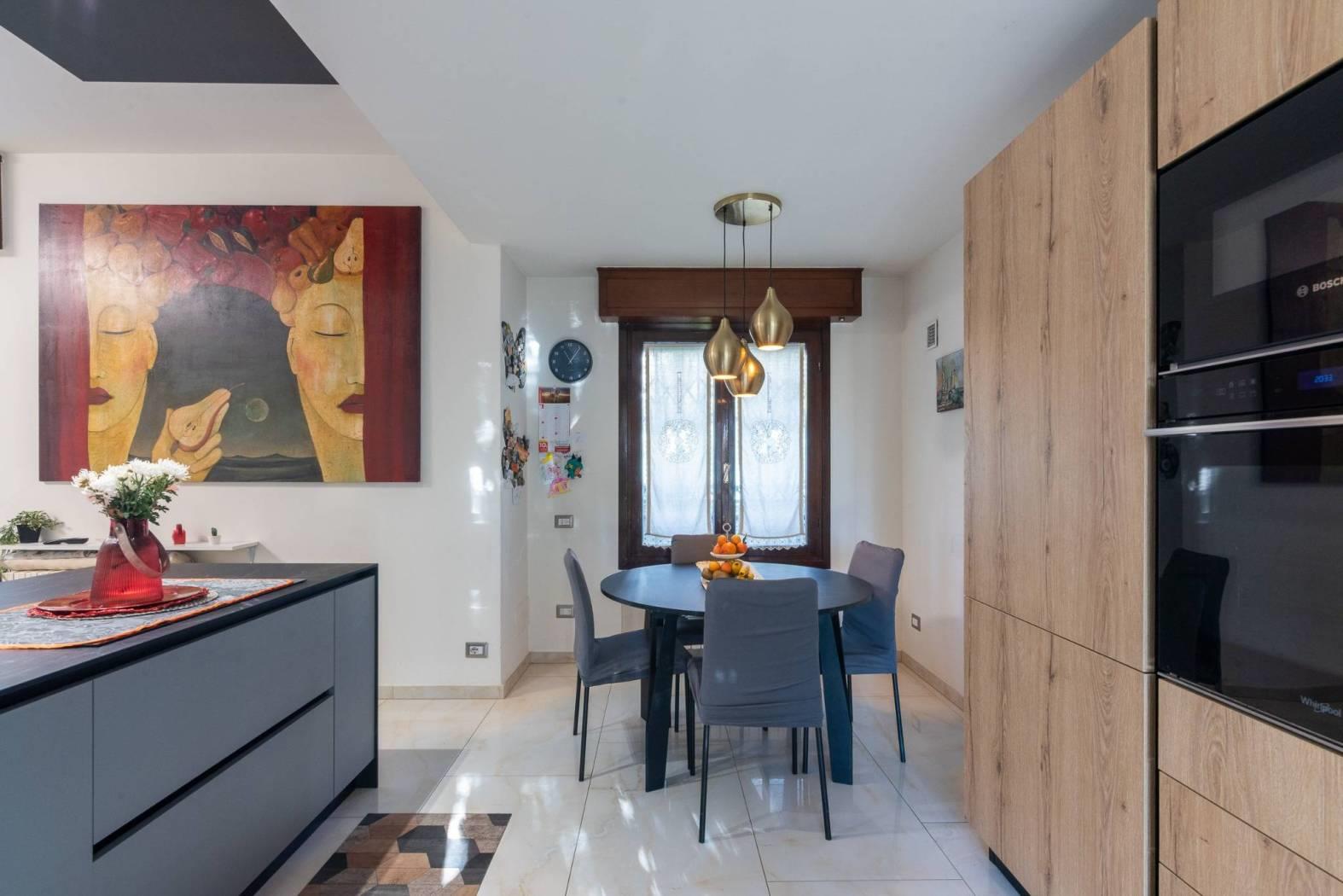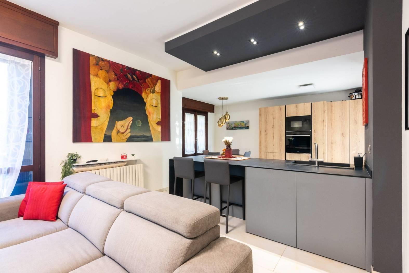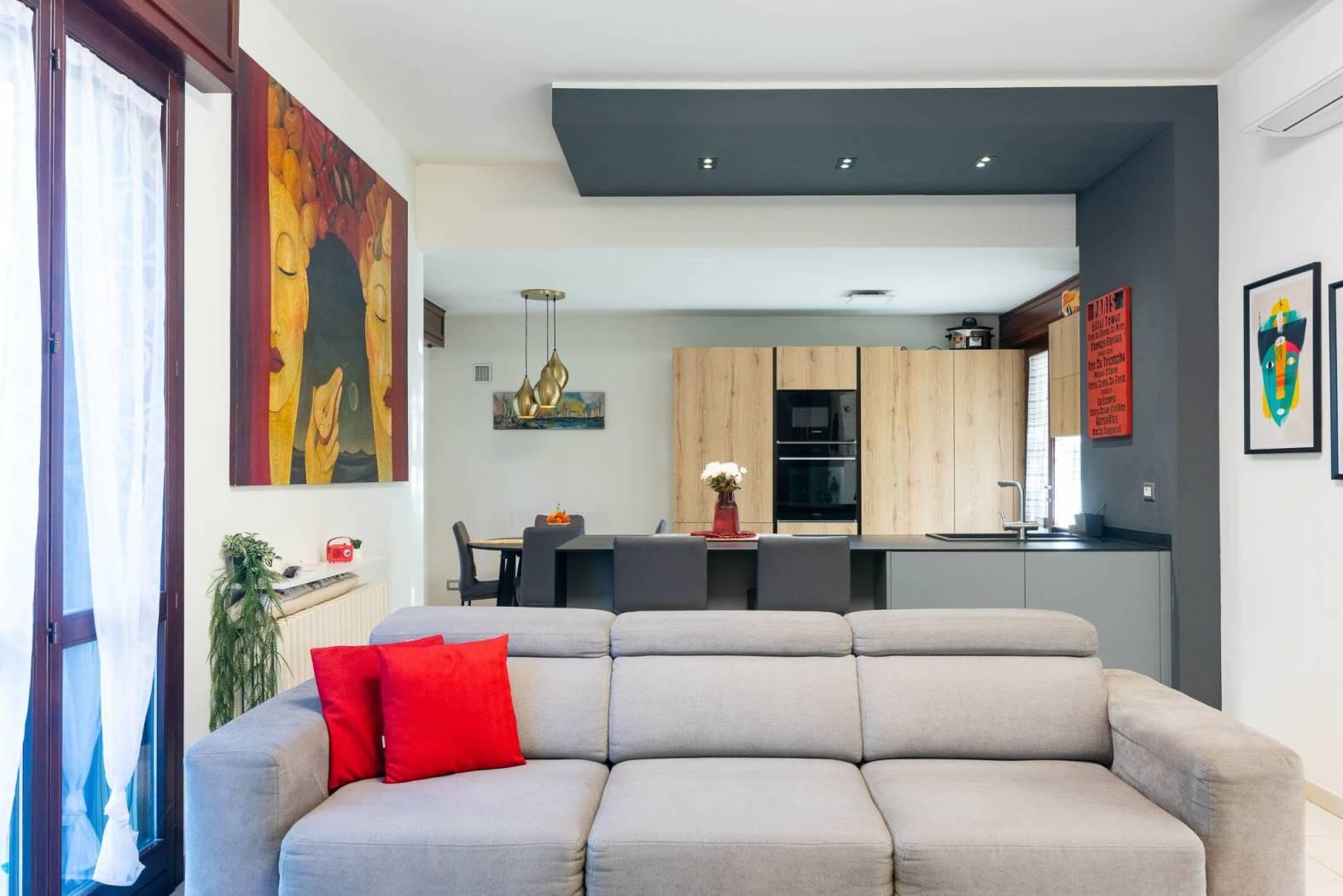 La cucina a vista con isola rappresenta l’elemento centrale della zona living: materiali contemporanei, ottima organizzazione degli spazi e una disposizione pensata per vivere la casa ogni giorno, tra momenti in famiglia e convivialità con gli ospiti.