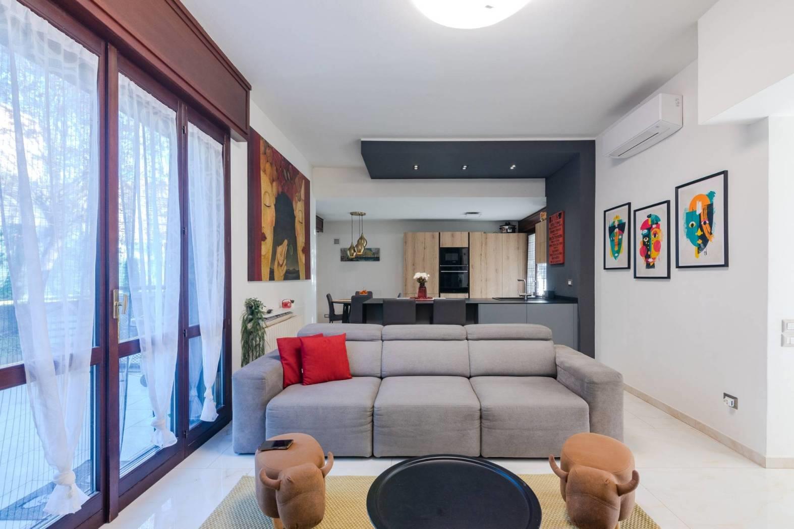 Appena varcato il portico d’ingresso, si percepisce subito l’equilibrio degli ambienti. L’ingresso, ordinato e luminoso, introduce alla zona giorno, ampia e ben distribuita, dove soggiorno e cucina dialogano in modo naturale creando uno spazio conviviale e moderno.