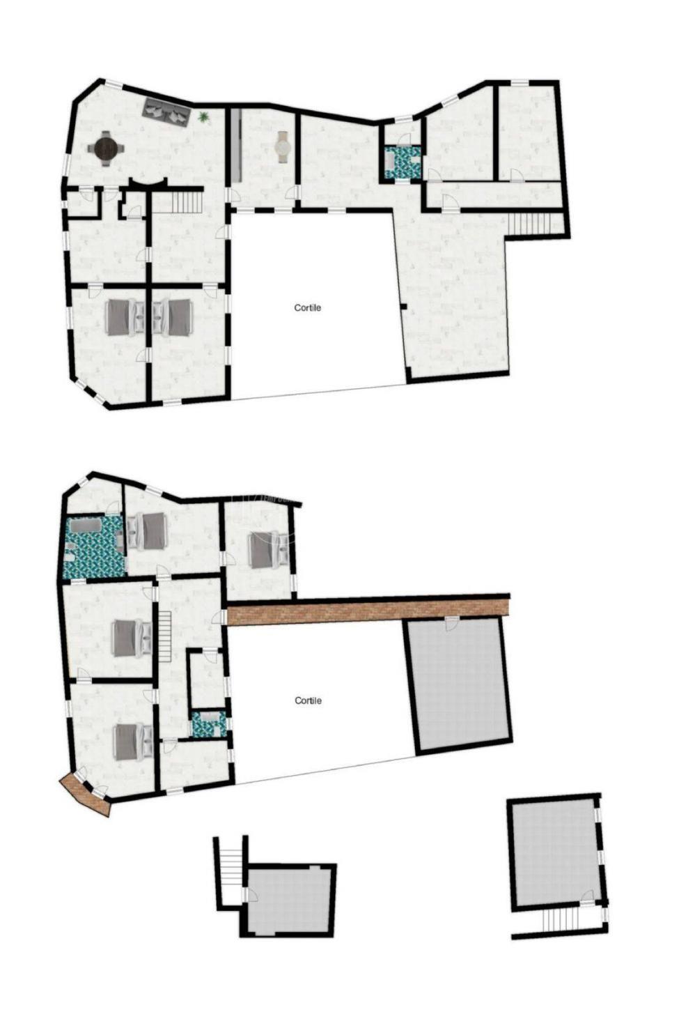 La struttura si sviluppa su due livelli principali, più una parte sottostante, e si presenta con una pianta a ferro di cavallo che abbraccia un CORTILE INTERNO completamente privato, silenzioso e protetto.