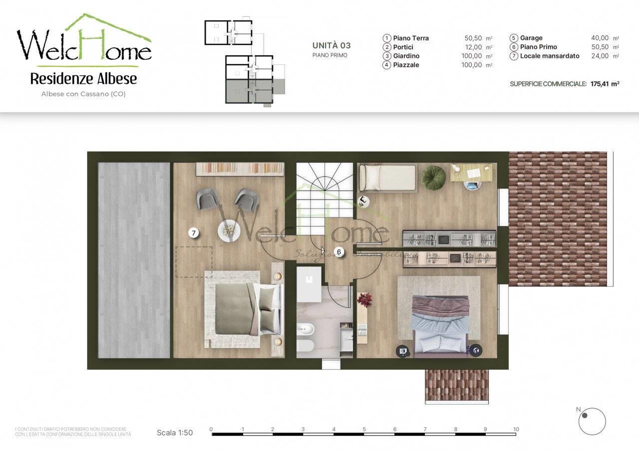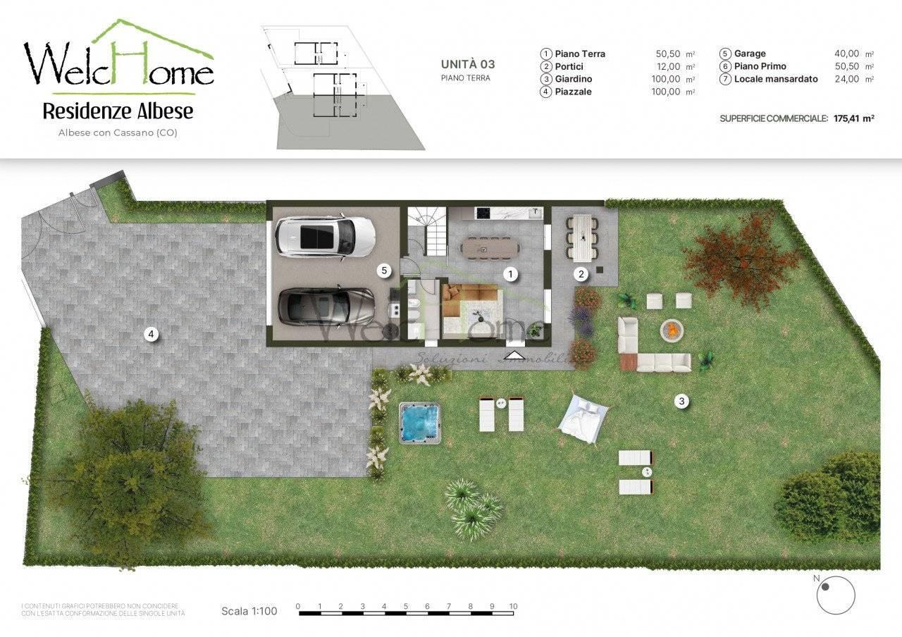 Albese con Cassano, posta al termine di una via a fondo cieco della zona centrale del paese, quindi tranquilla ma comoda con tutti i servizi, proponiamo interessante porzione di villetta bifamiliare di testa di nuova costruzione caratterizzata da un'architettura classica.