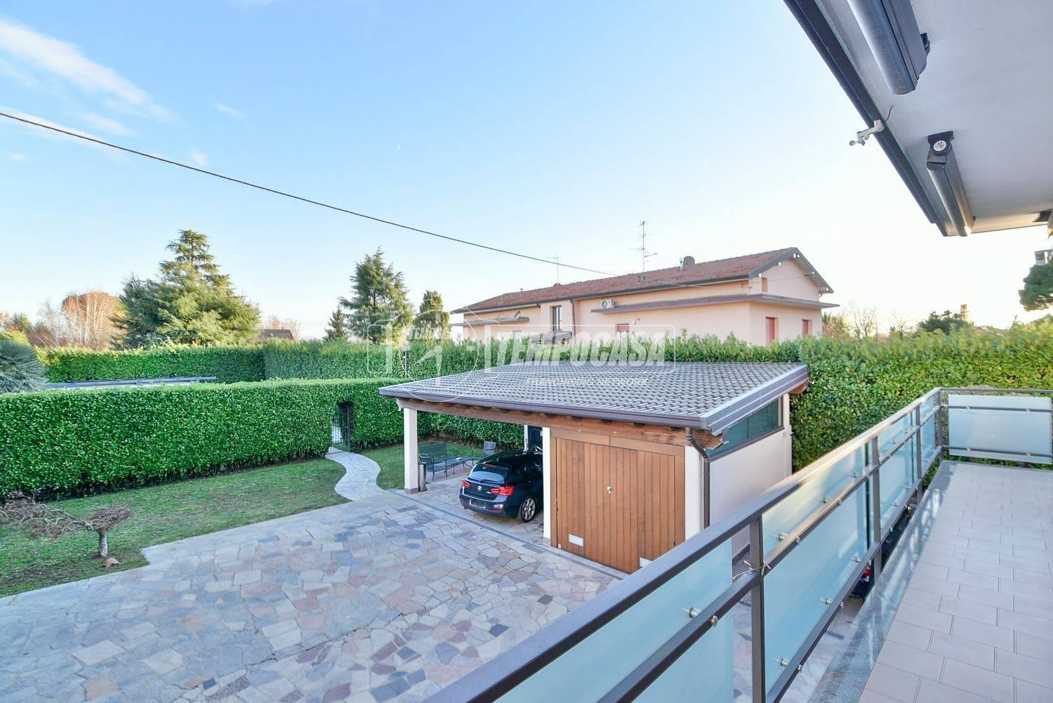 La villa dispone inoltre di un box auto e di una tettoia coperta per ulteriori due macchine, garantendo spazio e praticità a tutta la famiglia.