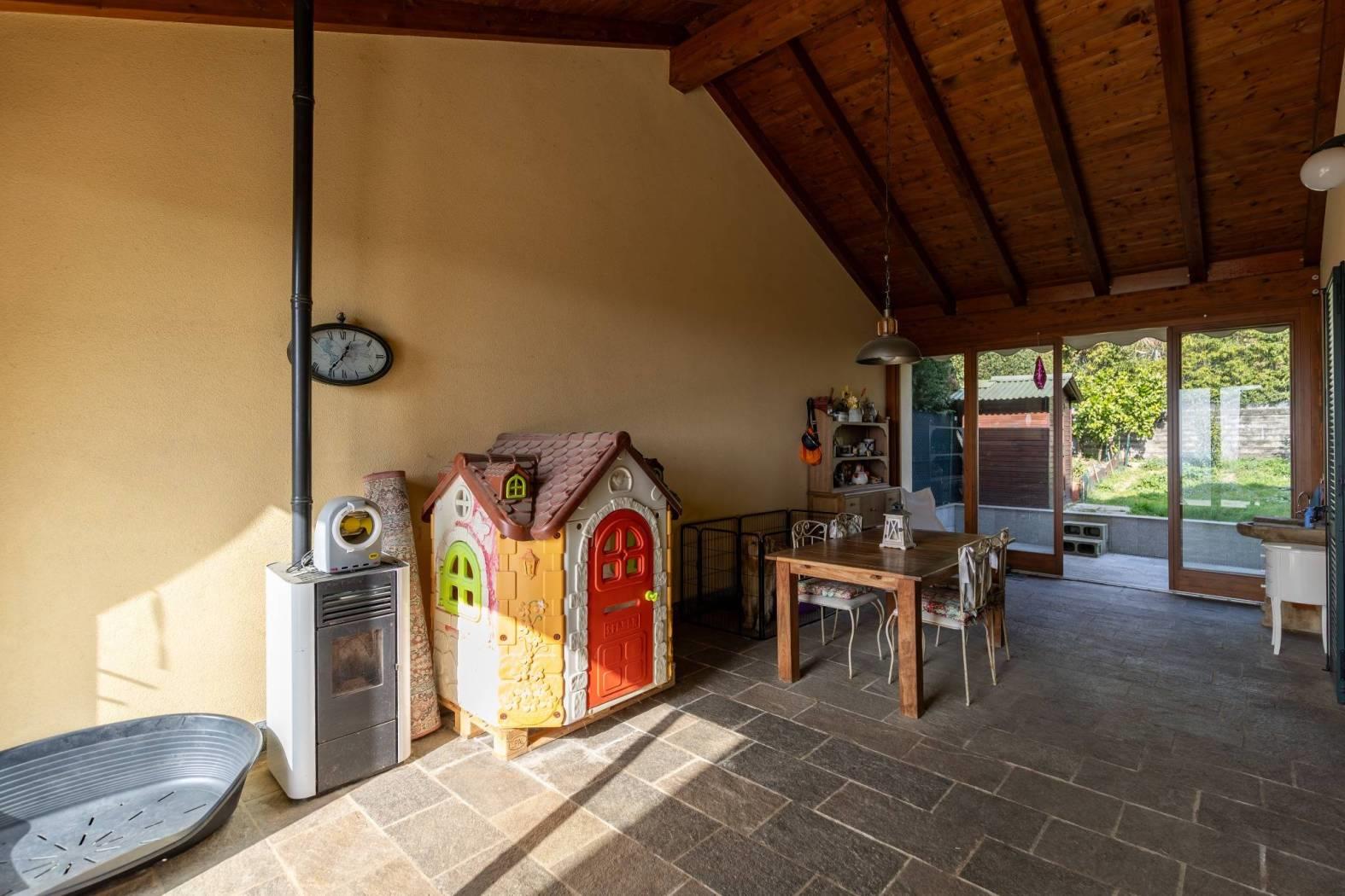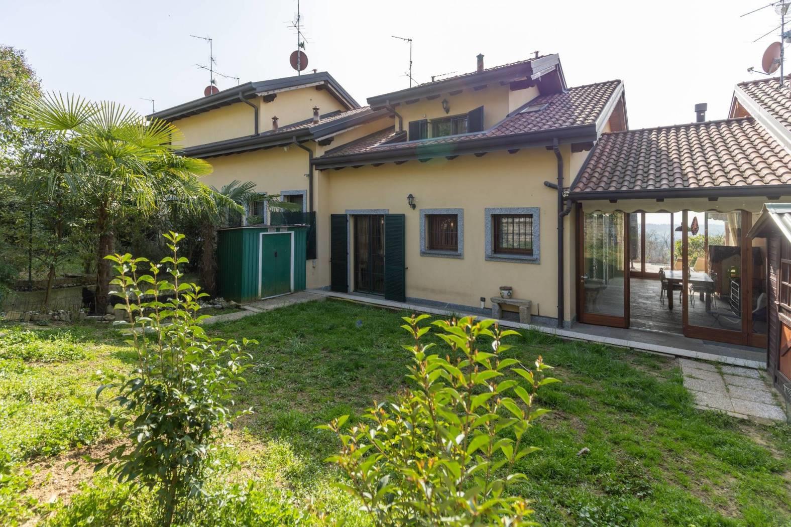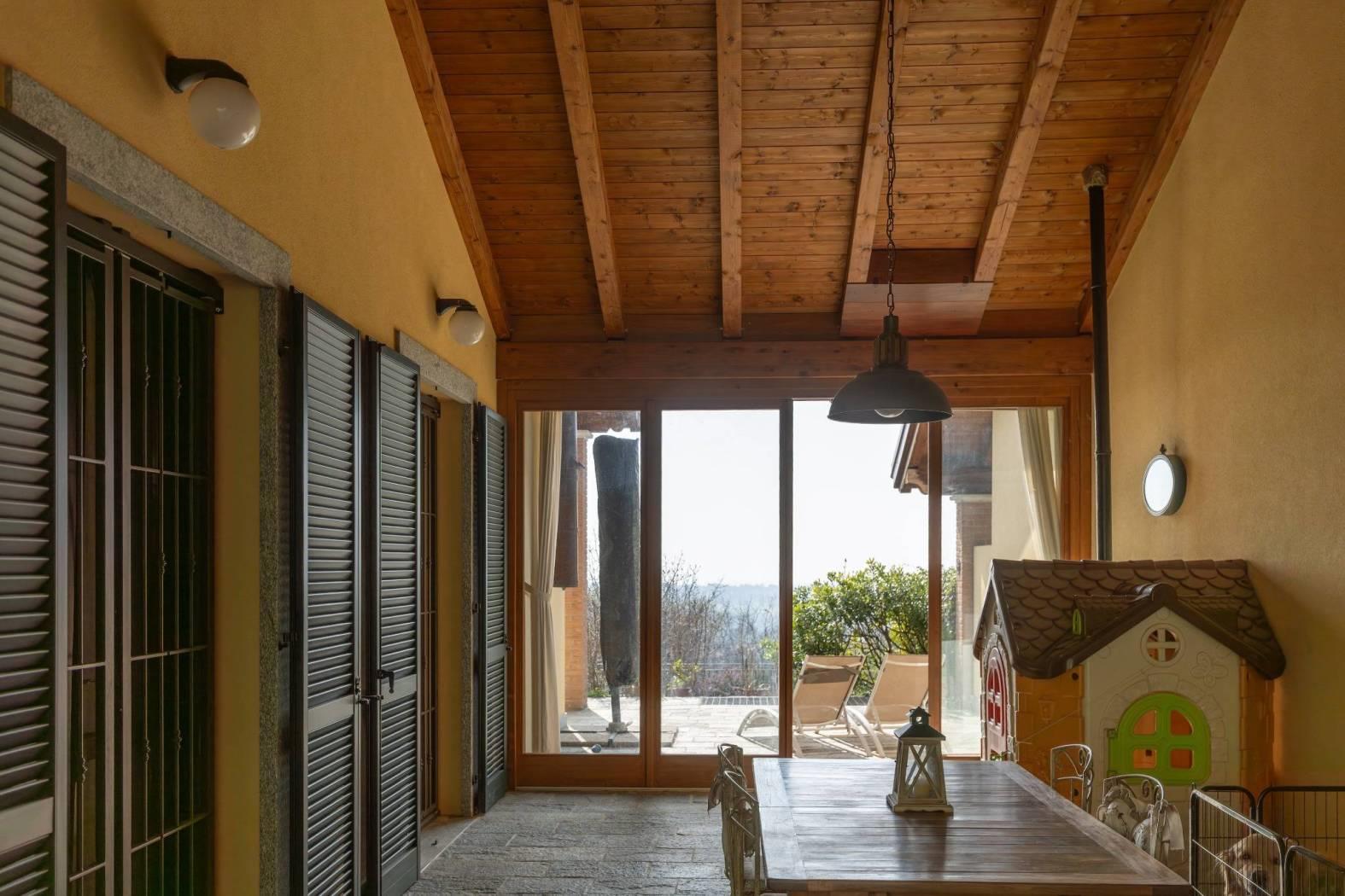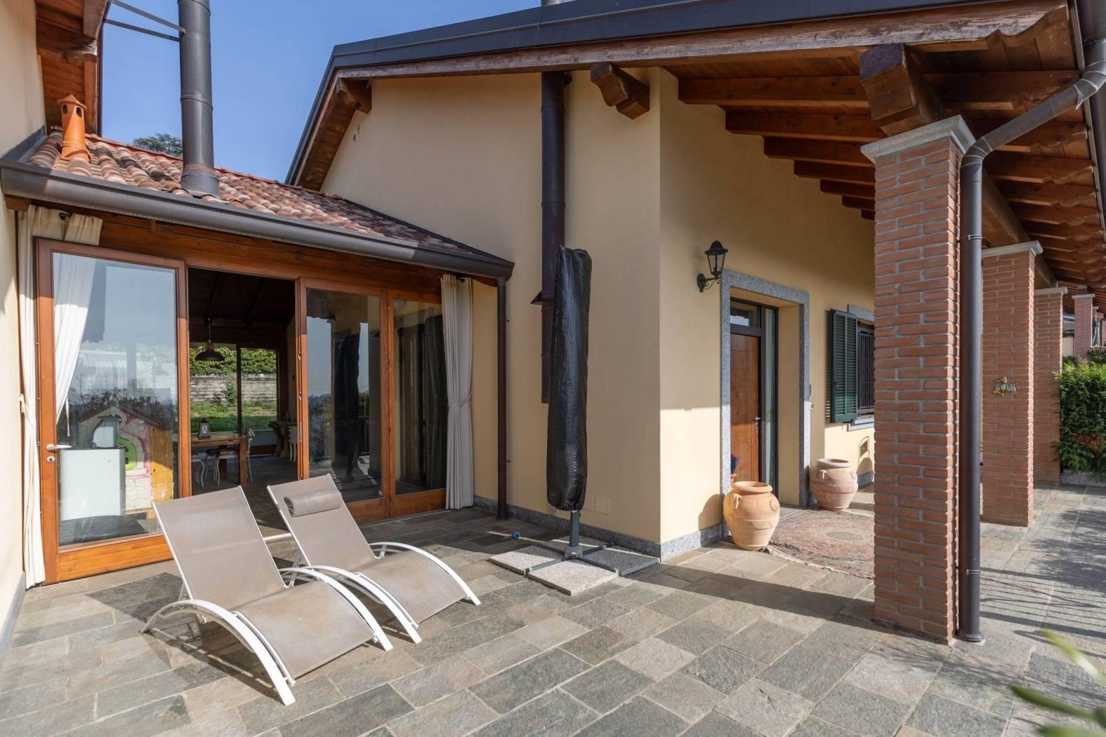 Vigano' alta ai confini con Barzano', in posizione panoramica e nel verde , contesto residenziale, recente e splendida villa che si sviluppa su due piani fuori terra oltre al piano seminterrato con portico a vetrate, portici, terrazzi ubicati su entrambi i piani e giardino privato su due lati. la villa si distingue per la perfetta combinazione tra comfort moderno e valorizzazione dell'ambiente. l'ingresso si apre su un ampio soggiorno luminoso con stufa a legna in maiolica e una cucina abitabile, entrambi godono dell'affaccio sul portico con vetrate e travi a vista perfetto per momenti di relax oltre ai terrazzi fronte e retro, locali ideali per vivere e accogliere in spazi conviviali e raffinati. un disimpegno con arredo su misura conduce al bagno completo di sanitari sospesi e mosaico di rivestimento e studio con affaccio sul giardino privato riservato. una scala interna accompagna al piano mansardato, dove si sviluppa la zona notte composta da due camere e un secondo bagno. la doppia altezza della camera , le travi a vista e la doppia esposizione donano all'abitazione ambienti luminosi ed un carattere architettonico distintivo, impreziositi da ottime finiture interne. nello specifico la cameretta affaccia dalla porta finestra sul terrazzo a pozzo con fantastica vista sulla catena del monte rosa, camera matrimoniale con doppia copertura sfalsata ed affaccio sul terrazzino vista collina e bagno con pavimentazione parquet/ ceramica di piccole piastrelle. il piano seminterrato e' composta da ampia taverna tutta pavimentata con parquet , locale studio, lavanderia e bagno completo. box doppio in larghezza con basculante automatizzata.
