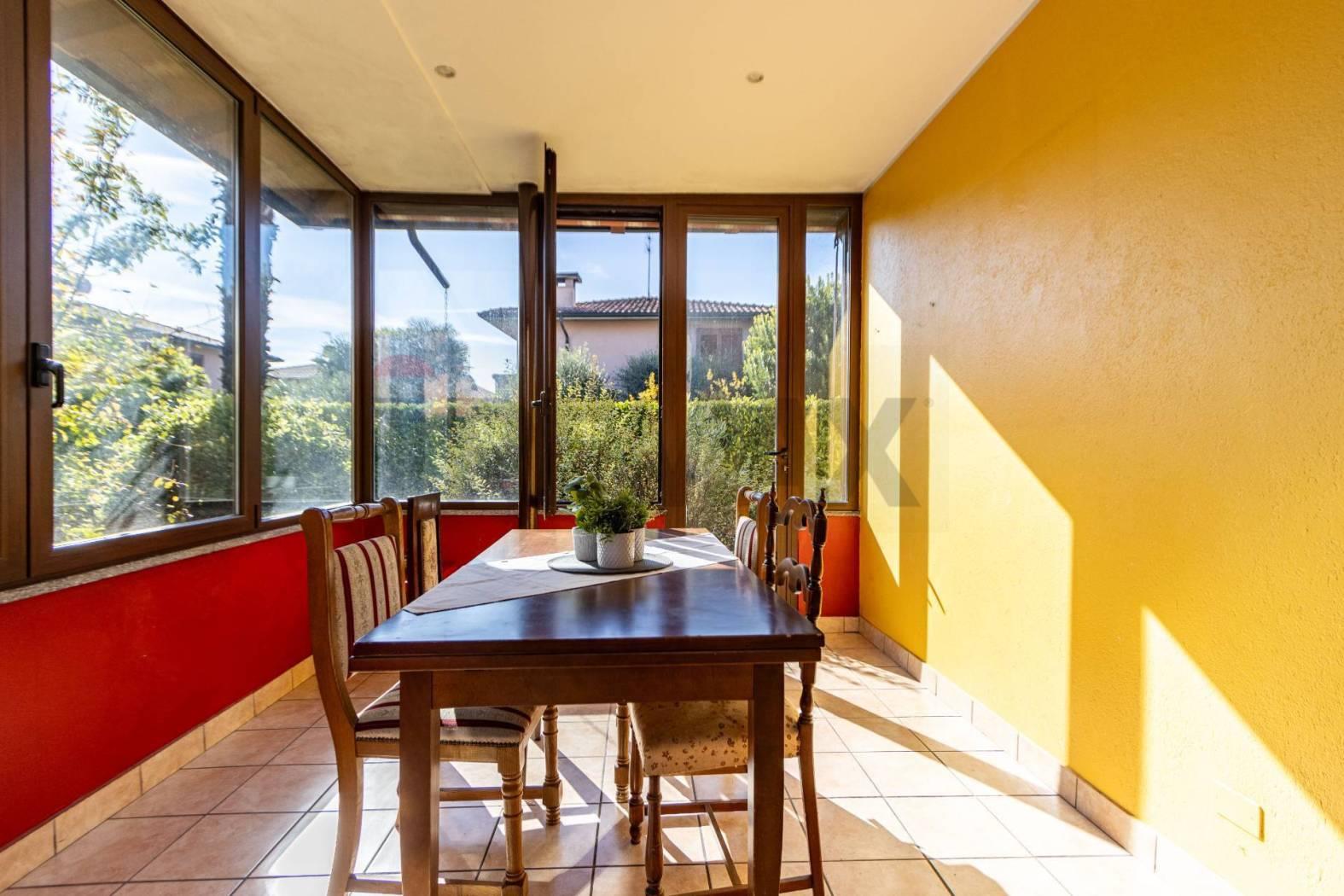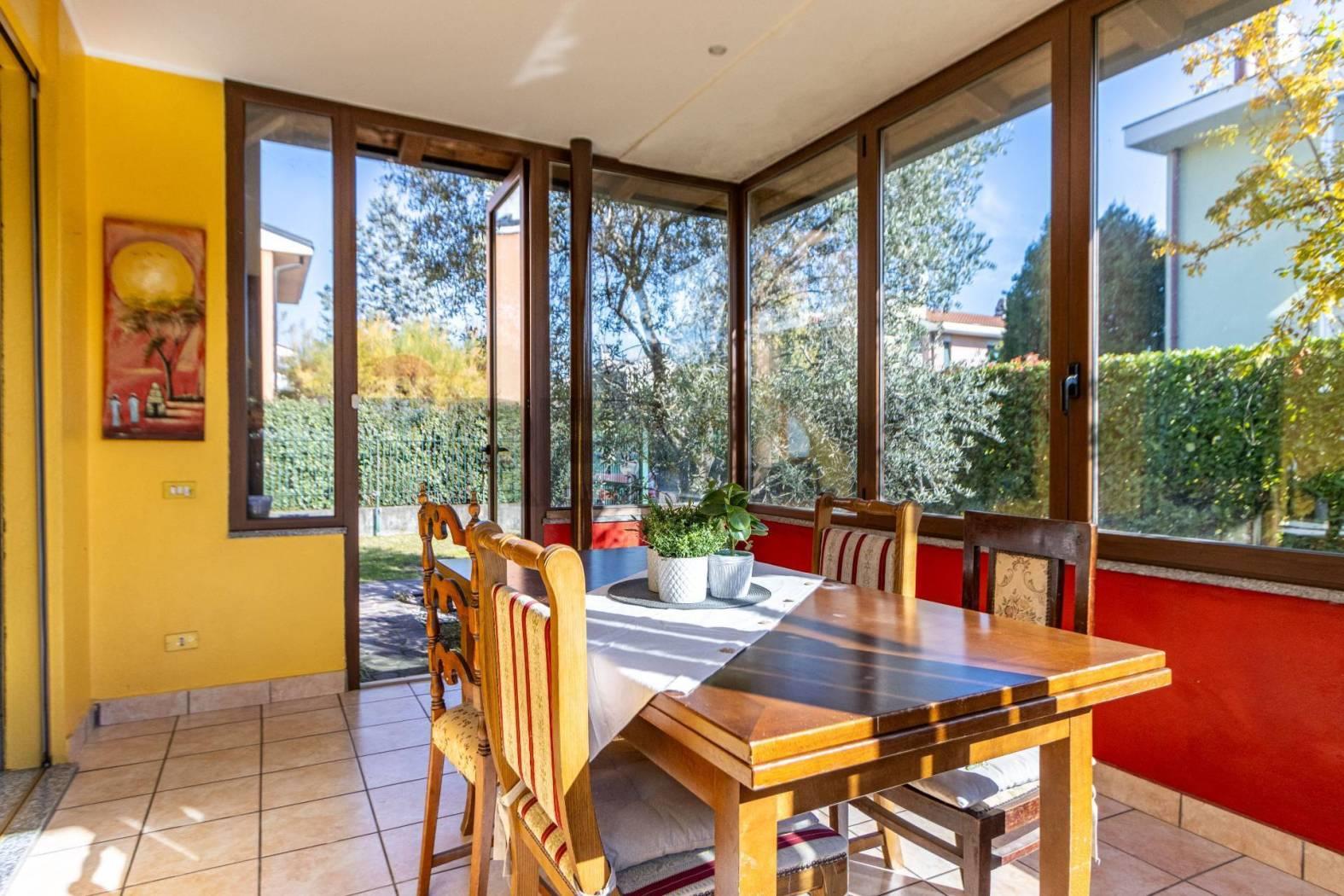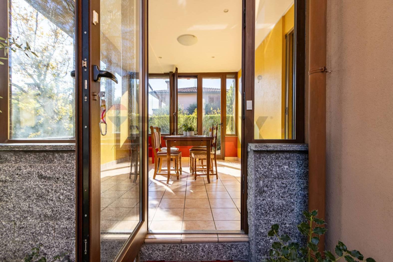In zona residenziale, in complesso di Ville Singole, ampia ed elegante soluzione con ingresso pedonale e carraio privato, composta da ingresso in spaziosa zona giorno con soggiorno diretto a veranda con vetrate che creano continuità tra interno ed esterno come un giardino di inverno, zona living con cucina e finestra diretta al portico coperto che si estende su un patio in legno e bagno di servizio al piano.