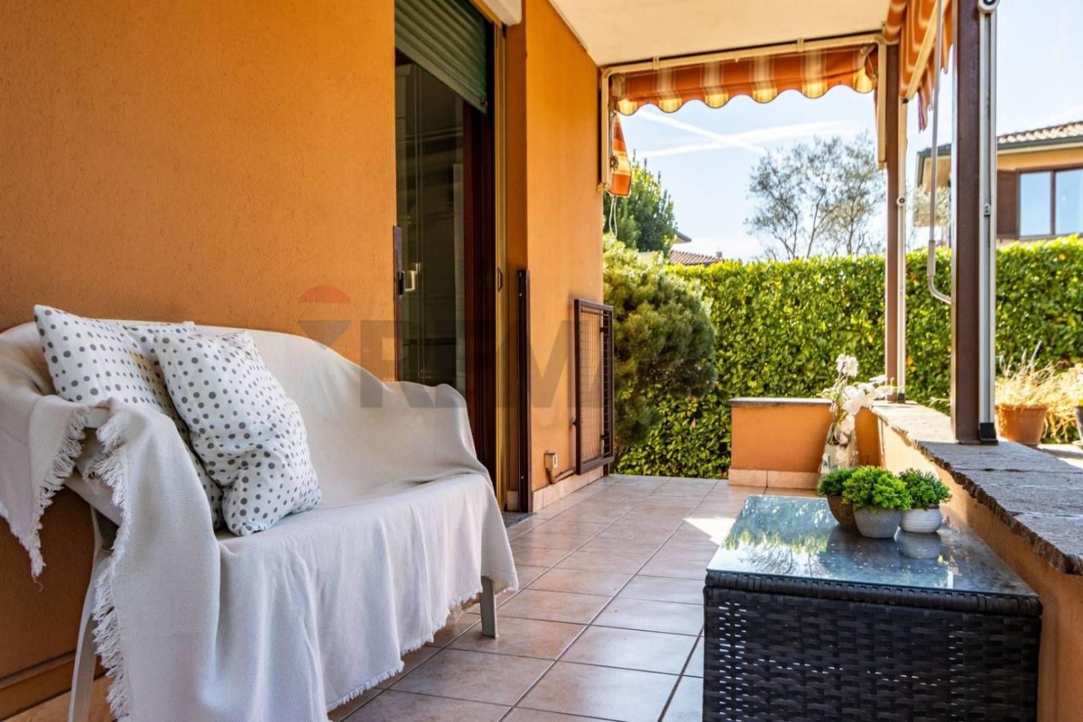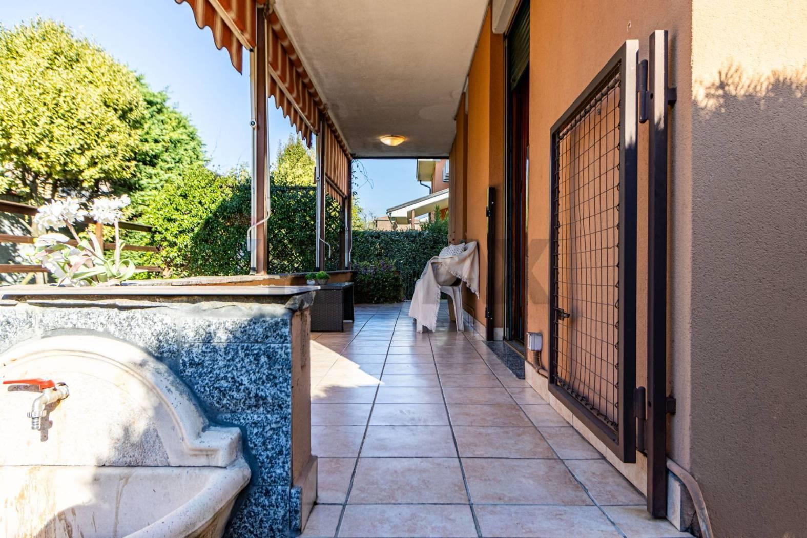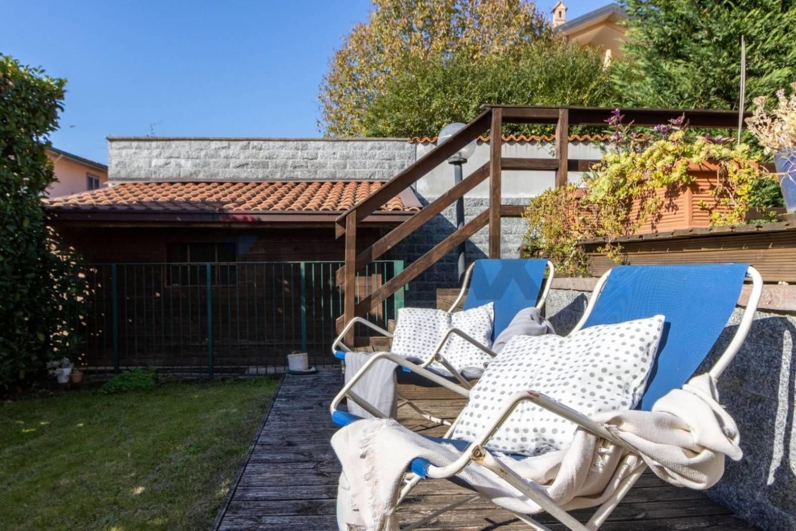 In zona residenziale, in complesso di Ville Singole, ampia ed elegante soluzione con ingresso pedonale e carraio privato, composta da ingresso in spaziosa zona giorno con soggiorno diretto a veranda con vetrate che creano continuità tra interno ed esterno come un giardino di inverno, zona living con cucina e finestra diretta al portico coperto che si estende su un patio in legno e bagno di servizio al piano.