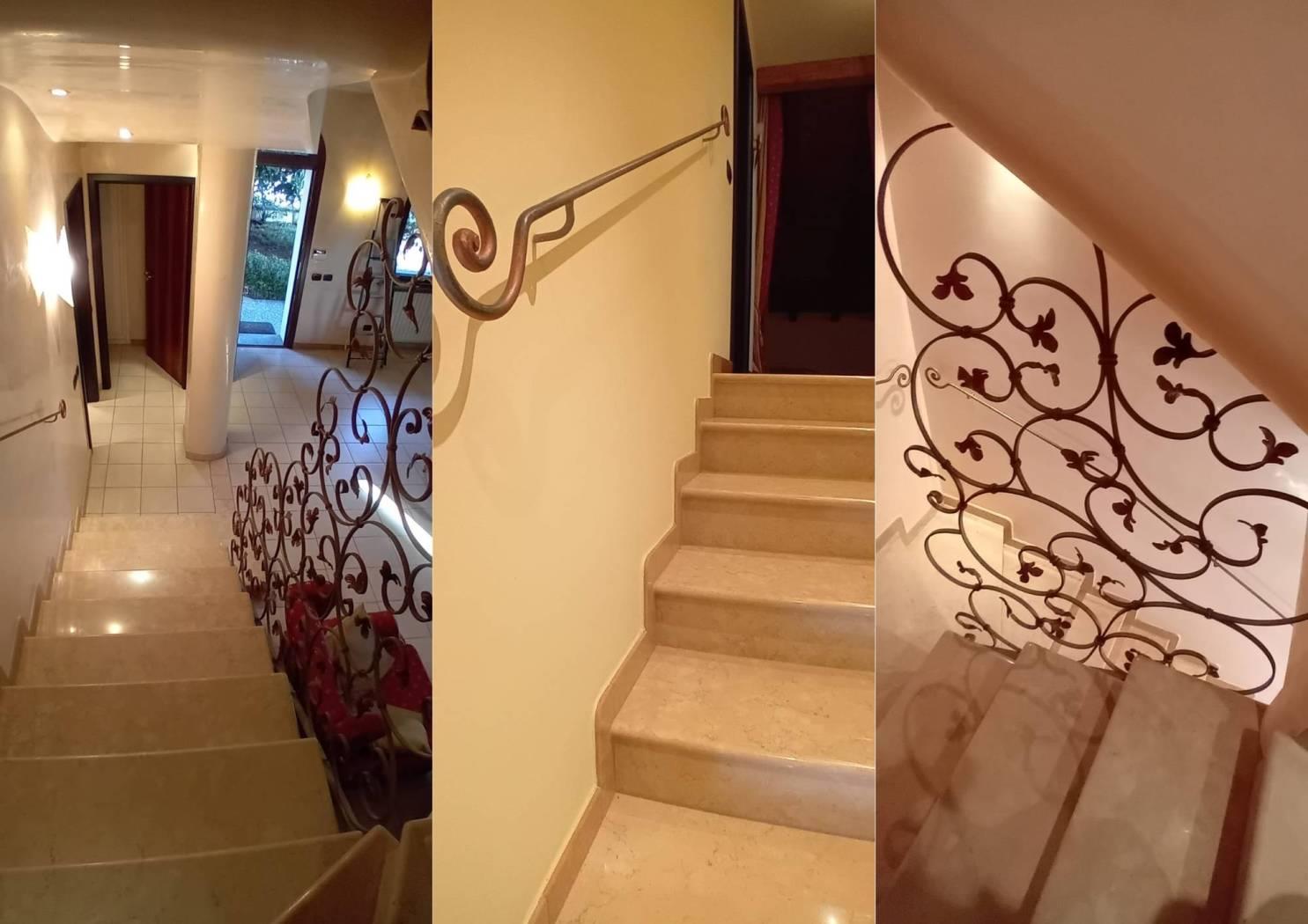 Il portico anticipa l’ingresso principale collegato direttamente con il soggiorno, ambiente principale dell’abitazione, di generose dimensioni dove poter ricavare la zona pranzo e la zona relax in direzione della parete audio/video. Sul fondo si nota il camino impreziosito dalla raffinata bordatura in marmo. Le finestre affacciano sulla proprietà donando luminosità all’ambiente. La cucina è abitabile anch’essa di generosa metratura permette di poter inserire al suo interno il secondo tavolo da pranzo. Nell’angolo, la porta finestra consente l’acceso alla zona esterna più appartata della proprietà, un patio ideale per le cene all’aria aperta e i momenti conviviali in compagnia. Il bagno della zona giorno completa il piano. I piani superiori, collegati dalla scenografica scala in marmo aperta sul soggiorno, sono dedicati alla zona notte. Il piano primo presenta la camera patronale, grande, con accesso al profondo e coperto terrazzo esposto a sud che collega anche gli altri ambienti del piano. La seconda camera e il bagno completano la prima zona notte.